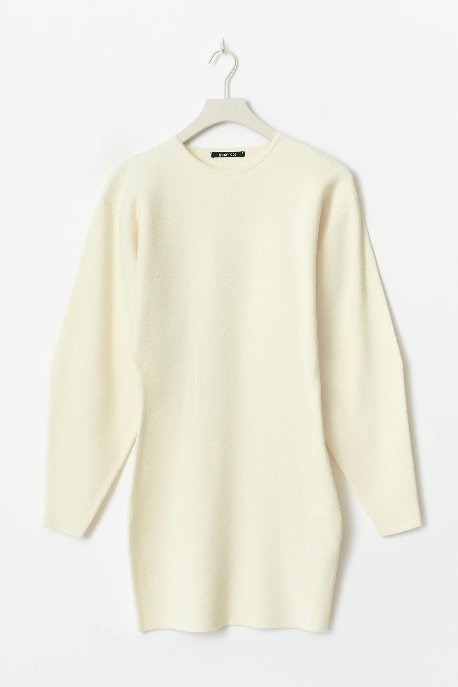 Figursydd stickad klänning med intagen midja. Klänningen är vit och har långa ärmar. Den har mjuk, stickad kvalitet, figurnära passform, rund halsringning och kort längd.