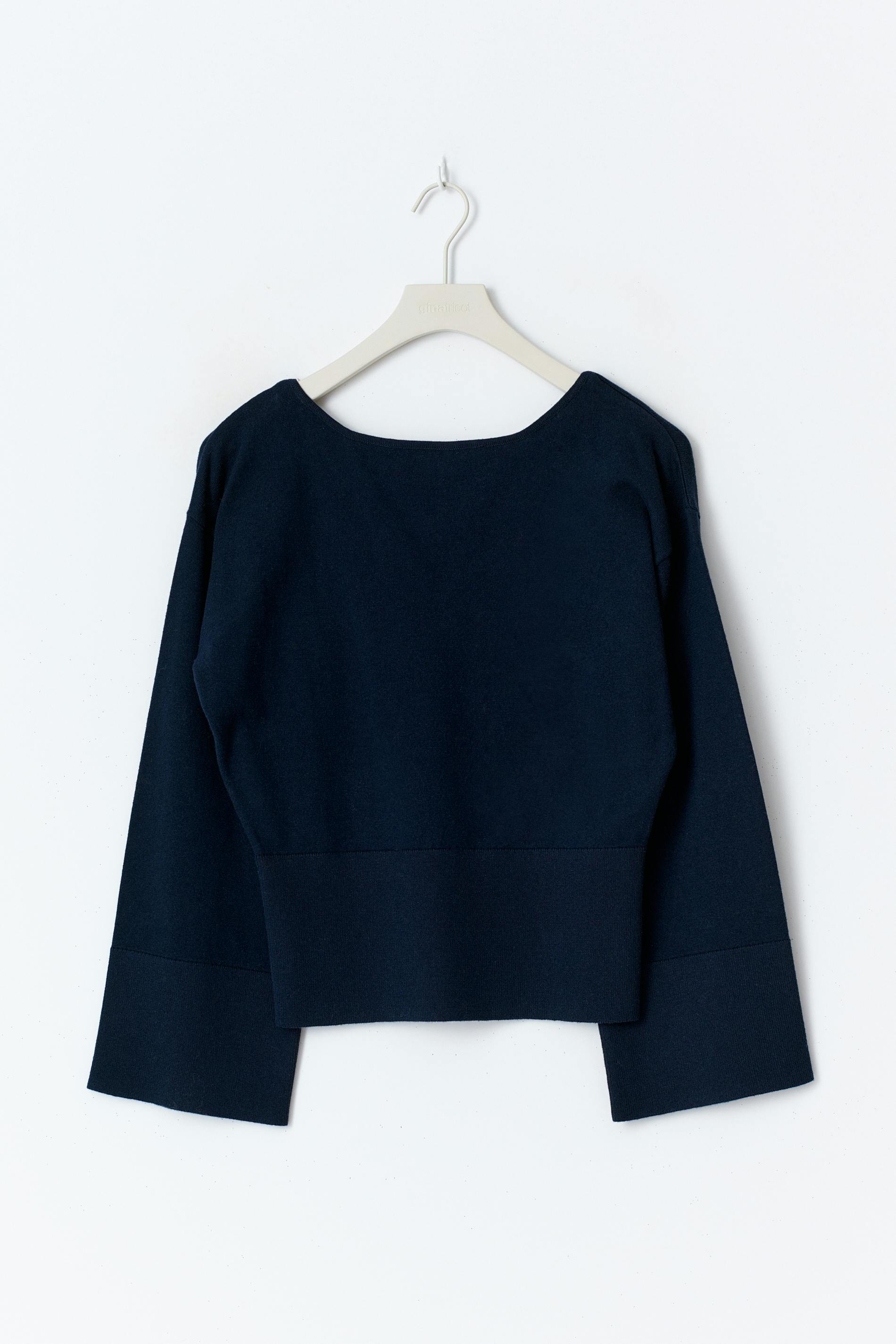 Stickad tröja med djup rygg. Tröjan är marinblå och har figurnära midja. Den har hög halsringning, långa, vida ärmar, ribbstickad nederkant och normal passform.