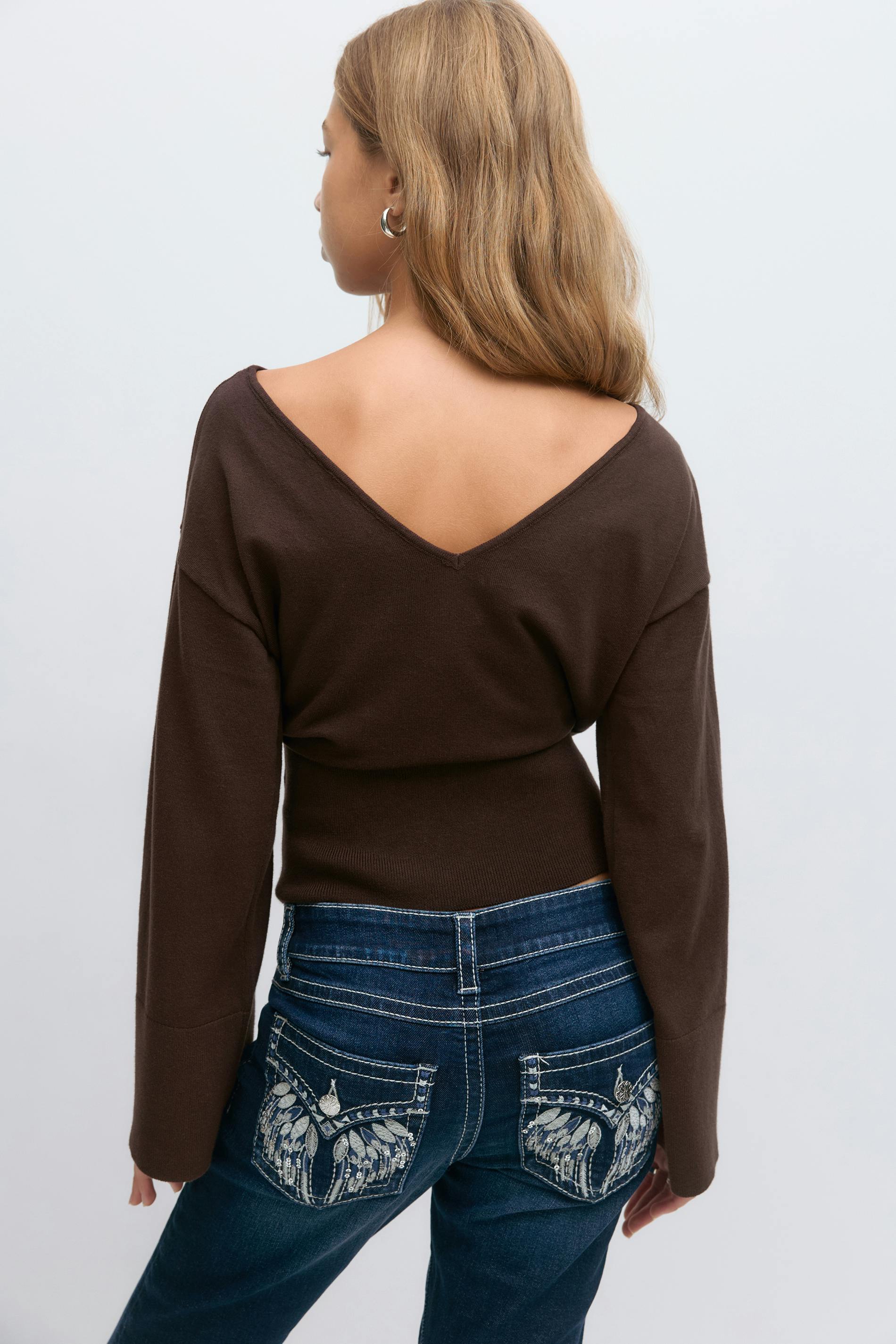 Stickad tröja med djup rygg. Tröjan är brun och har figurnära midja. Den har hög halsringning, långa, vida ärmar, ribbstickad nederkant och normal passform.