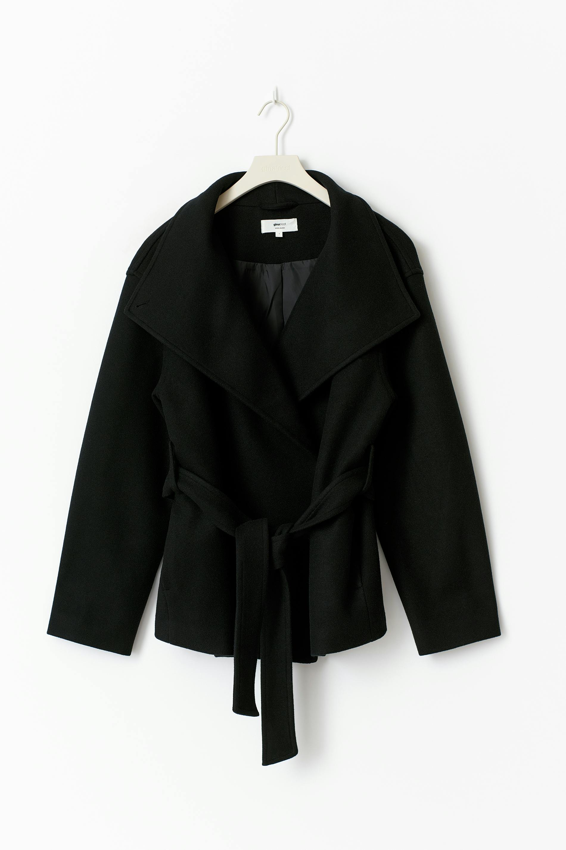 Kort jacka med knytbälte i midjan. Jackan är svart och har hög krage. Den har knäppen fram, fickor i sidorna och normal passform.