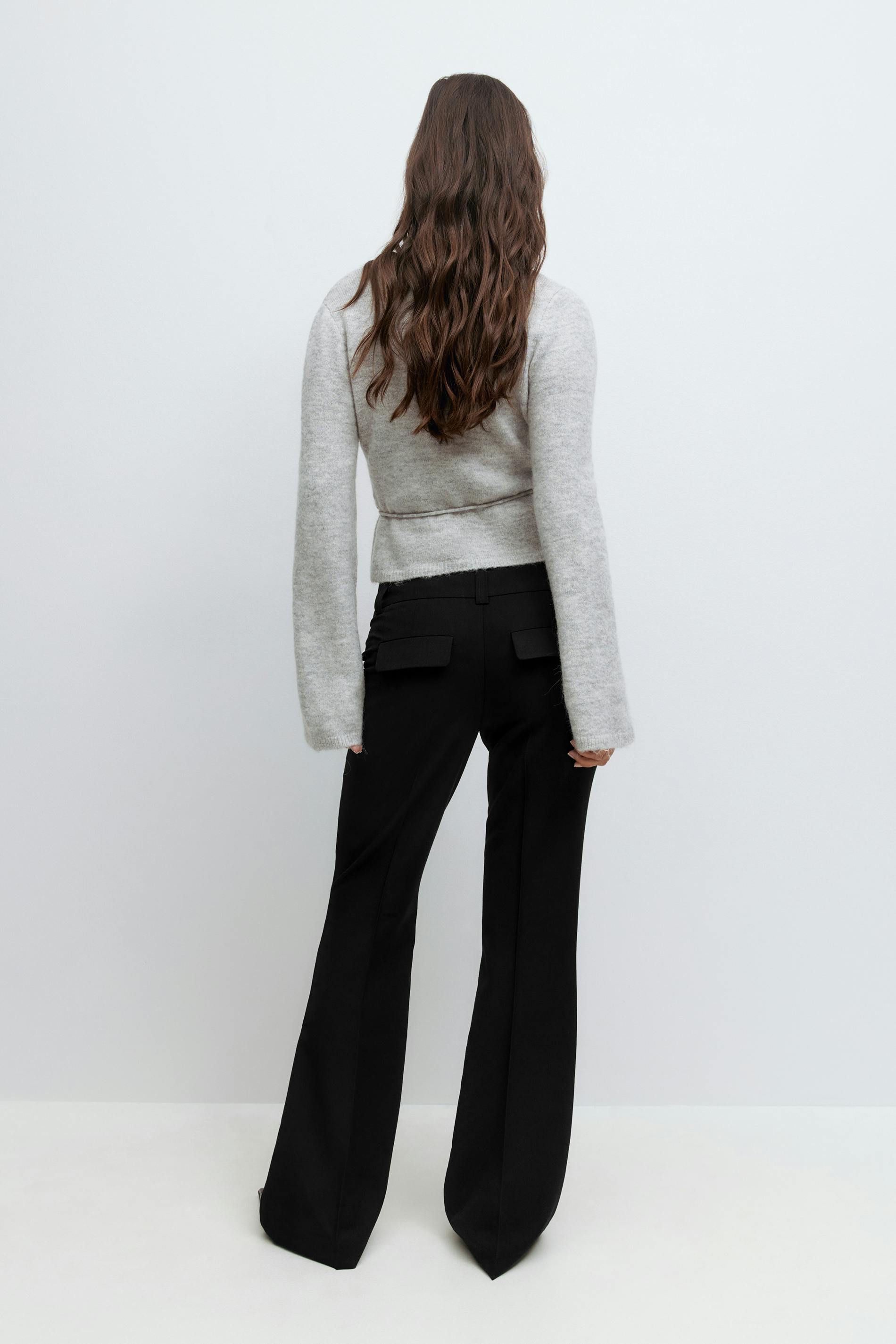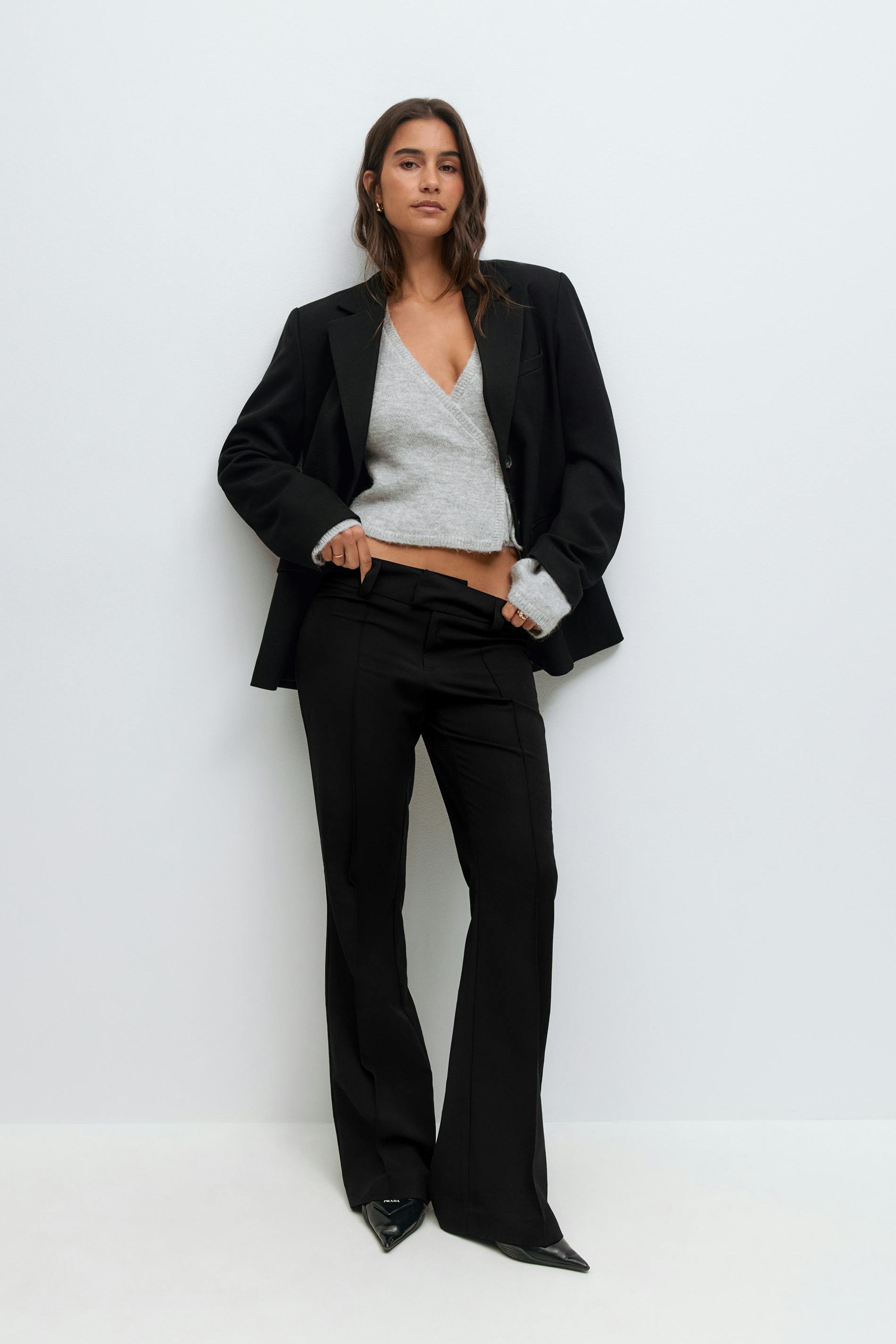 Lågmidjade kostymbyxor med utsvängda ben. Byxorna är svarta och har en ficka med lock bak. De har en dekorativ söm ner längs framsidan och en figurnära passform.
