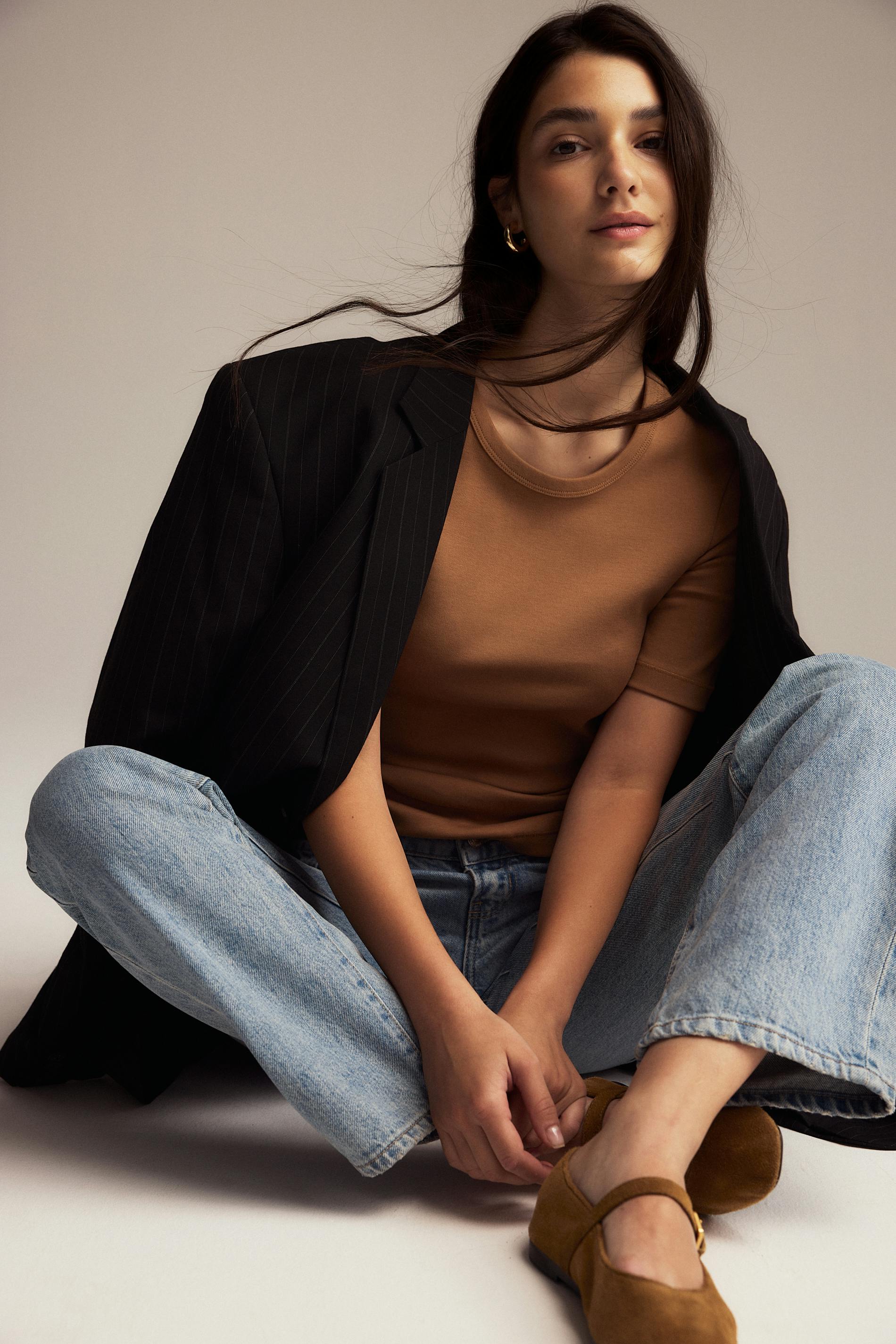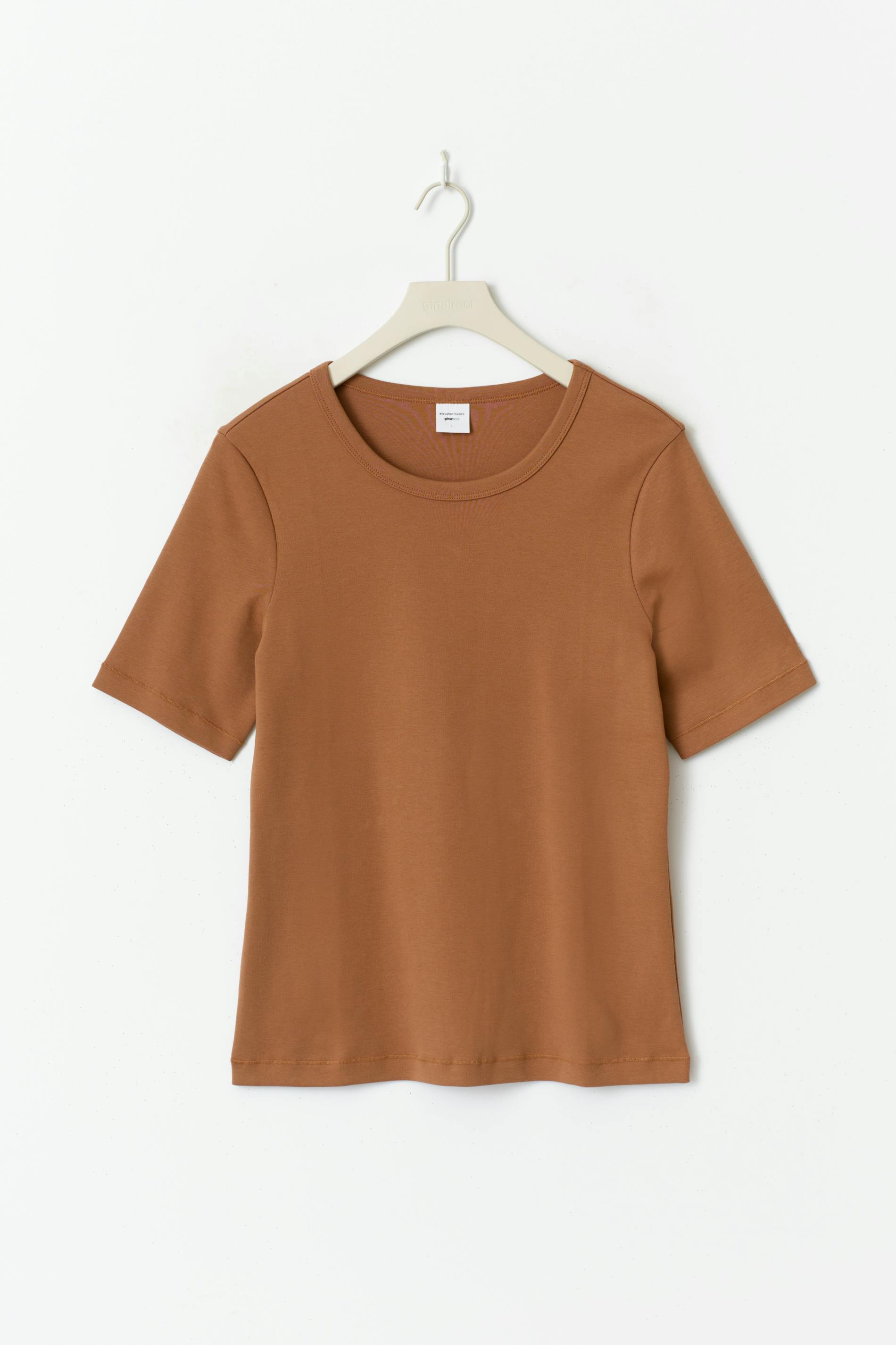 Tight t-shirt with short sleeves. The t-shirt is brown and has round neckline. It has figure-hugging fit and cropped length.