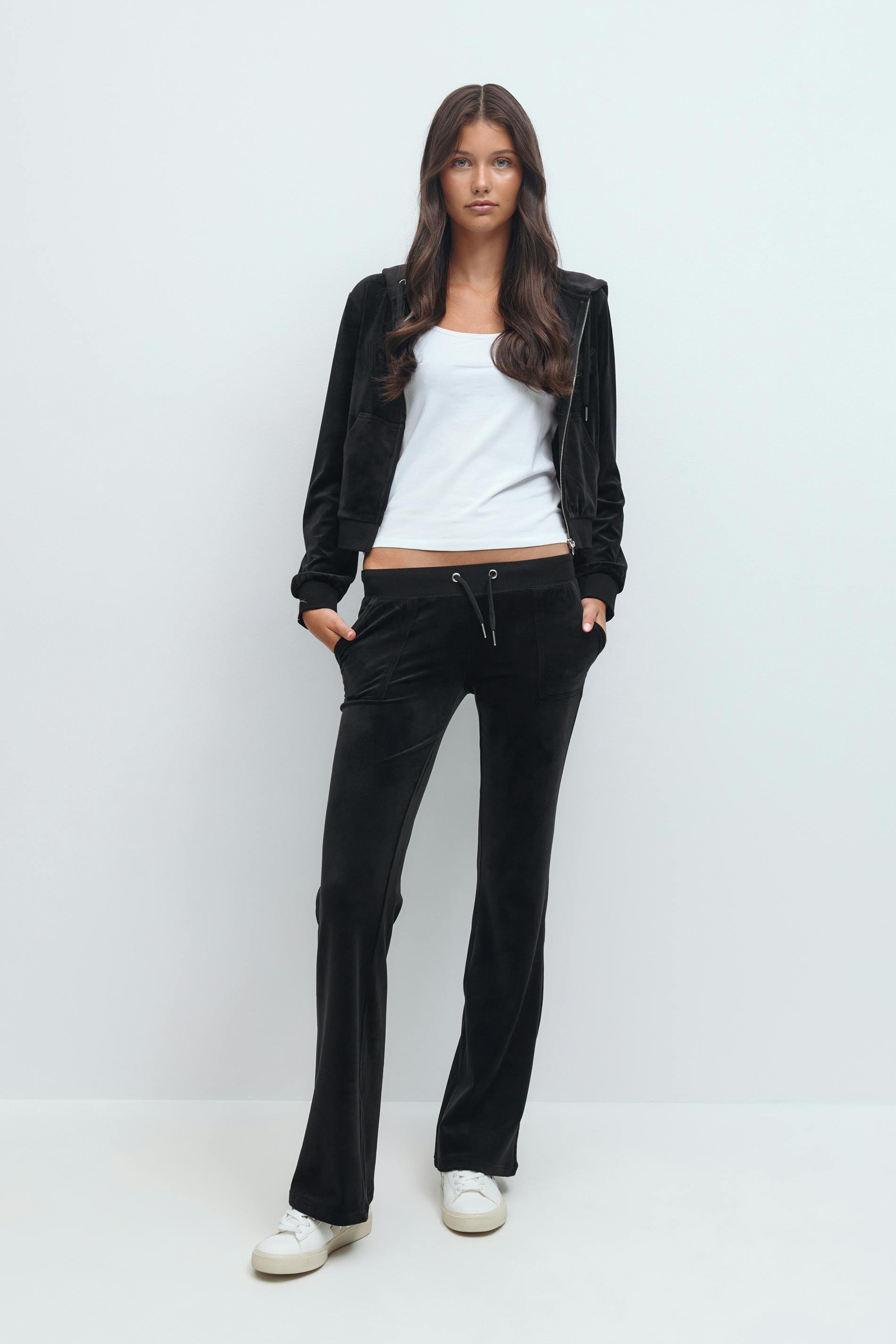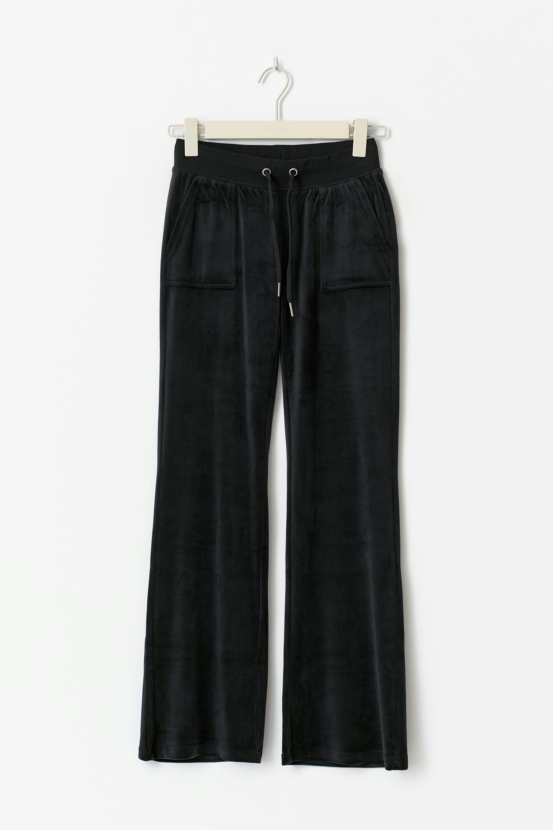 Mysbyxor i velour med en låg midja. Byxan är svart och har raka ben. Den har ett elastiskt midjeband i ribbad kvalitet med ett knytband i midjan och fickor fram och bak.
