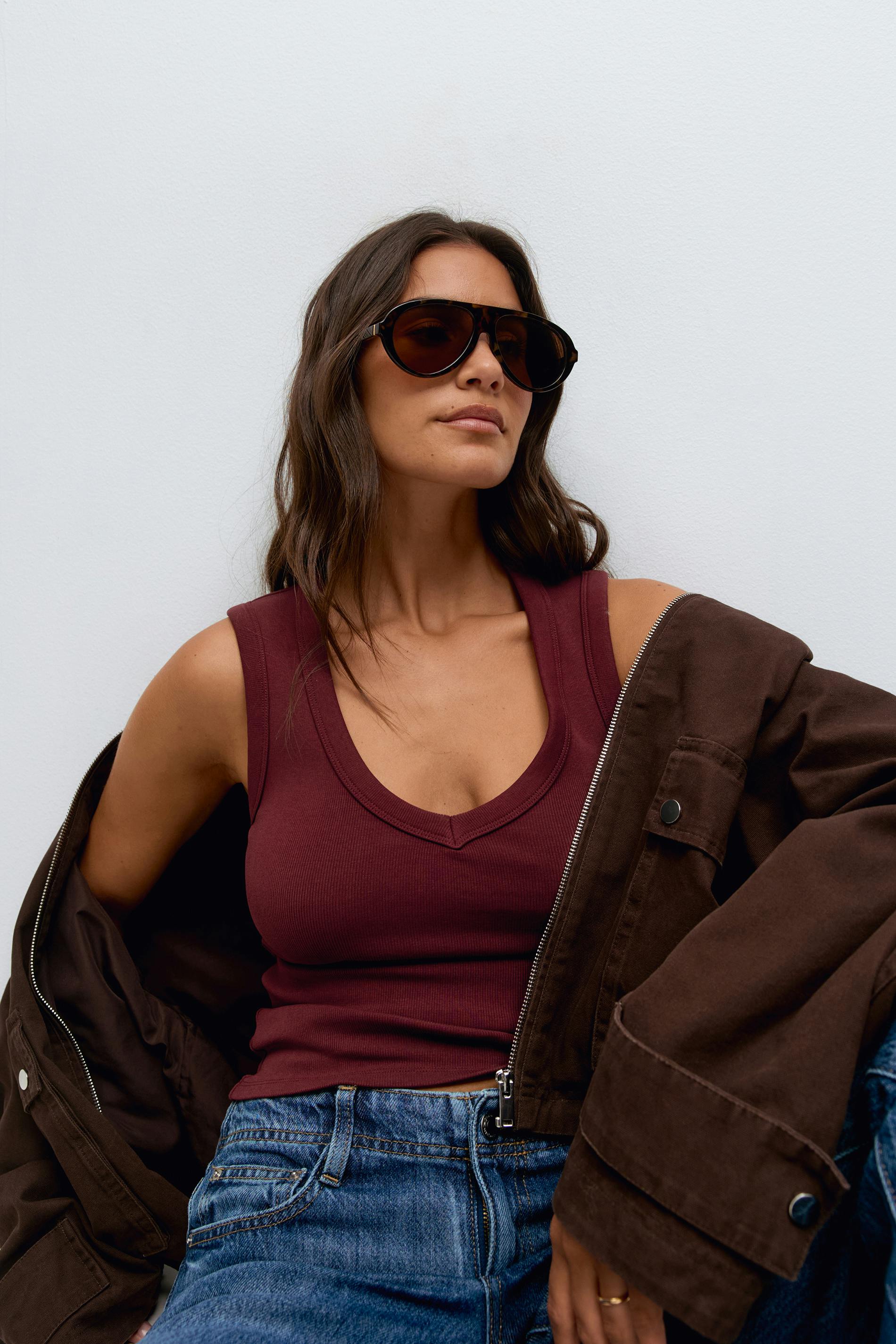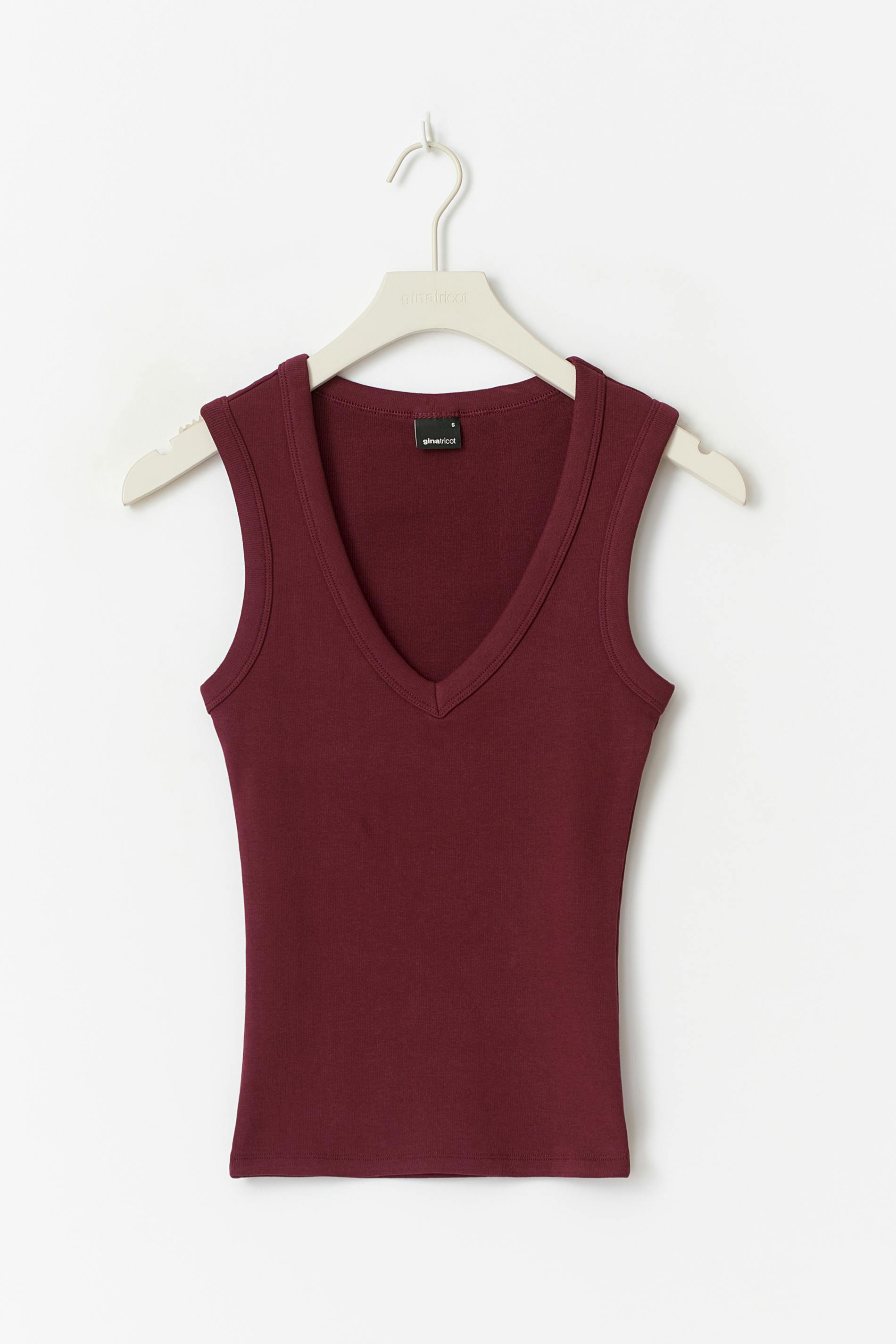 Ribbat linne med v-ringning. Linnet är vinrött och har figurnära passform. Det har ärmlös design och kort längd.