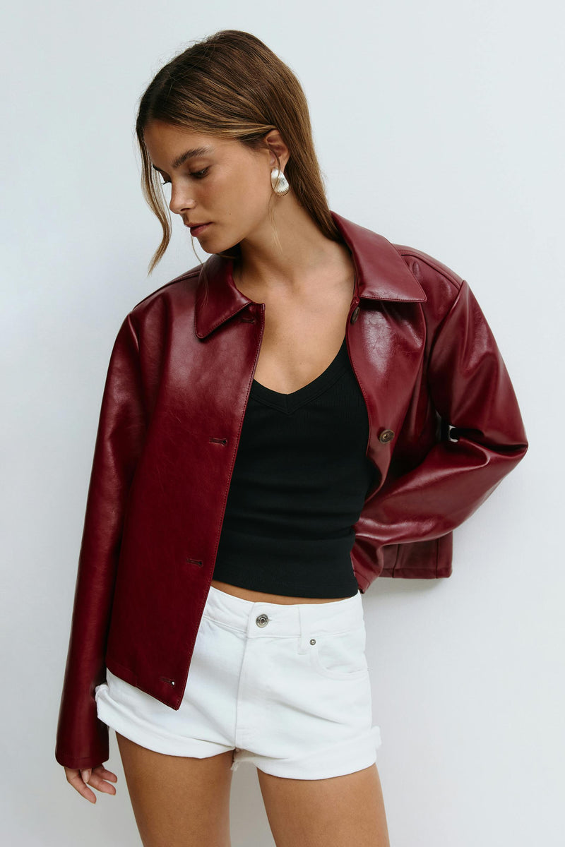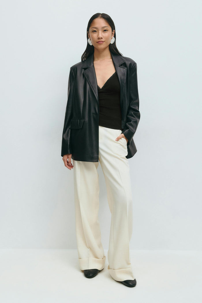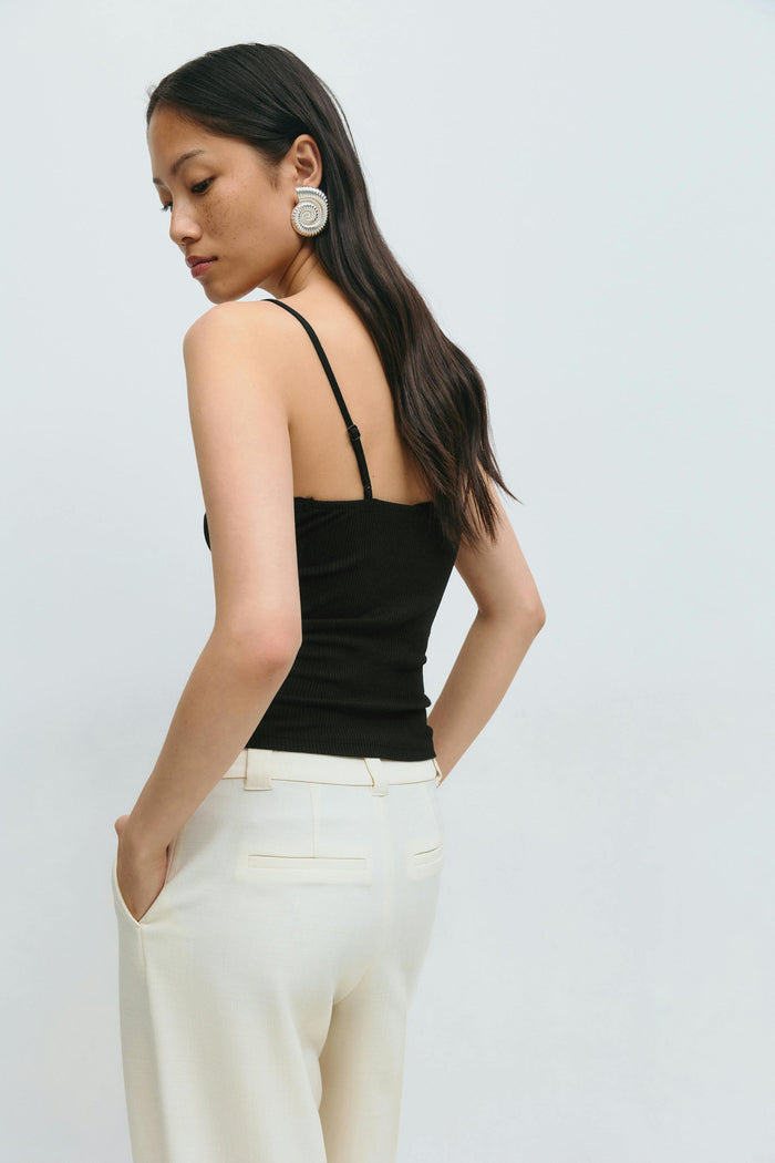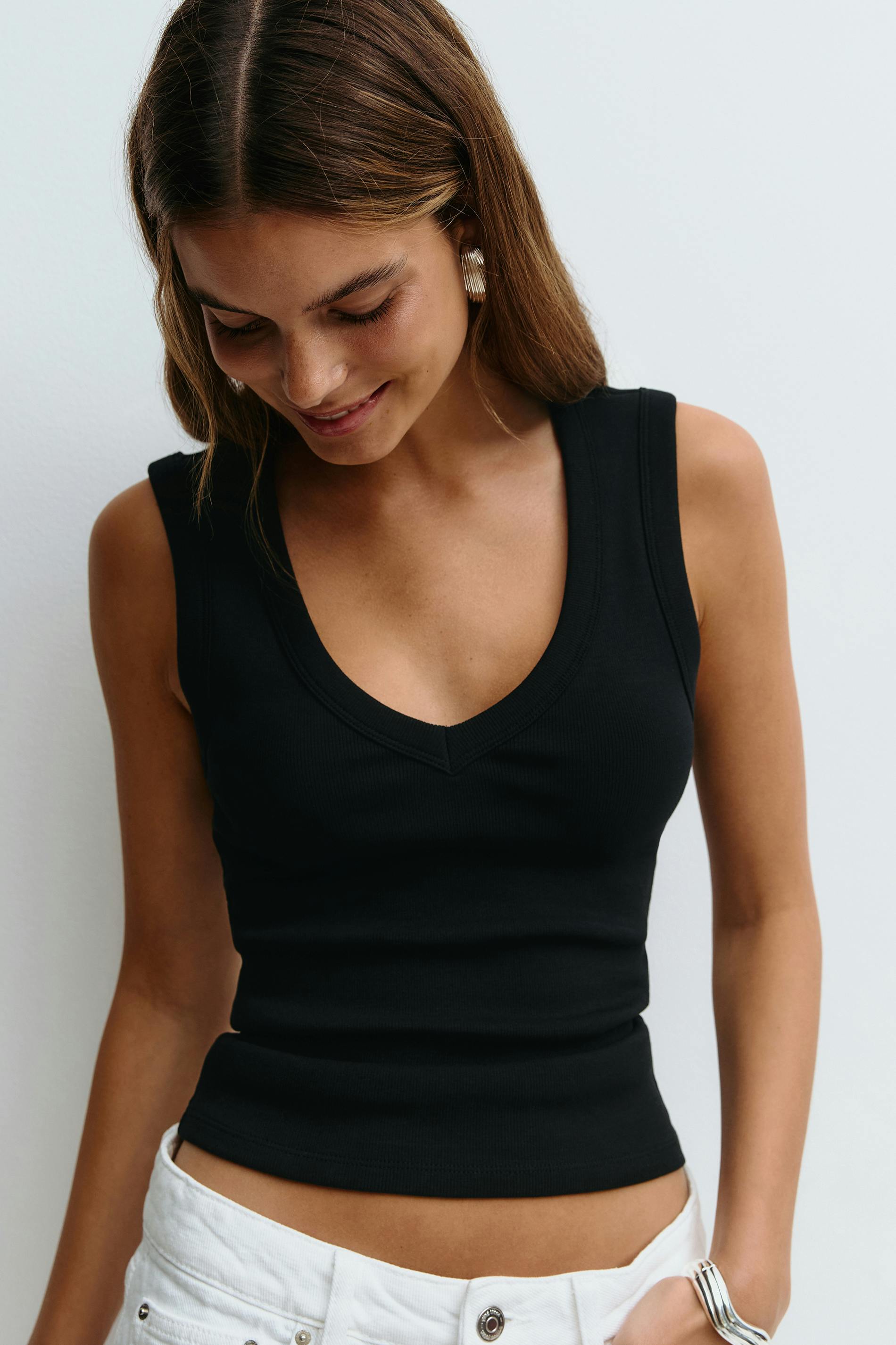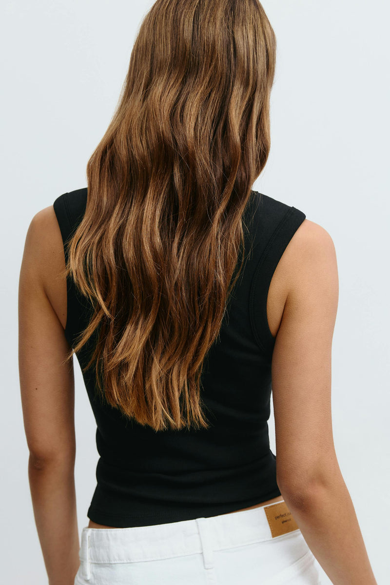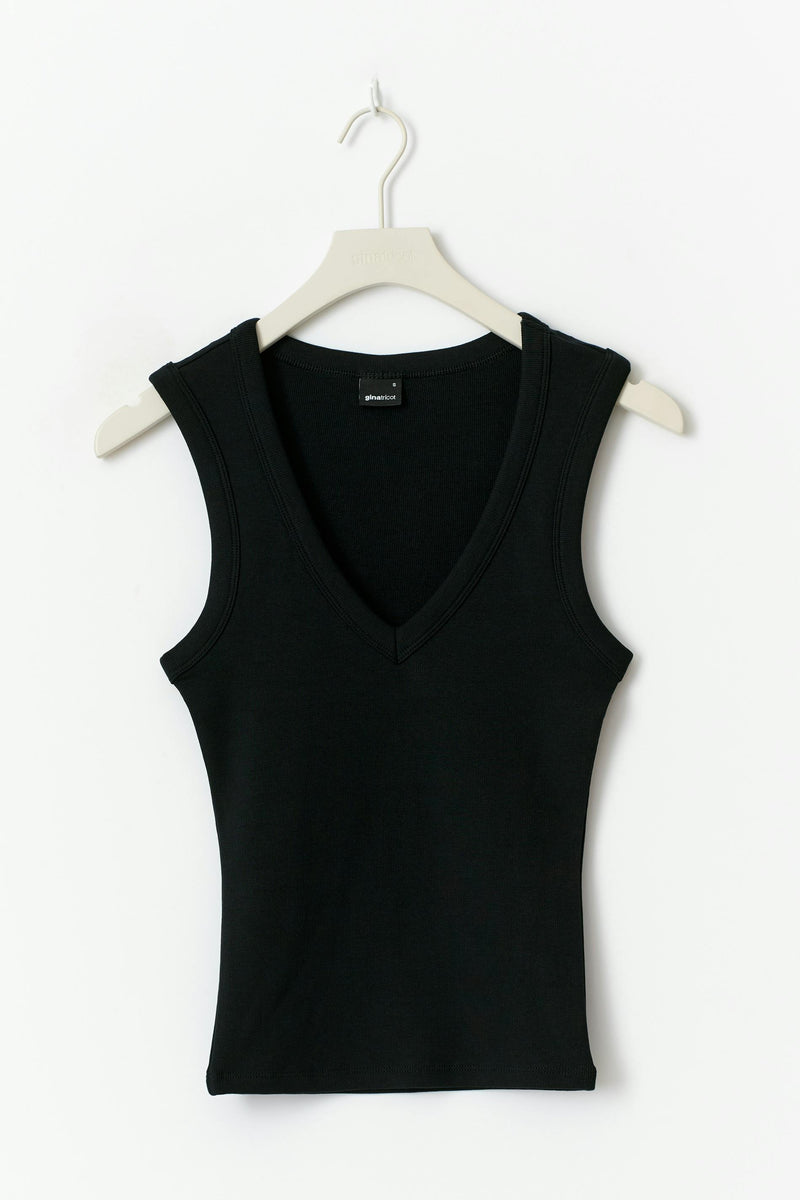 Ribbed tank with v-neck. The tank is black and has figure-hugging fit. It has sleeveless design and short length.