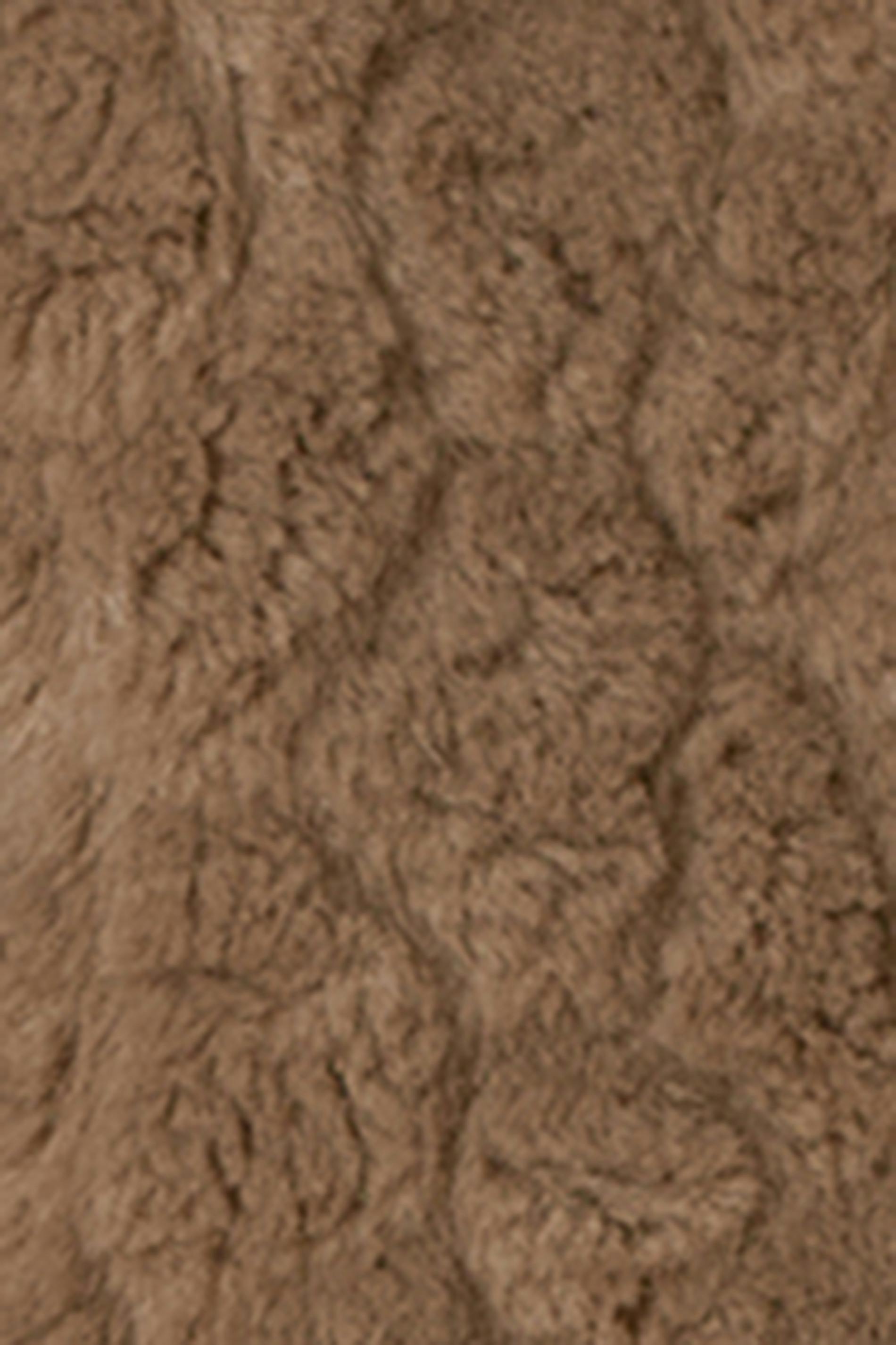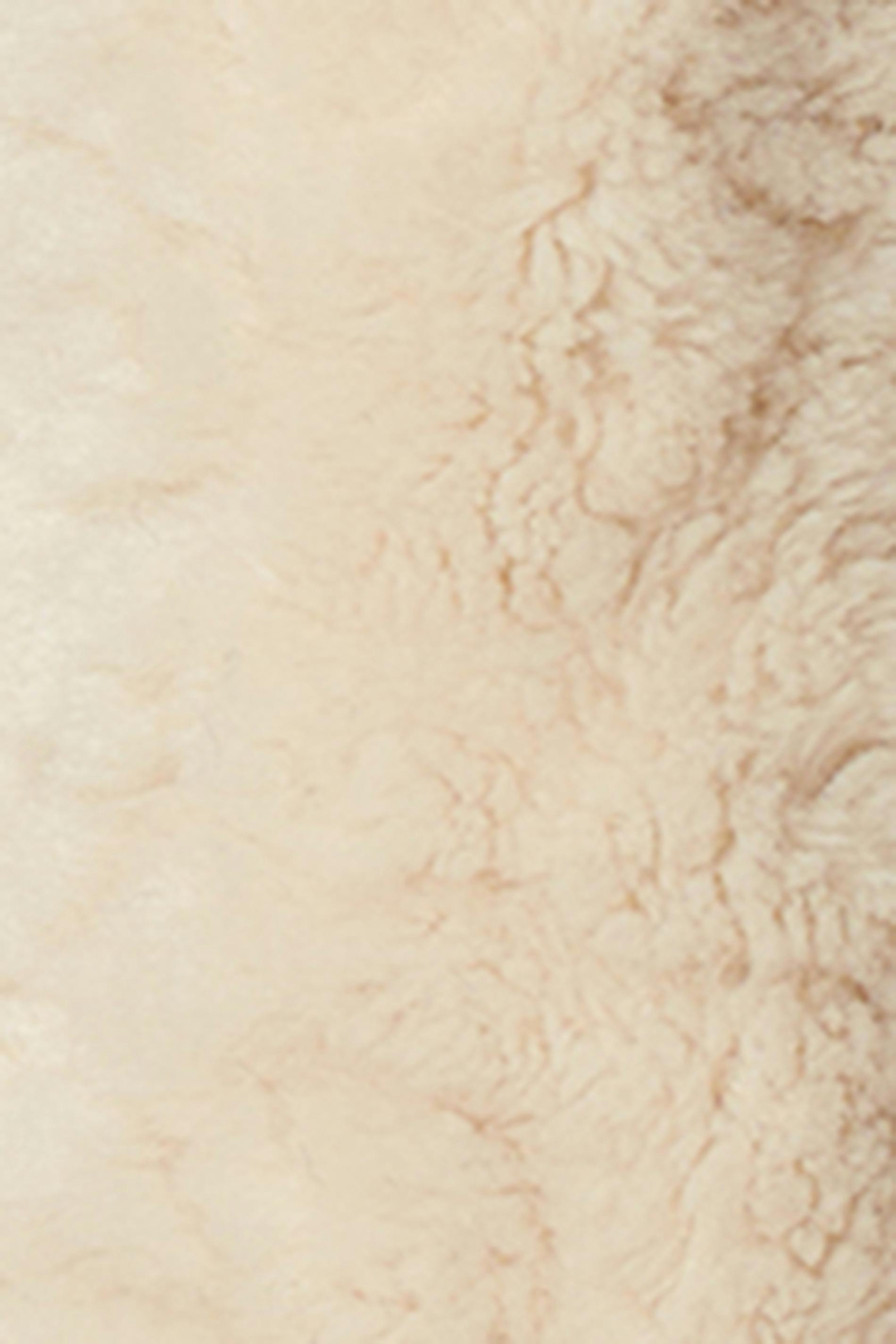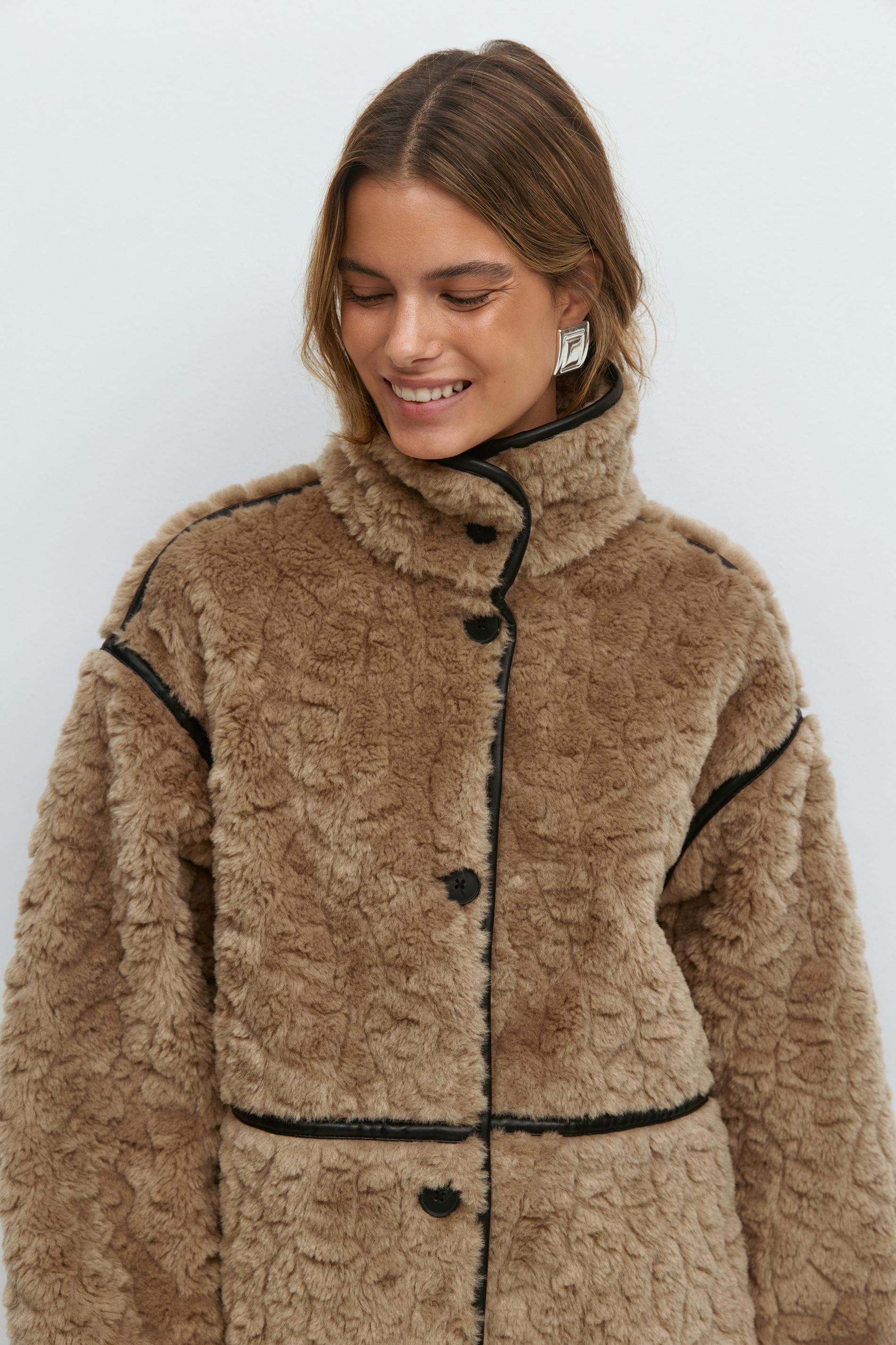 Lång teddyjacka i fuskpäls med hög krage. Teddyjackan är beige och har svarta kantband. Den har oversize fit, fickor i sidorna, knäppning fram, långa ärmar och lurvig kvalitet. Fodrad.