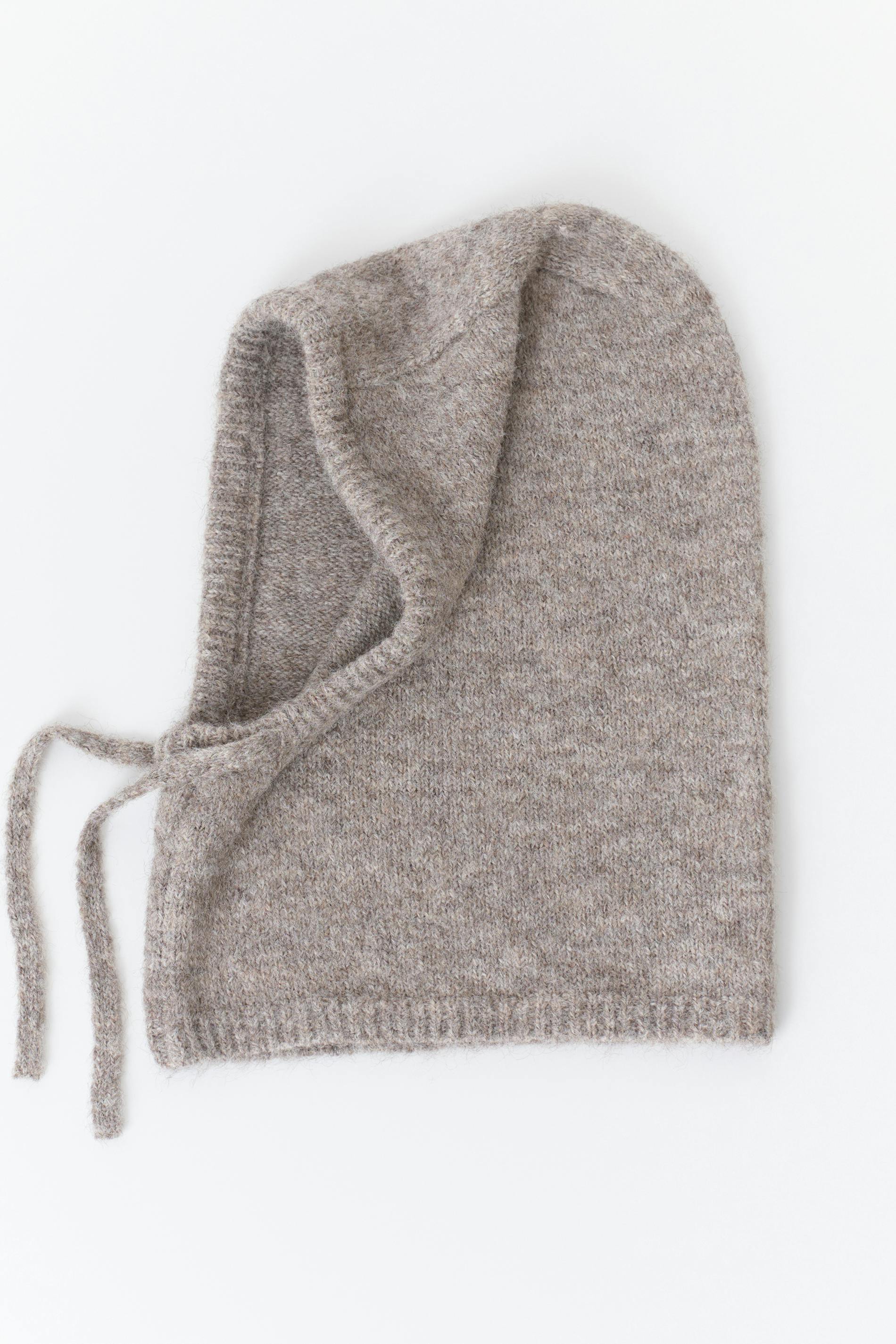 Stickad balaklava med knytsnören i sidorna. Balaklavan är beige och har ribbstickade kanter.