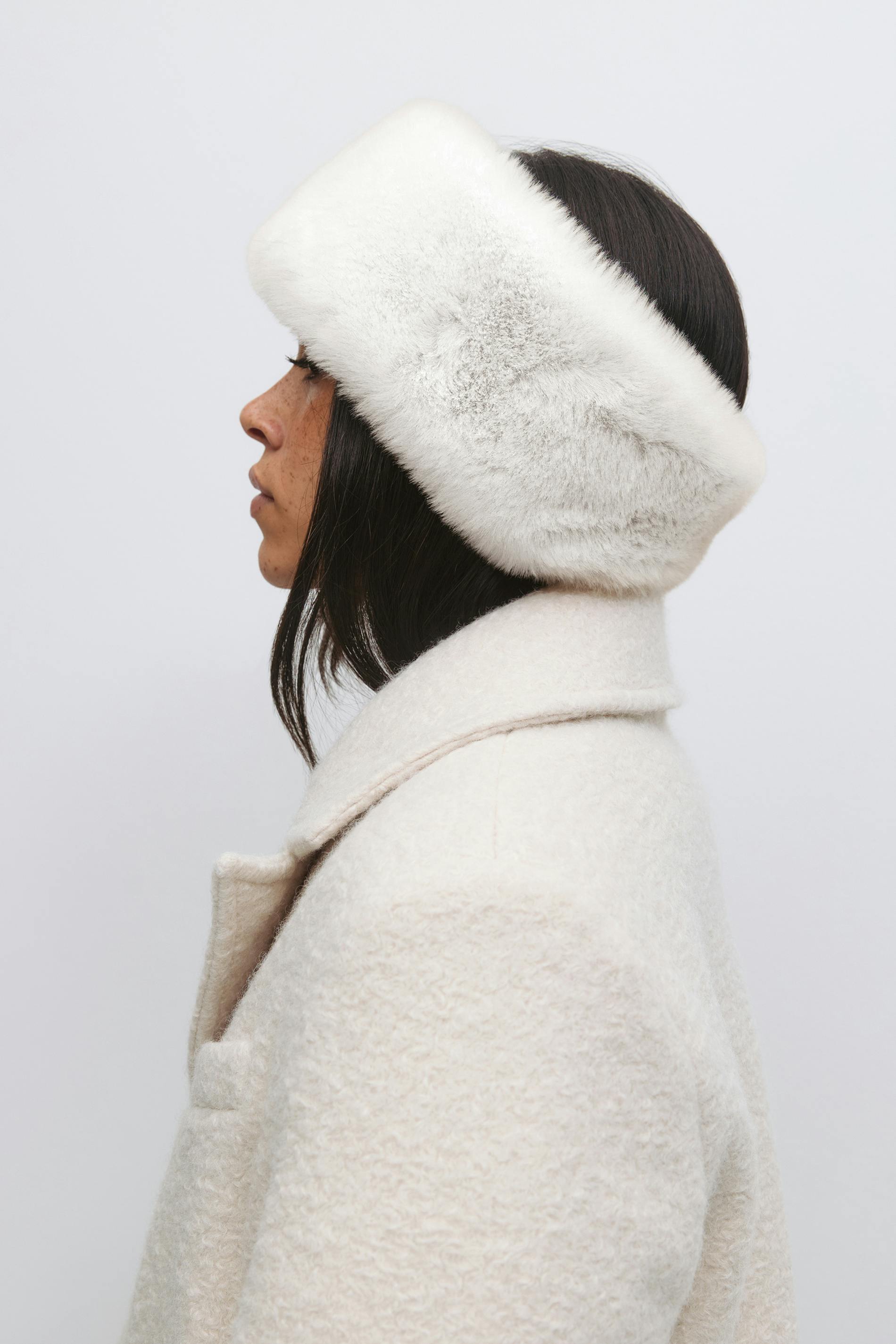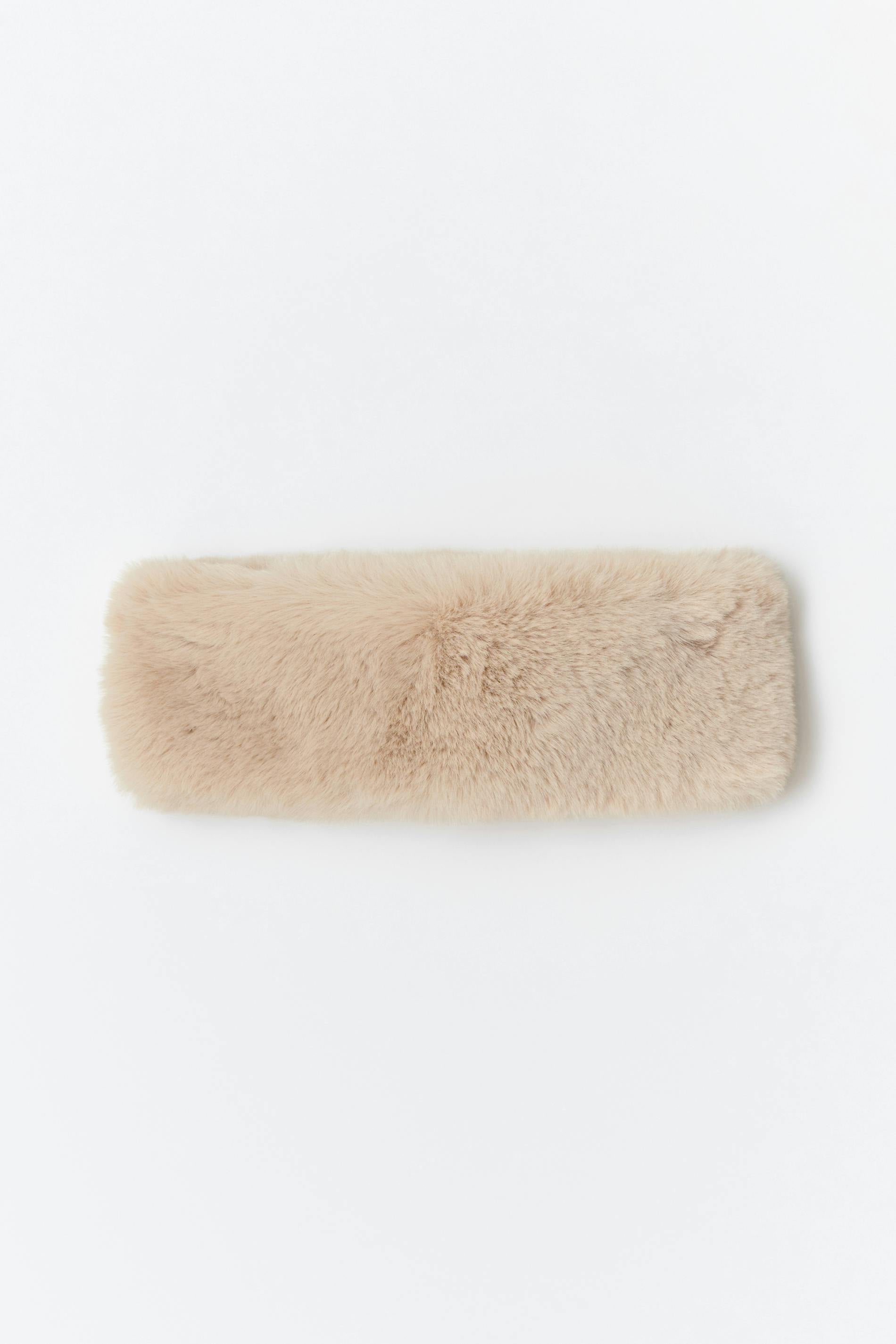 Brett pannband i fuskpäls med fluffig kvalitet. Accessoaren är krämfärgad.