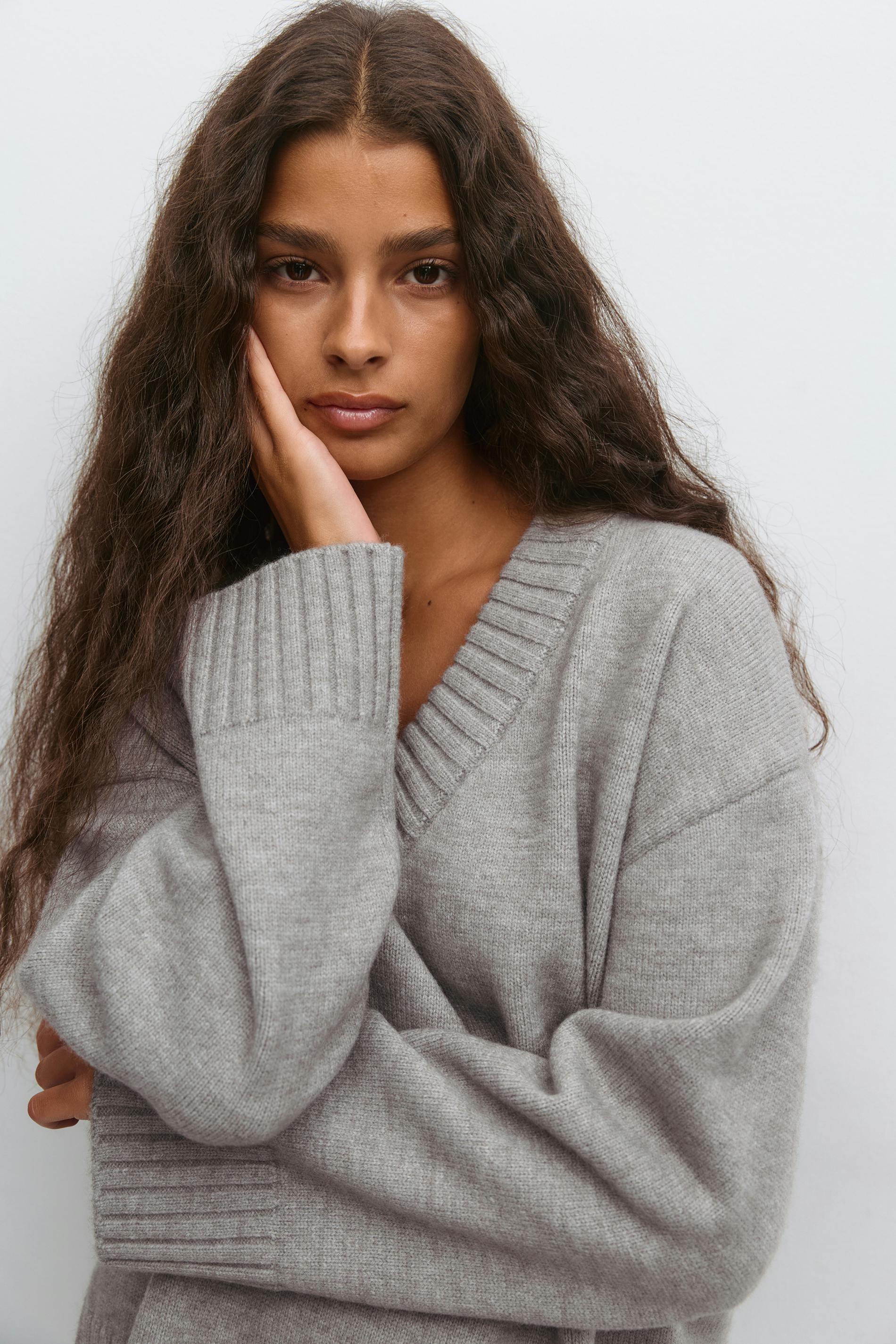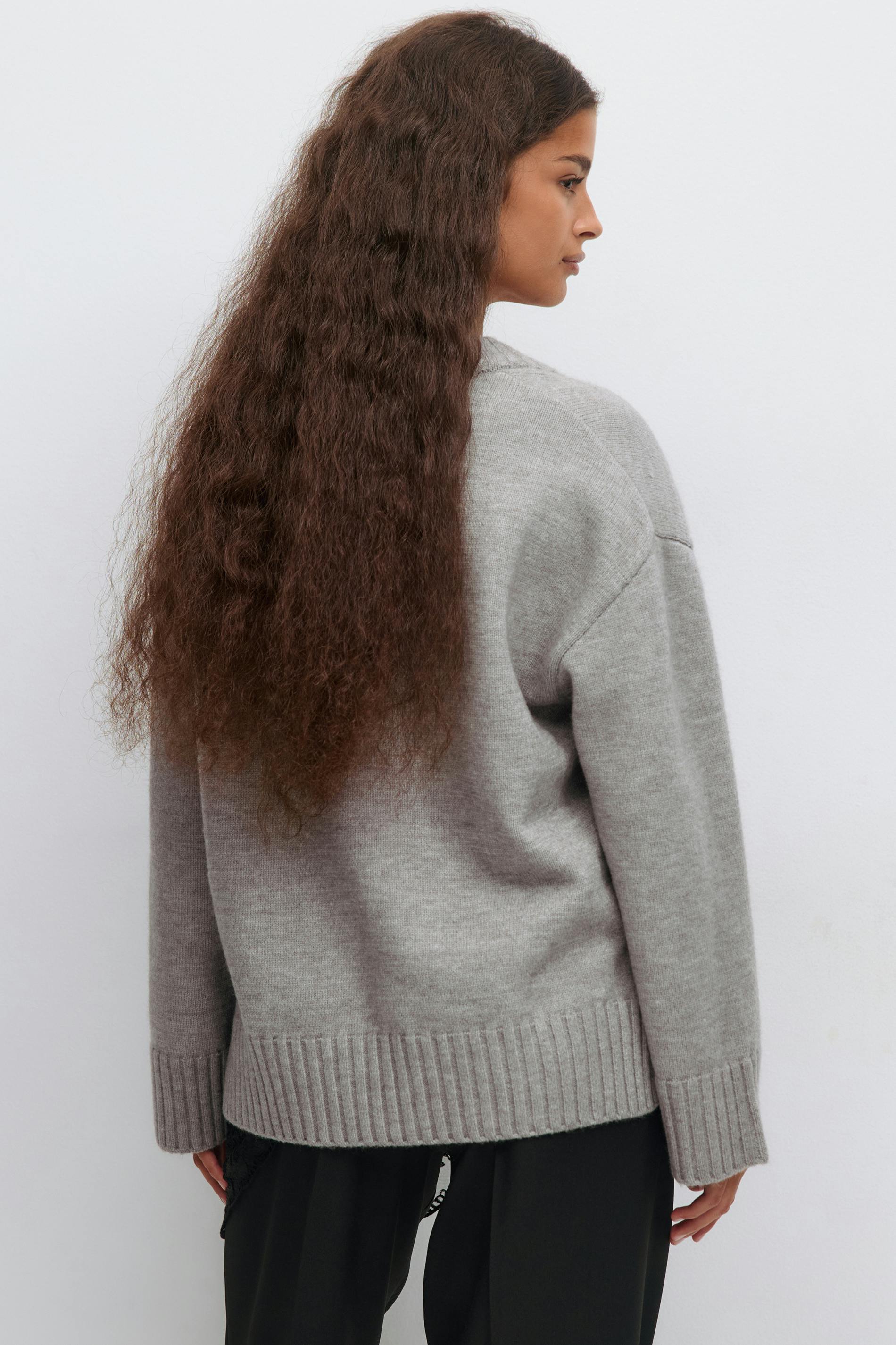 Stickad tröja med v-ringning. Tröjan är grå och har oversize fit. Den har långa ärmar, nedhasade axlar, slits i sidorna och ribbad mudd vid ärmslut och i nederkant.