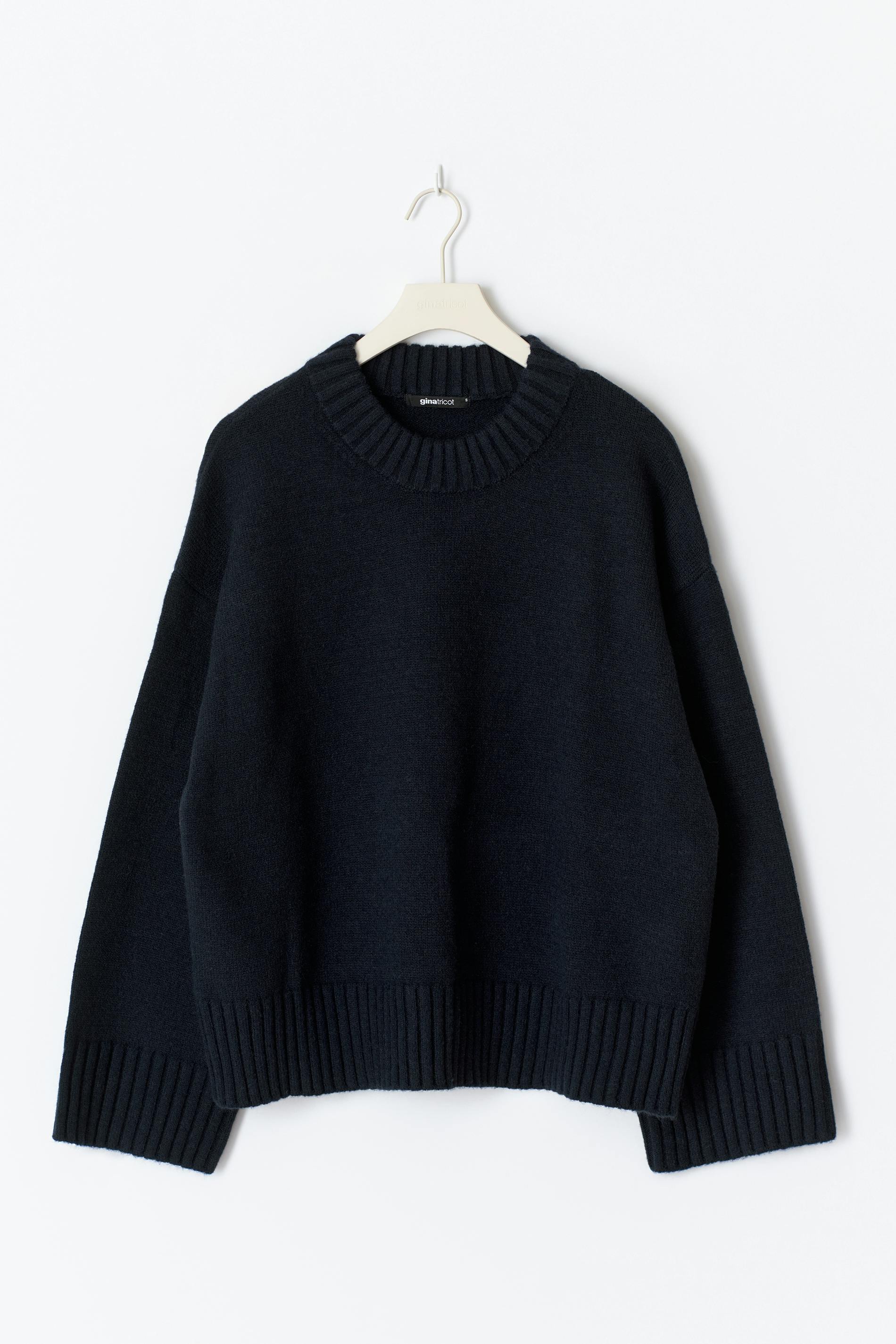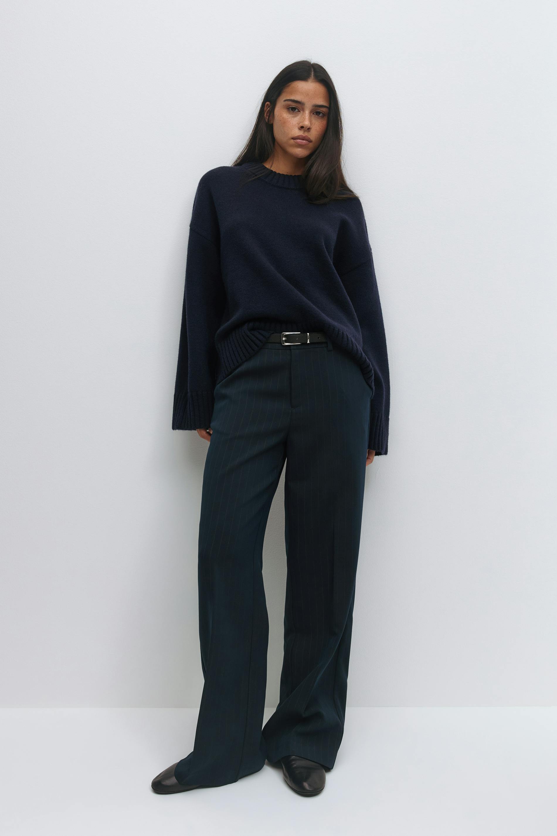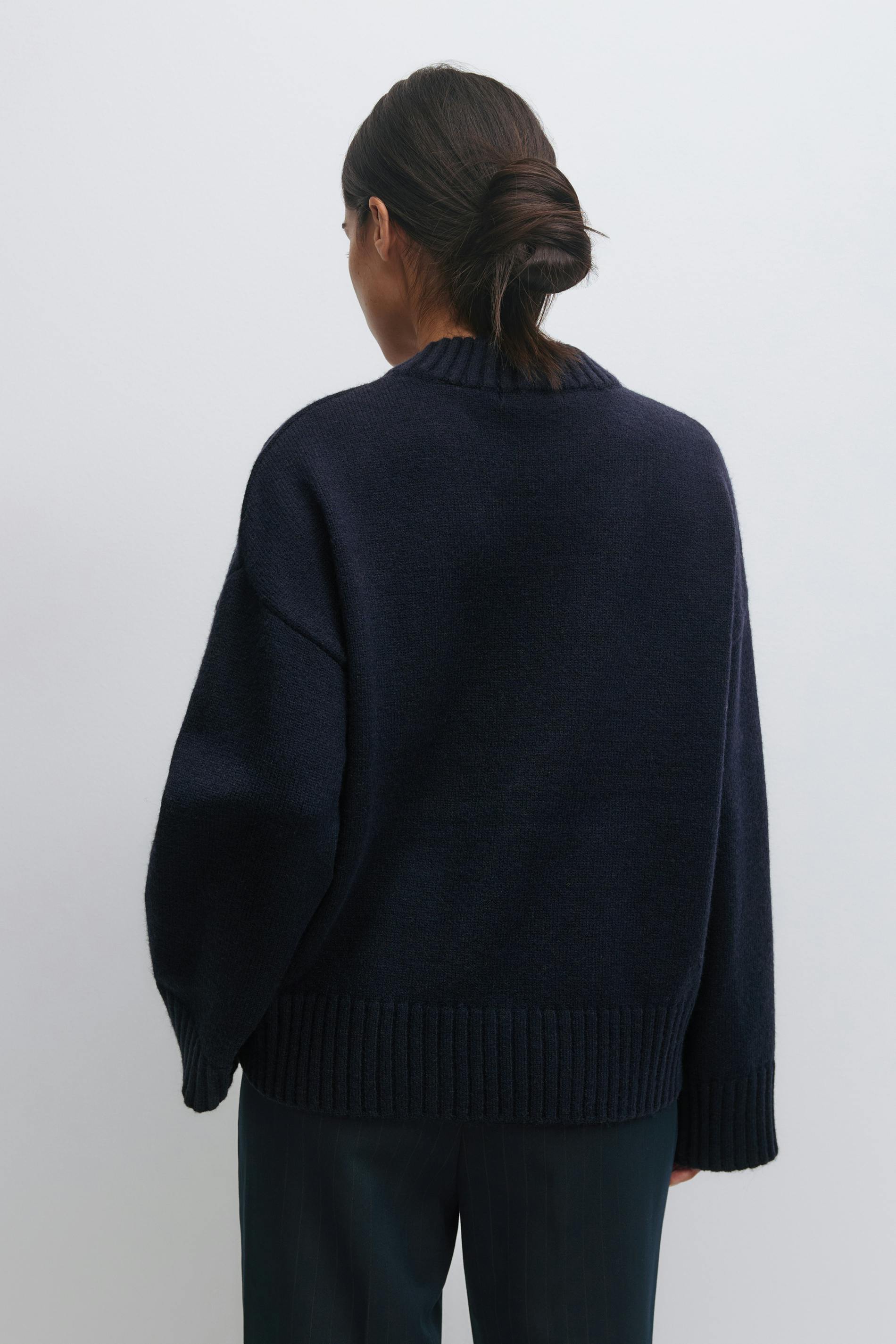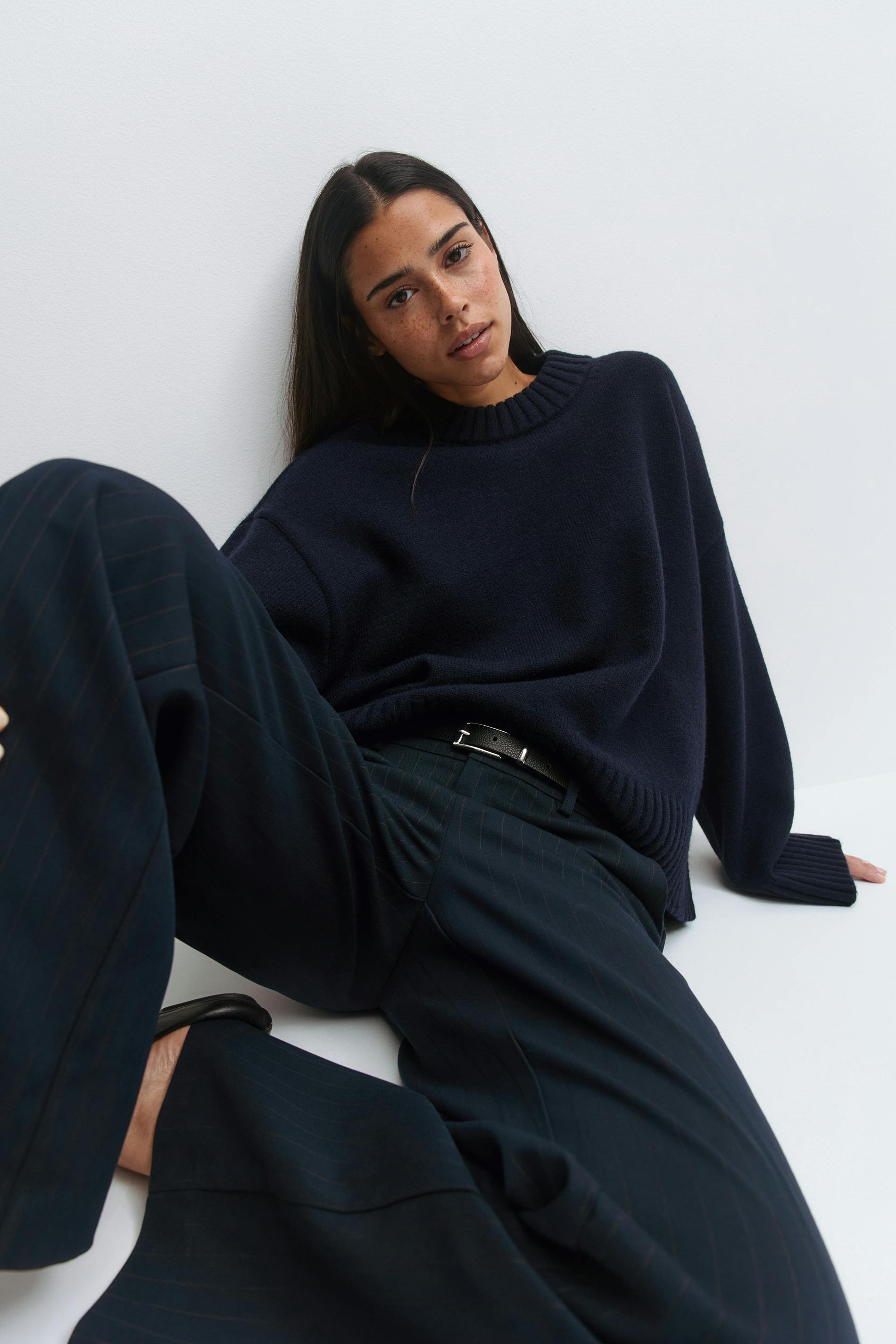 Stickad tröja med oversize fit. Tröjan är marinblå och har rund halsringning. Den har långa ärmar, nedhasade axlar och ribbstickning vid ärmslut och i nederkant.