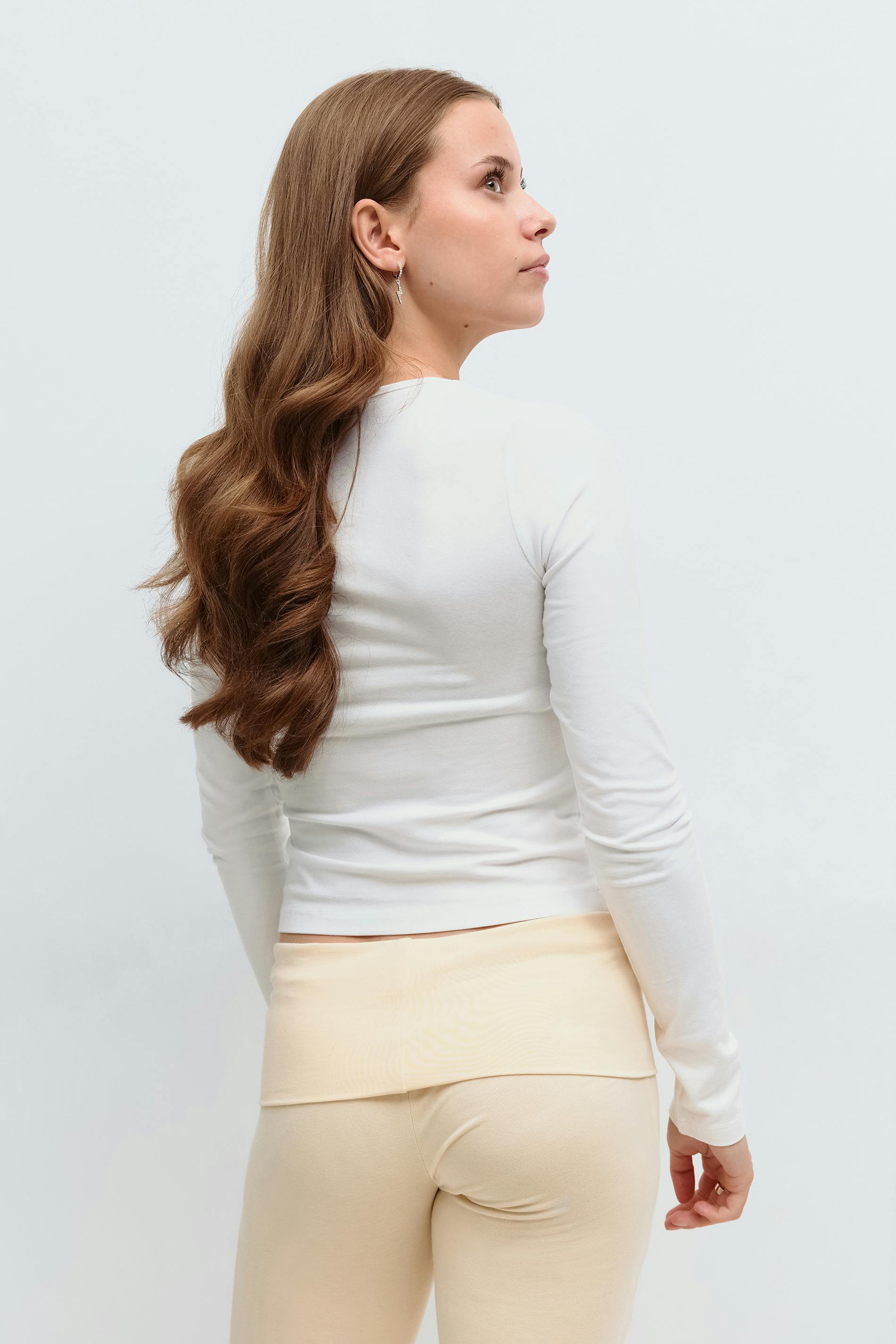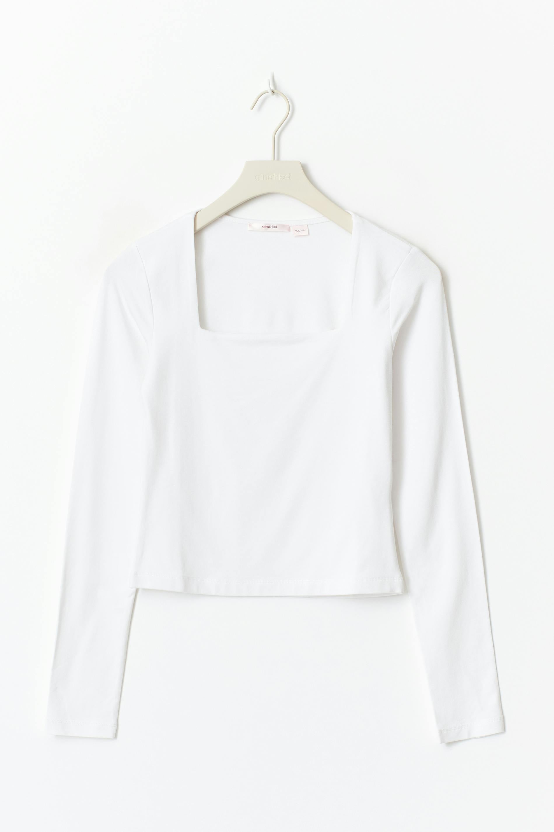 Long sleeve top with square neckline. The top is white and has cropped length. It has figure-hugging fit and stretchy material.