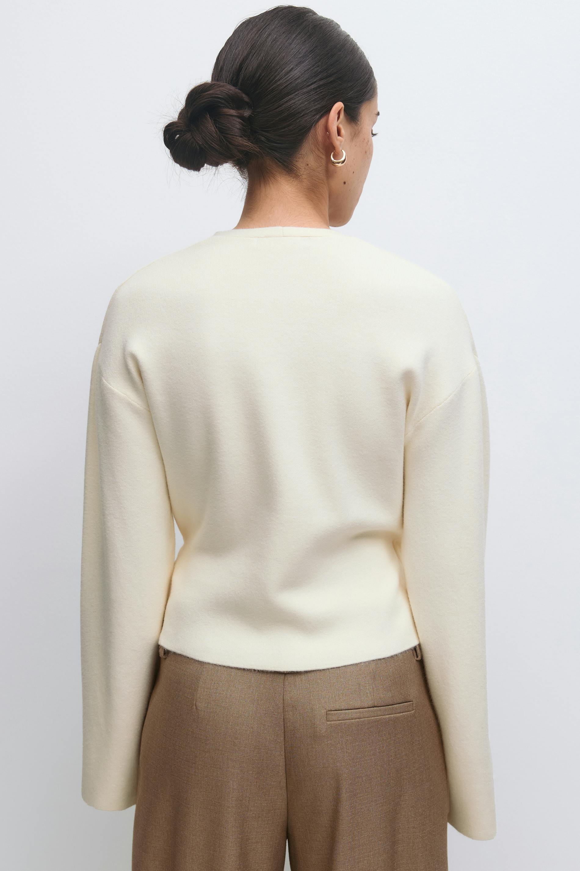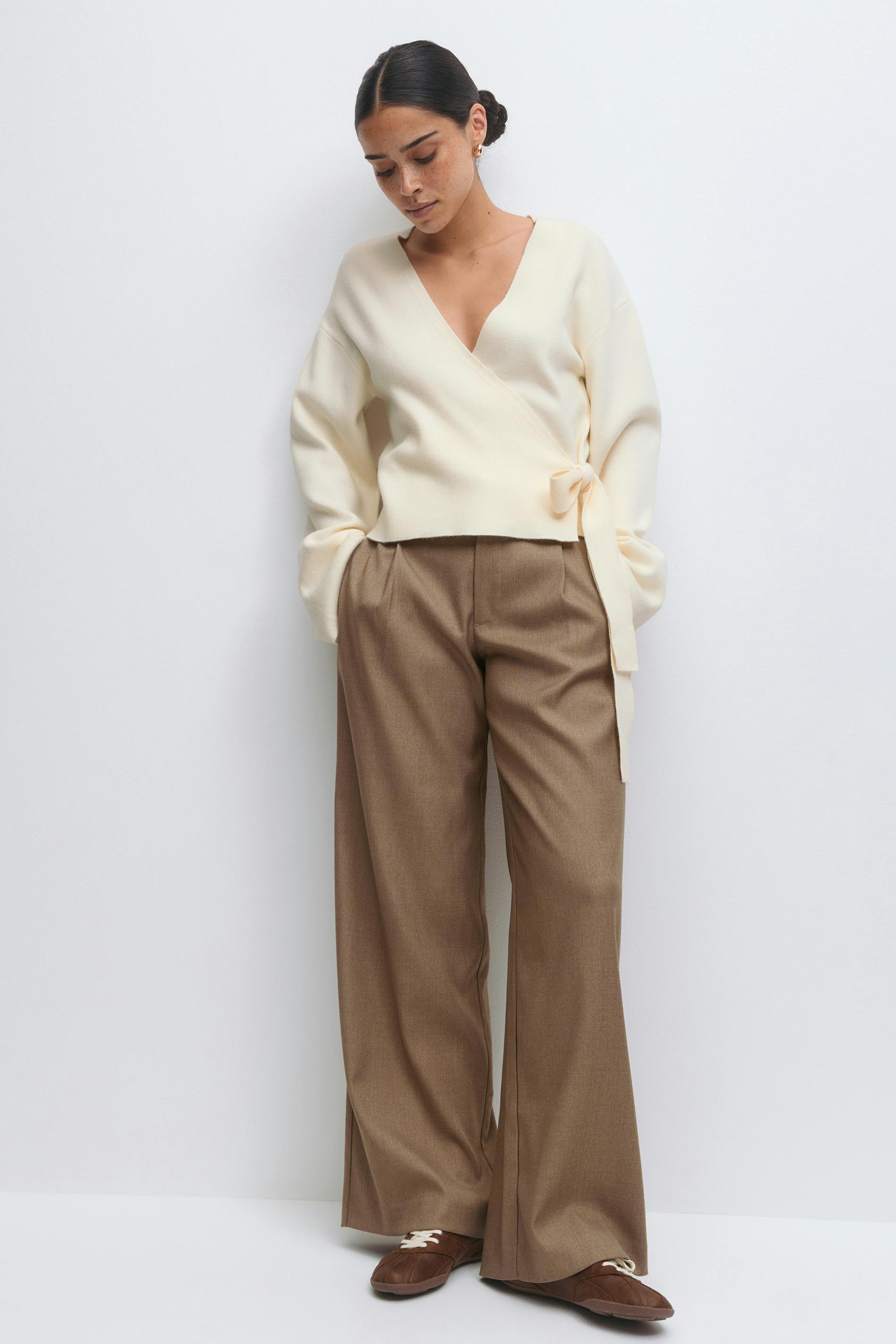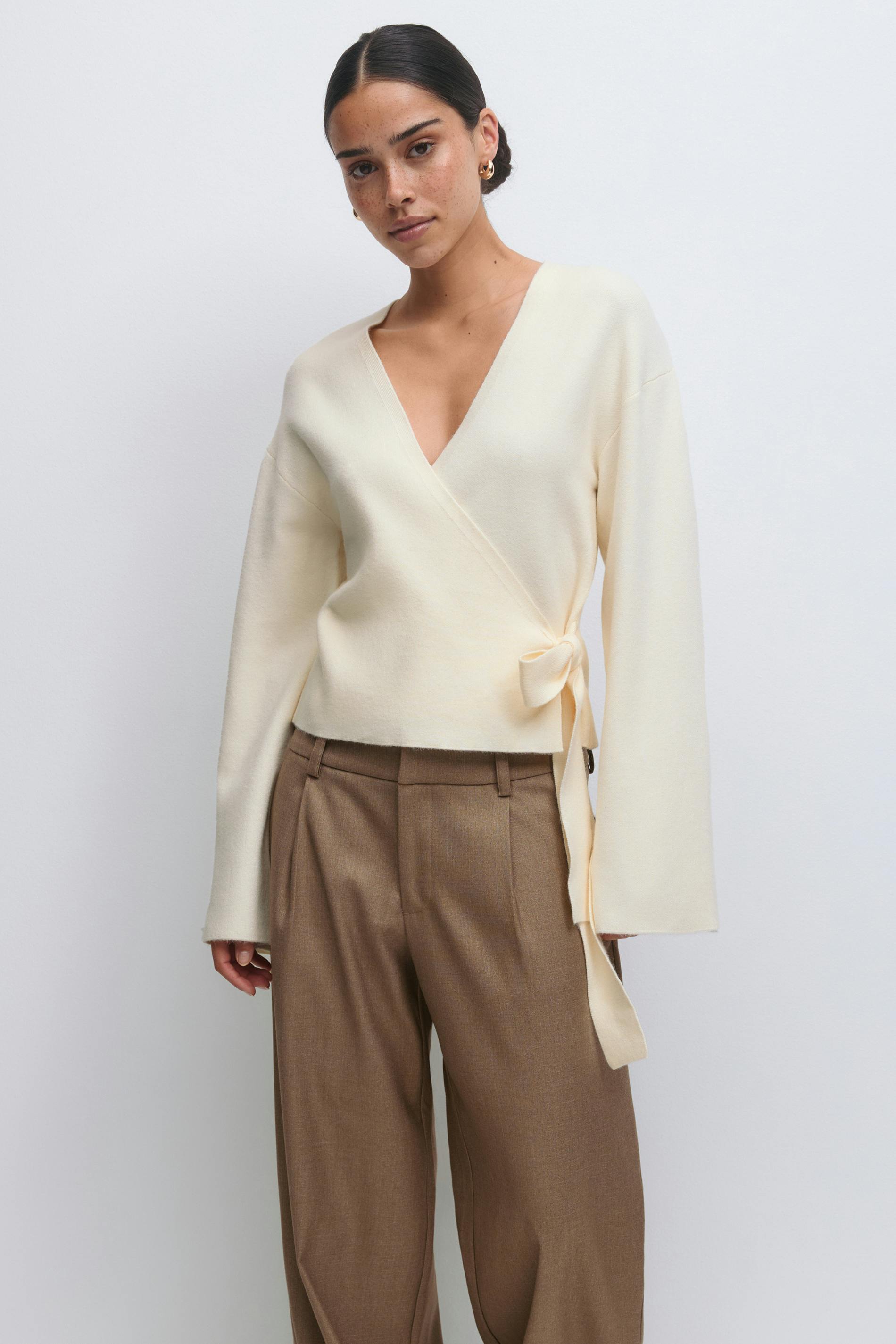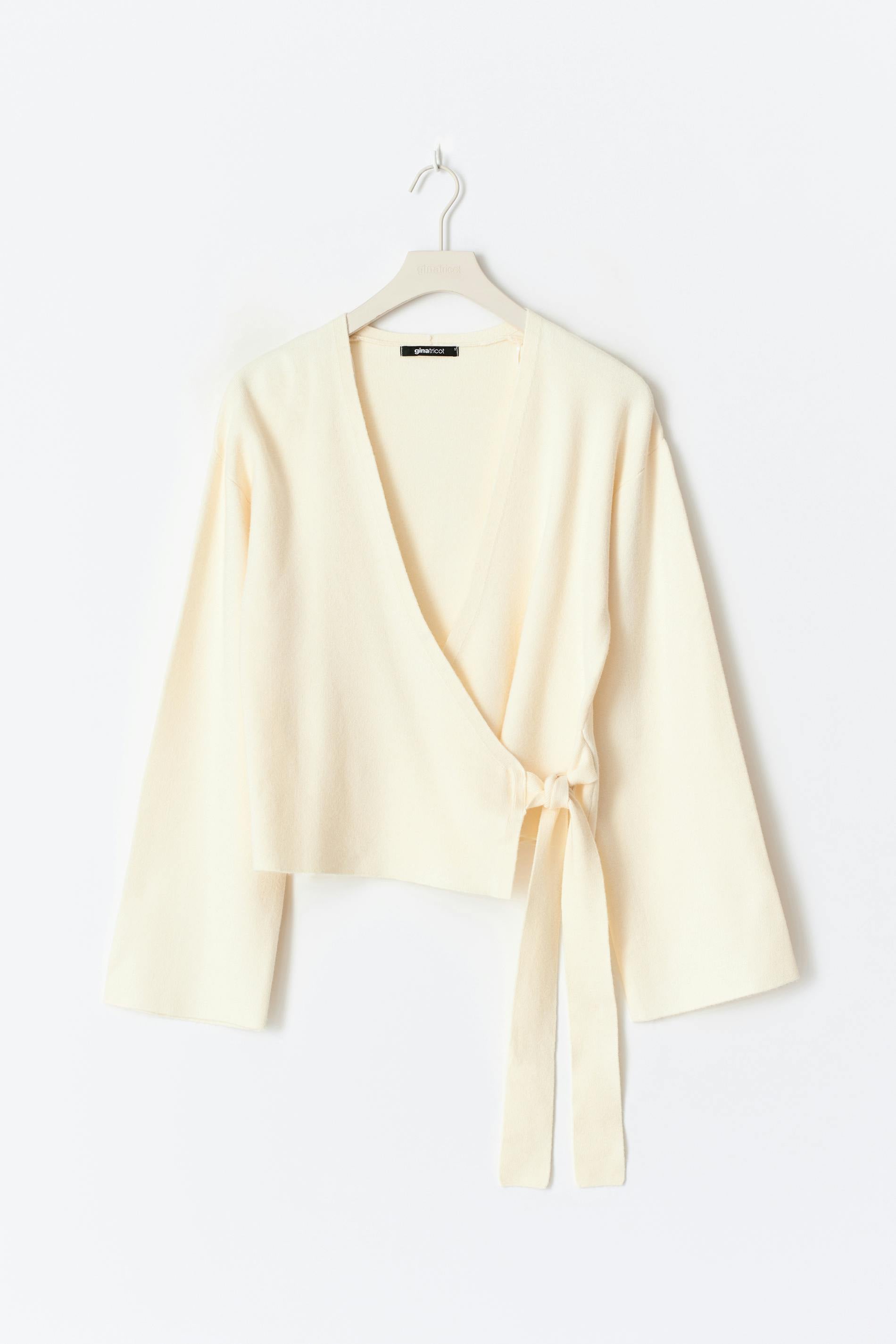 Omlottkofta med v-ringning. Koftan är naturvit och har en knytning i midjan. Den har en lång ärm och en normal passform.