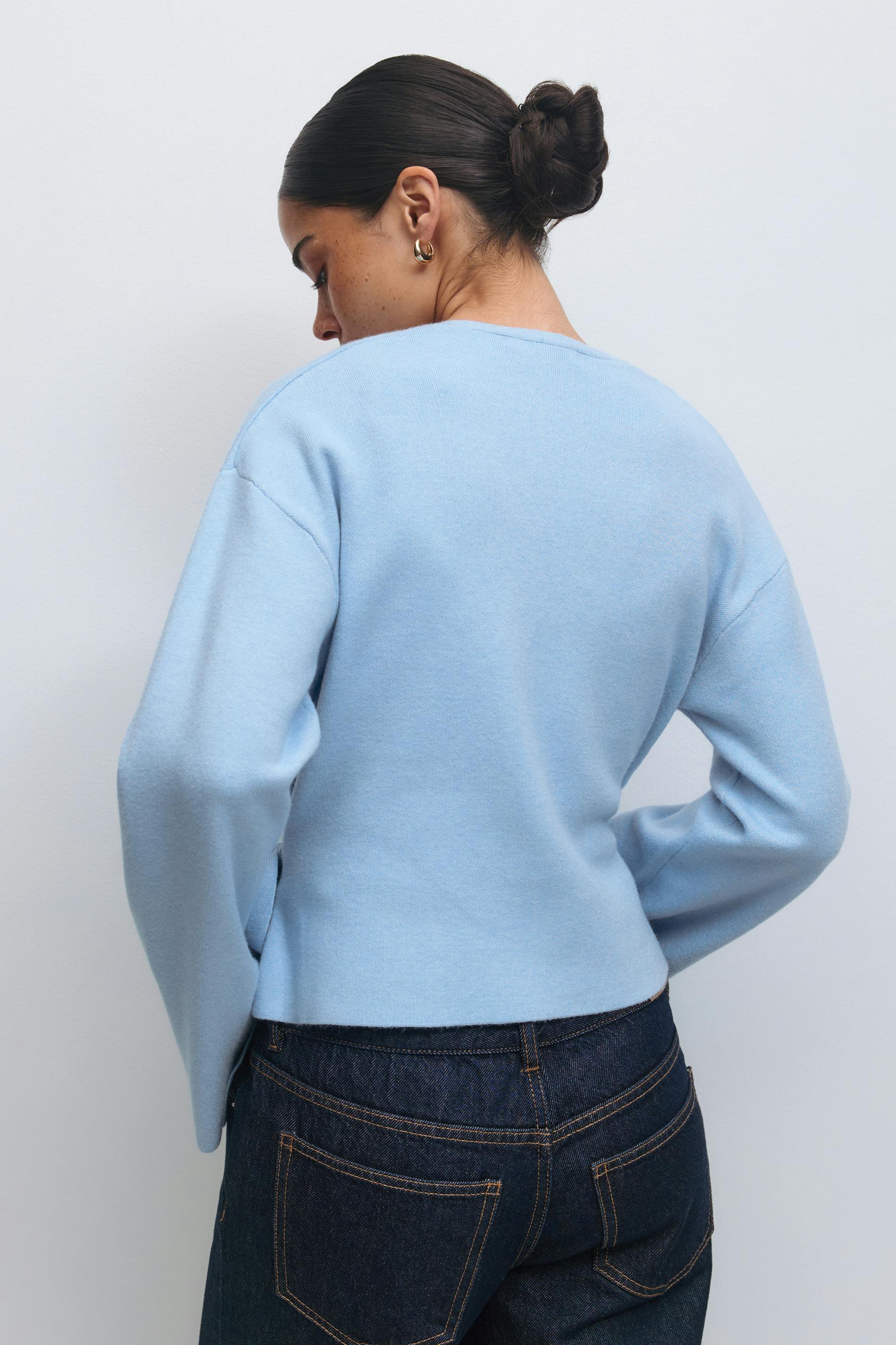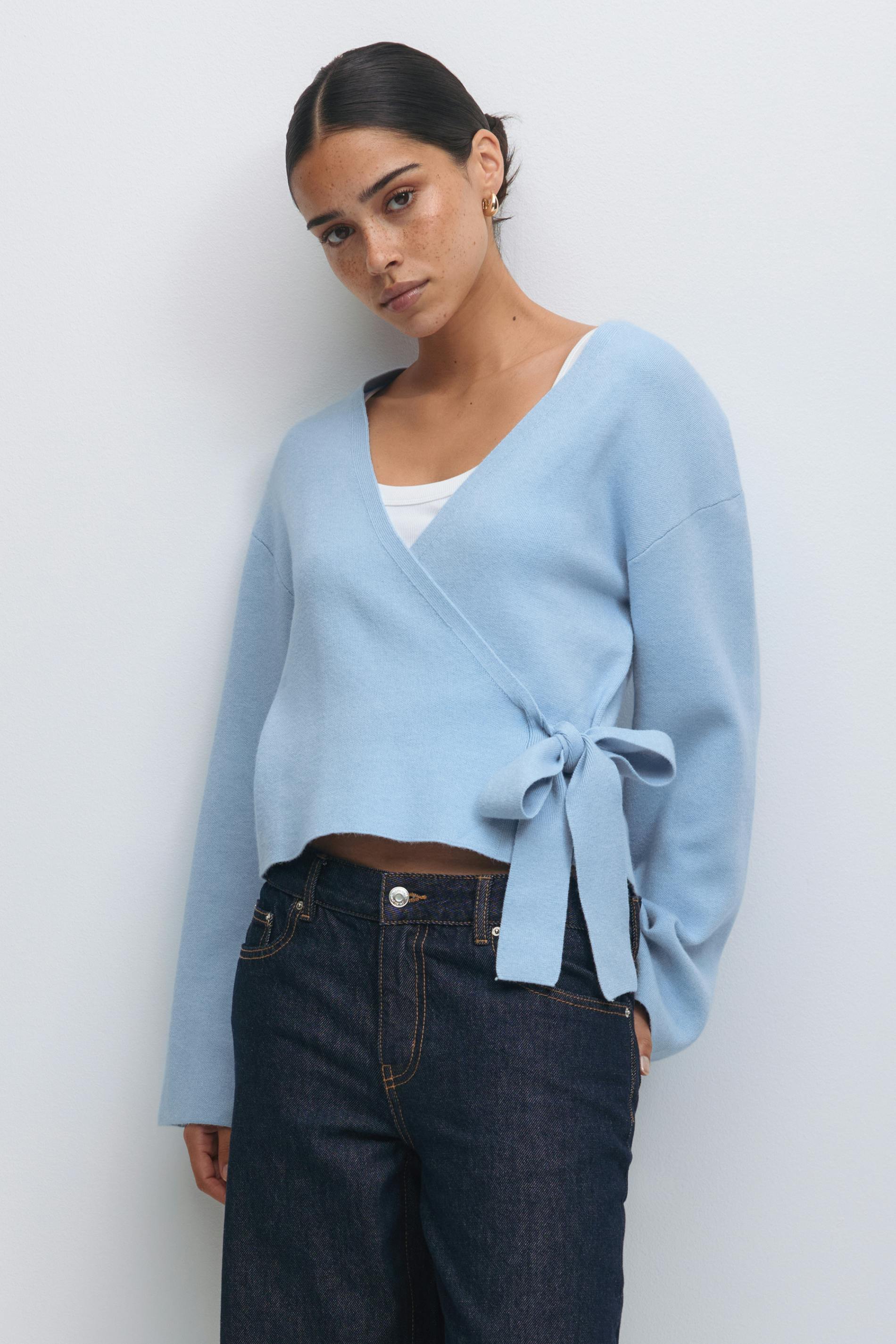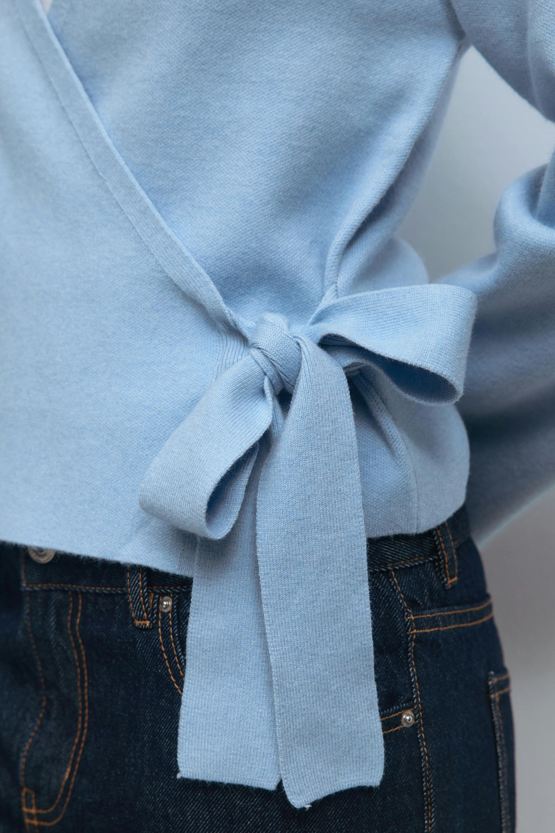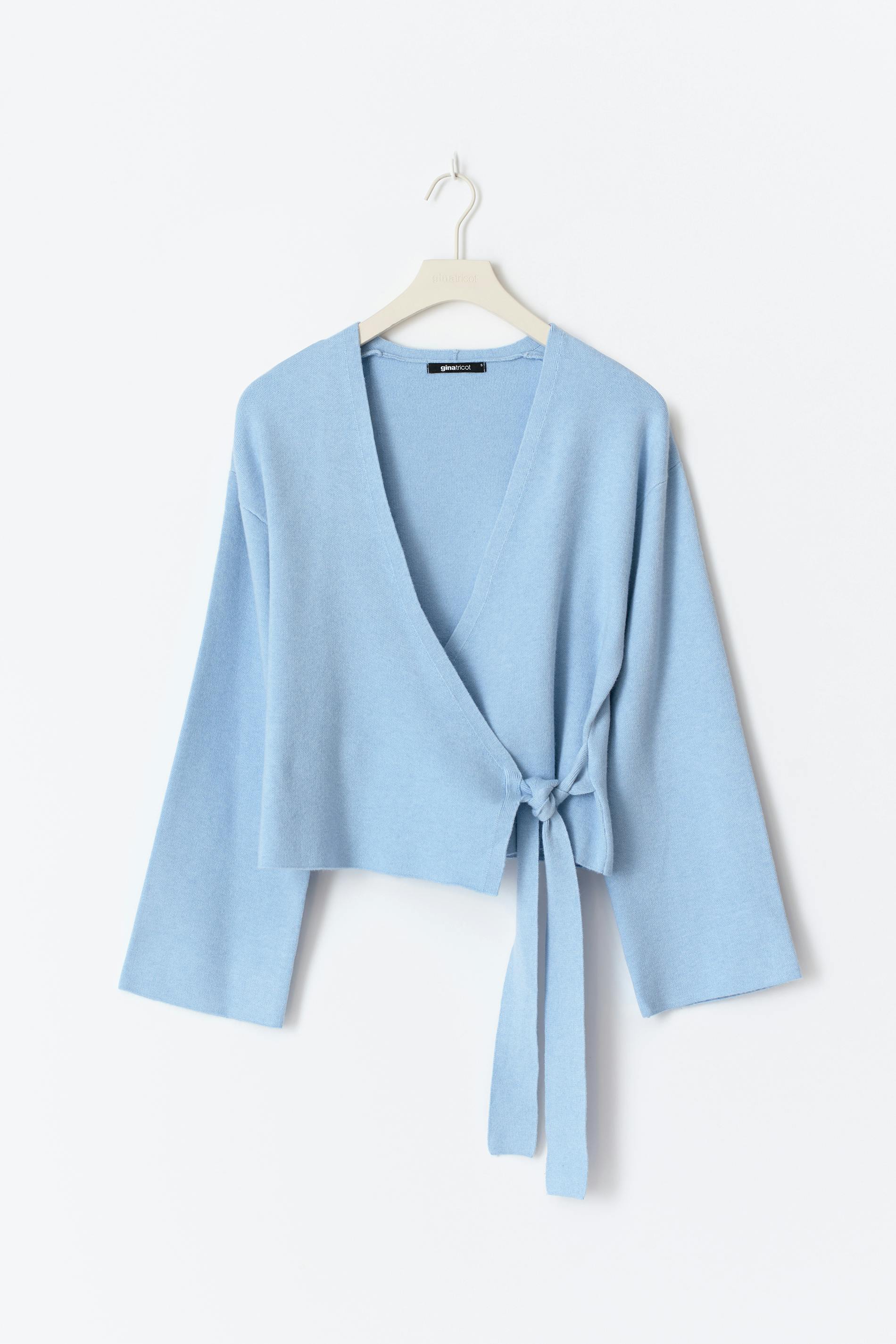 Omlottkofta med v-ringning. Koftan är blå och har en knytning i midjan. Den har en lång ärm och en normal passform.