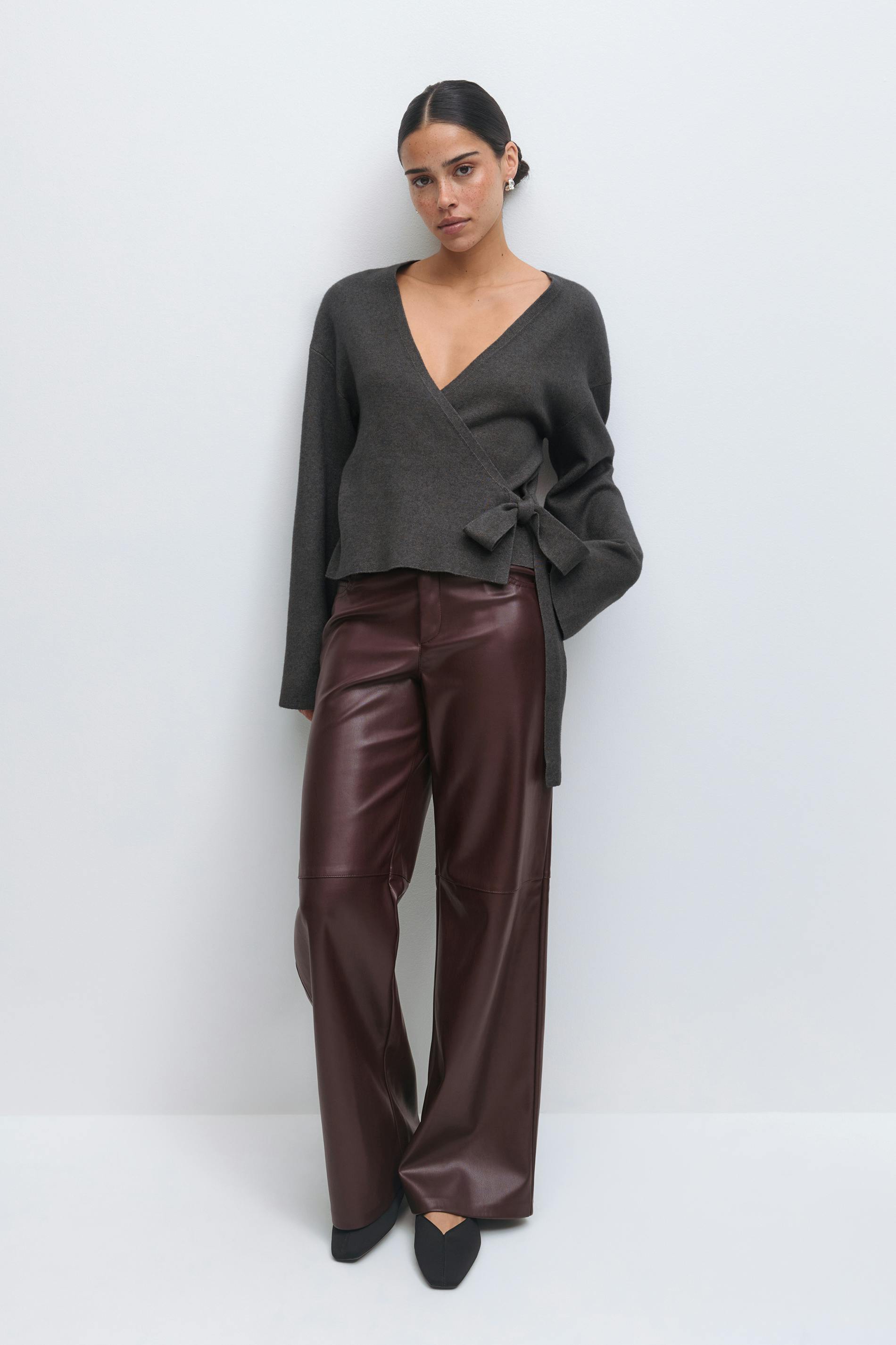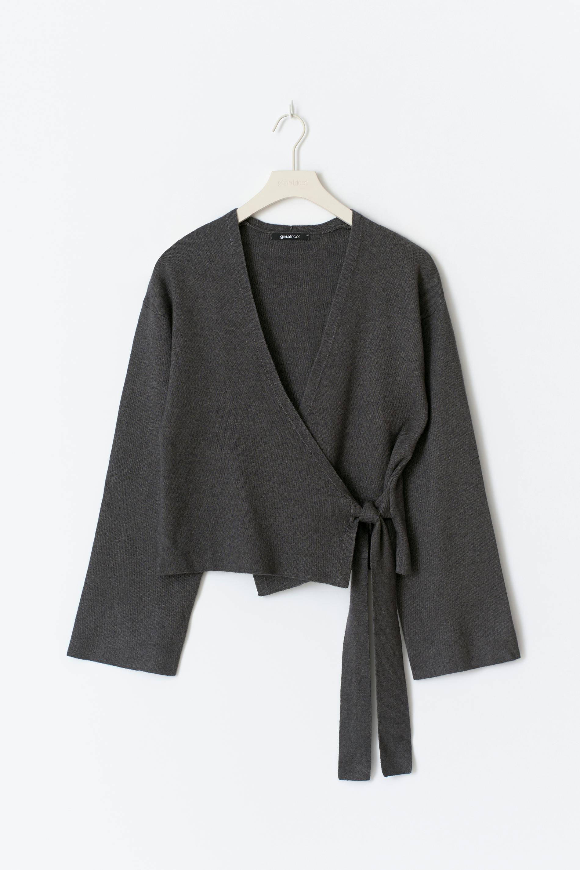 Omlottkofta med v-ringning. Koftan är grå och har en knytning i midjan. Den har en lång ärm och en normal passform.