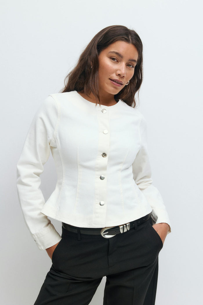 Fitted denim jacket with tapered waist. The jacket is blue and has buttons at the front. It has figure-hugging fit, v-neck and long sleeves.