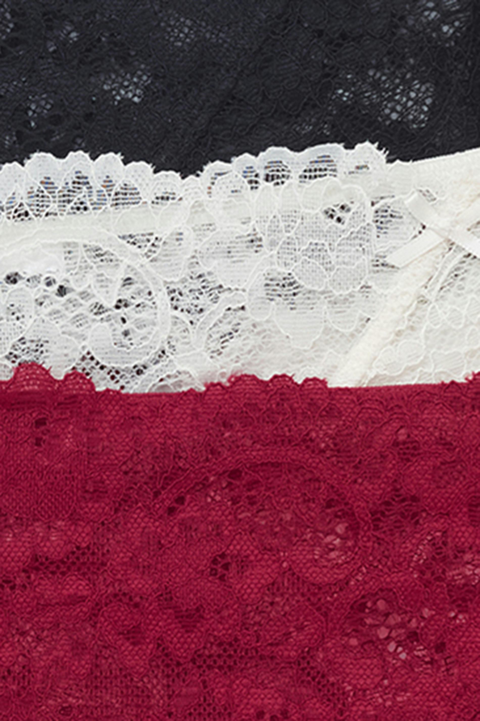 3-pack stringtrosor i spets med små rosetter. Stringtrosorna är vita, svarta och röda och har låg midja. De har fodrad gren i bomull och normal passform.
