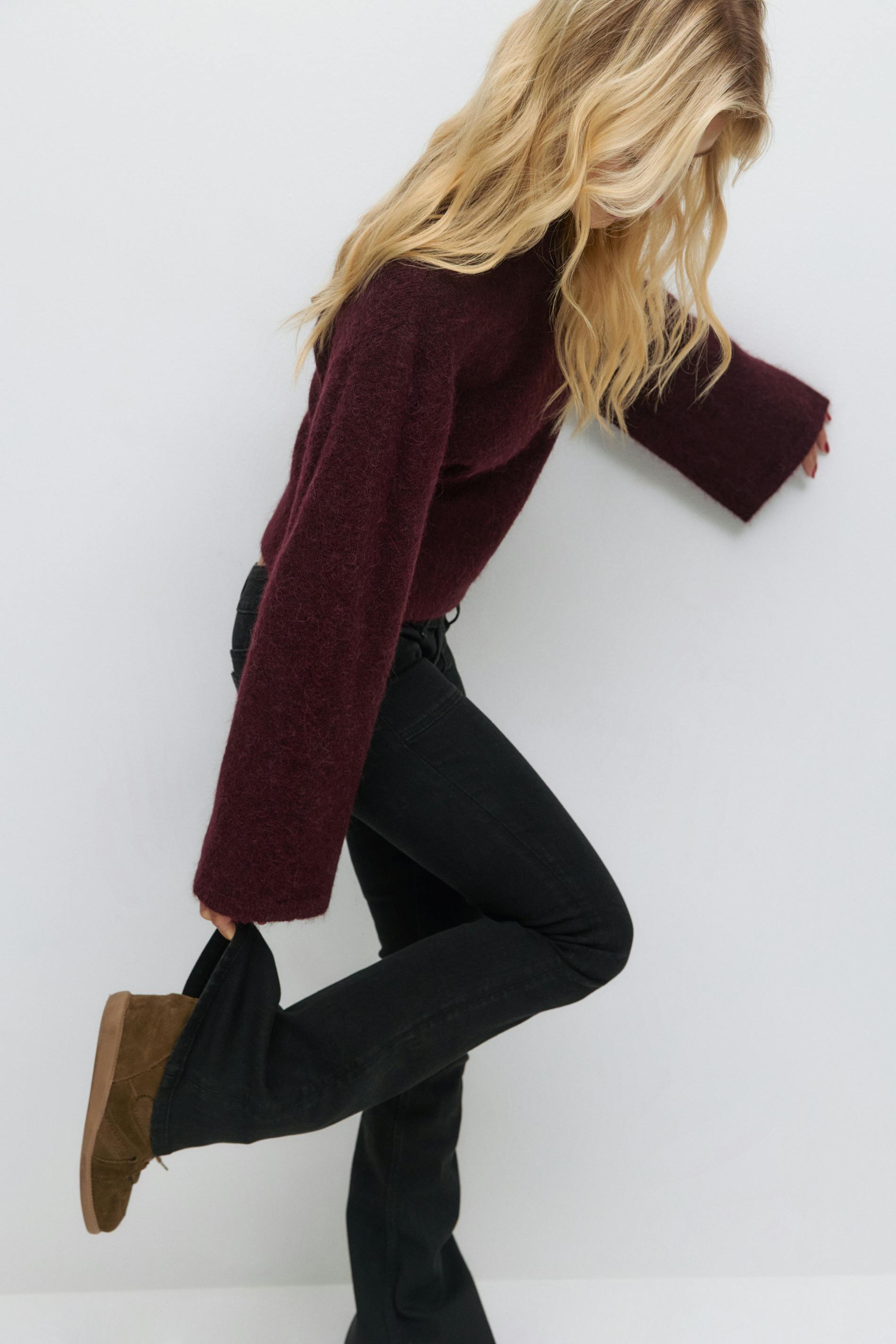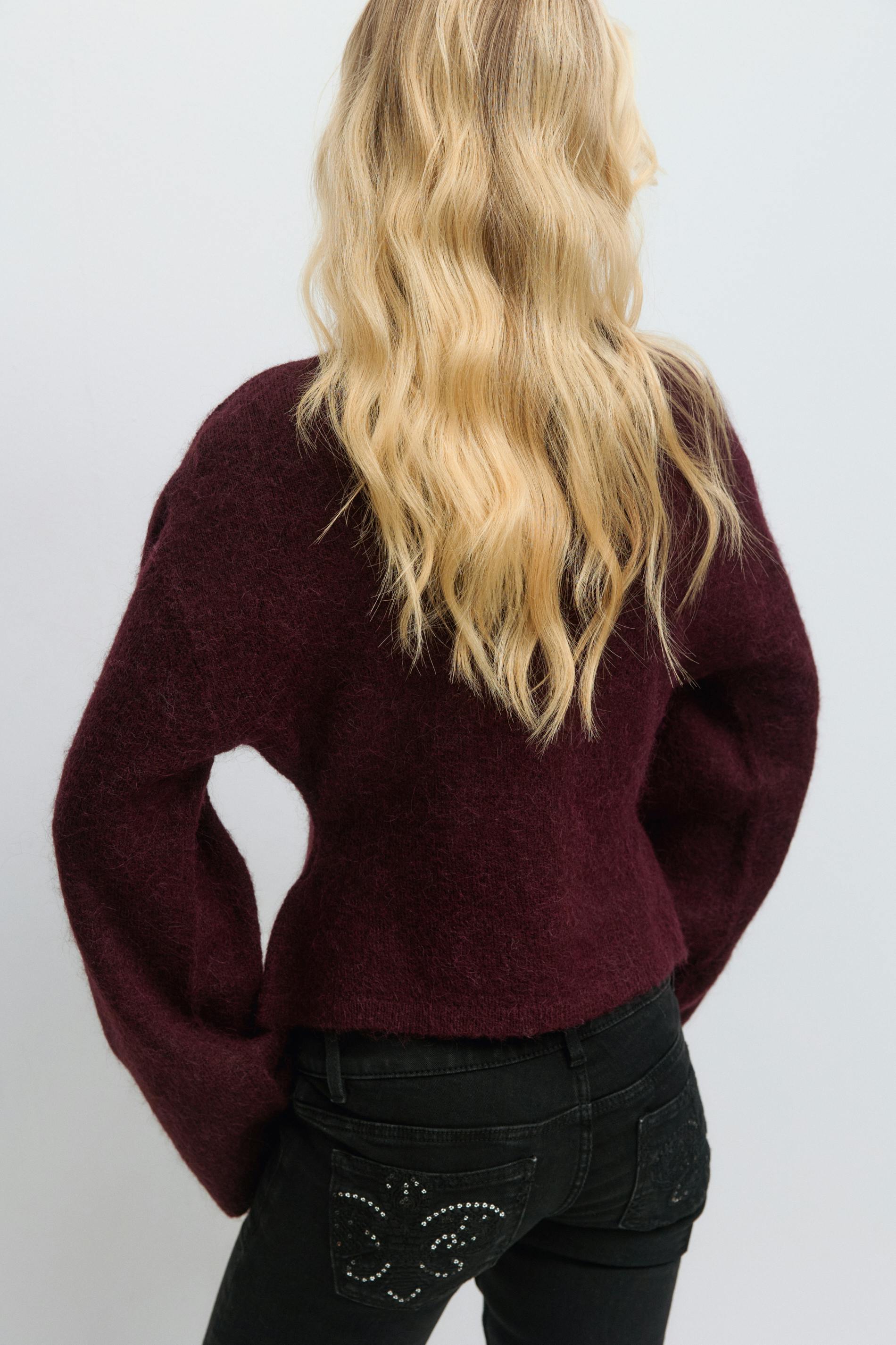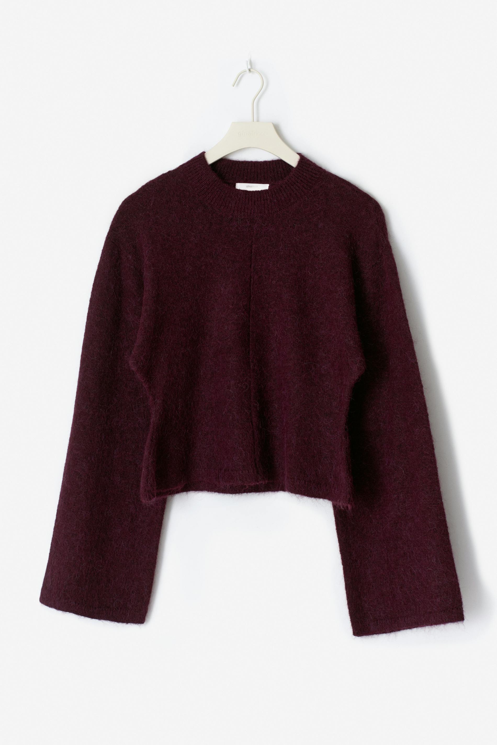 Stickad tröja med intagen midja. Tröjan är vinröd och har dekorativ söm framtill. Den har vida ärmar och rund halsringning.