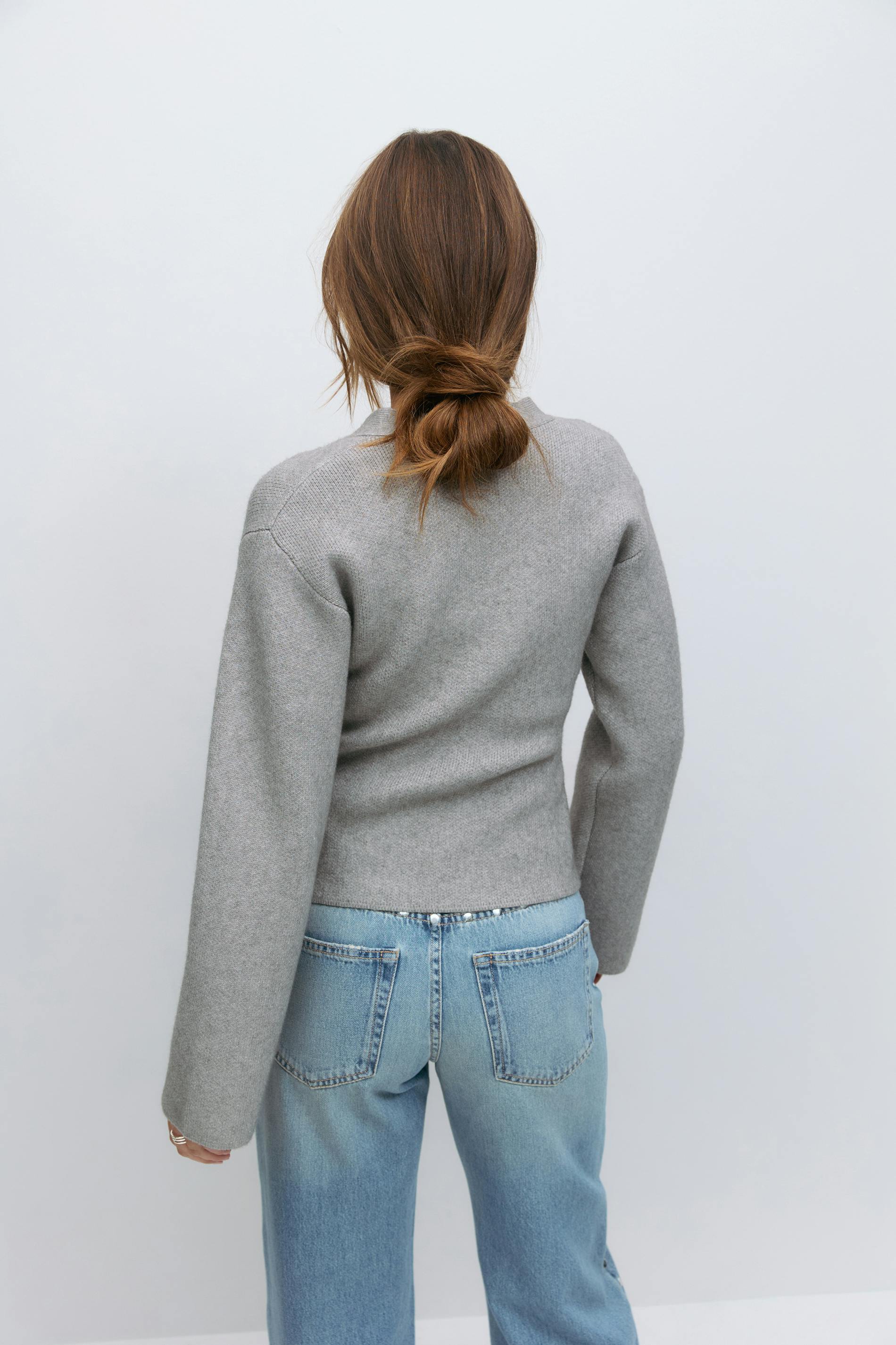 Figursydd kofta med fickor framtill. Koftan är grå och har v-ringning. Den har knappar framtill, intagen midja och normal passform.