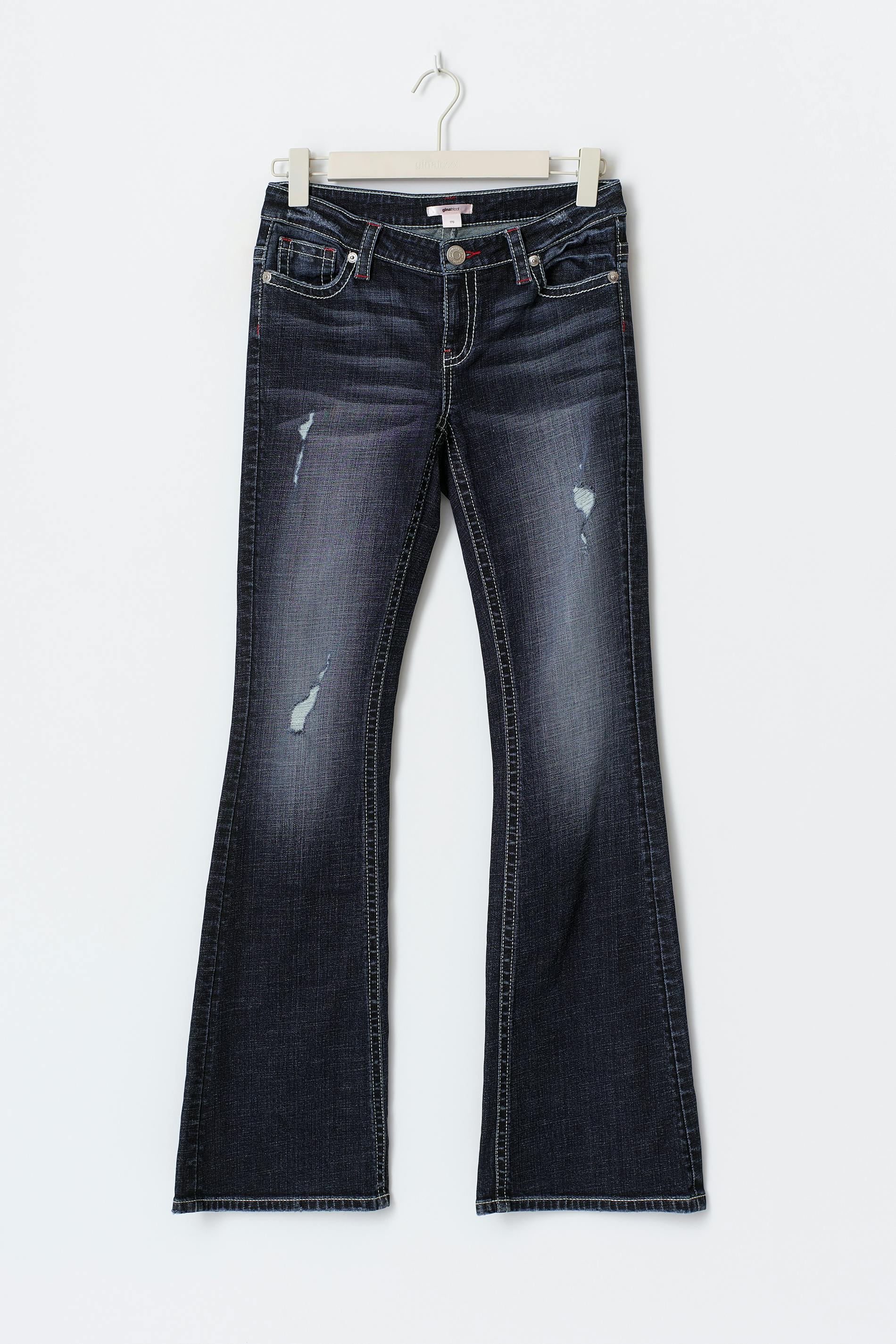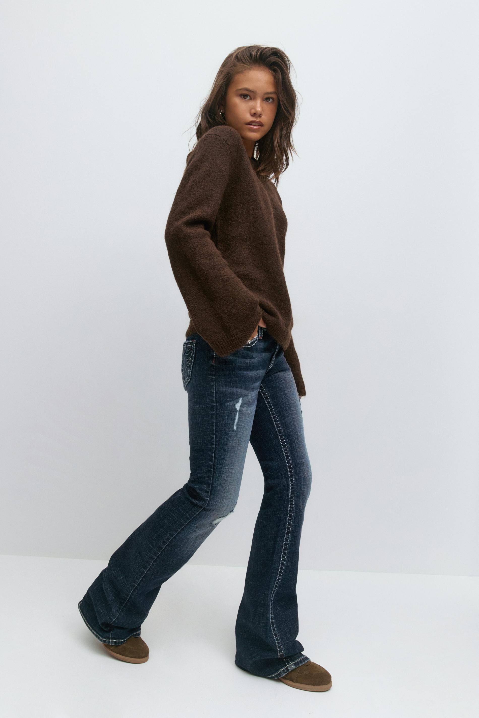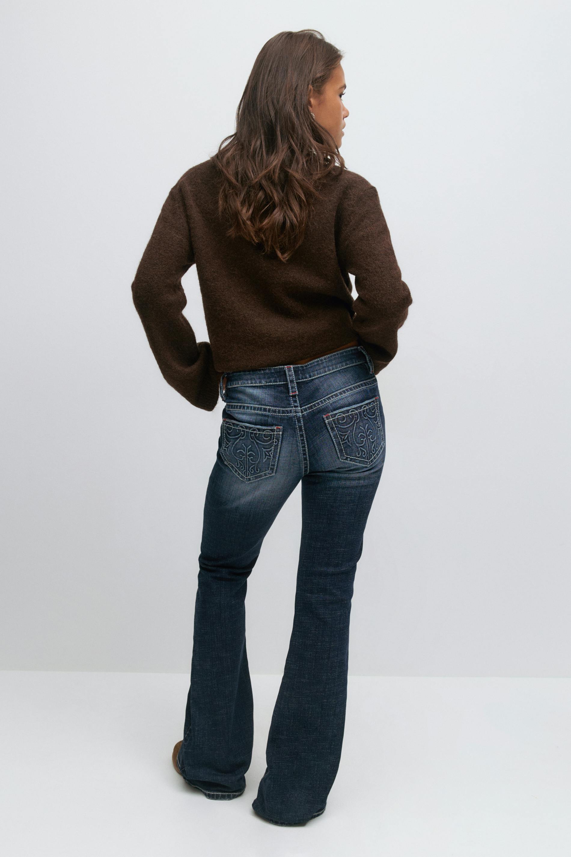 Low waist jeans med slitningar framtill. Jeansen är blåa och har utsvängda ben. De har broderade bakfickor, låg midja, framfickor, dragkedjegylf och låg stretch.