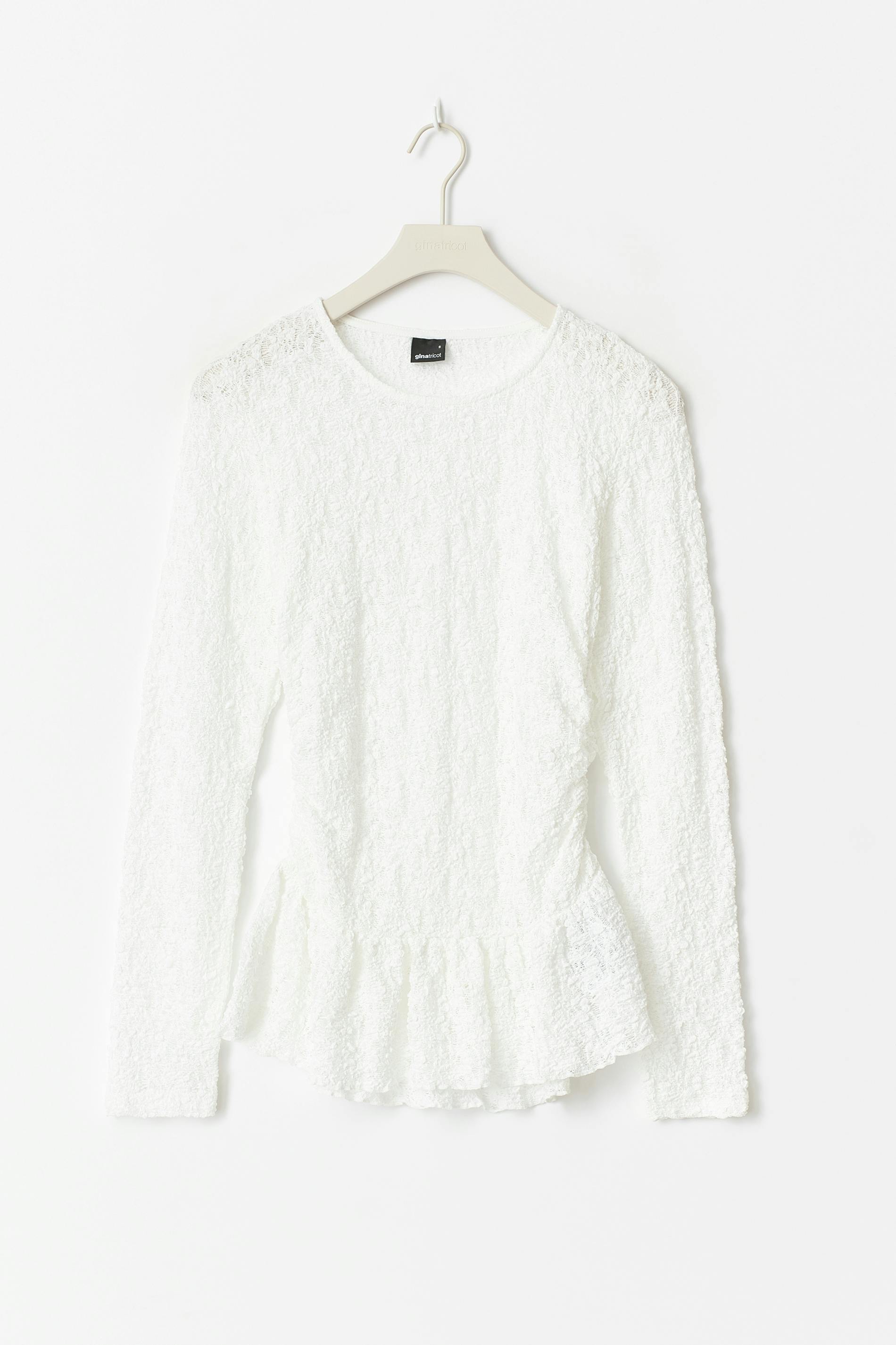 Spetstopp med volang i nederkant. Toppen är vit och har peplum-design. Den har rund halsringning, rynkningar i sidorna, lång ärm och normal passform. Ofodrad.