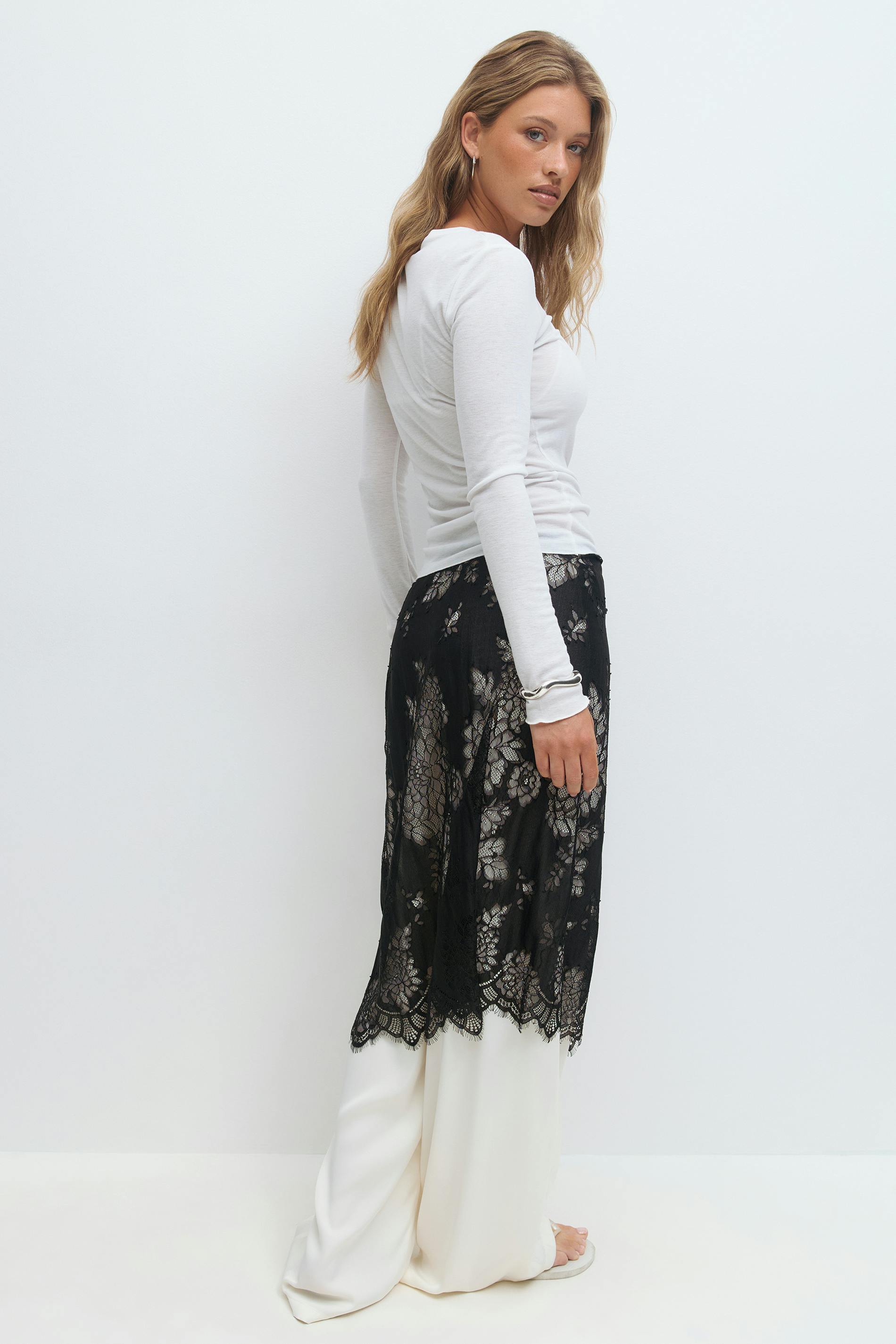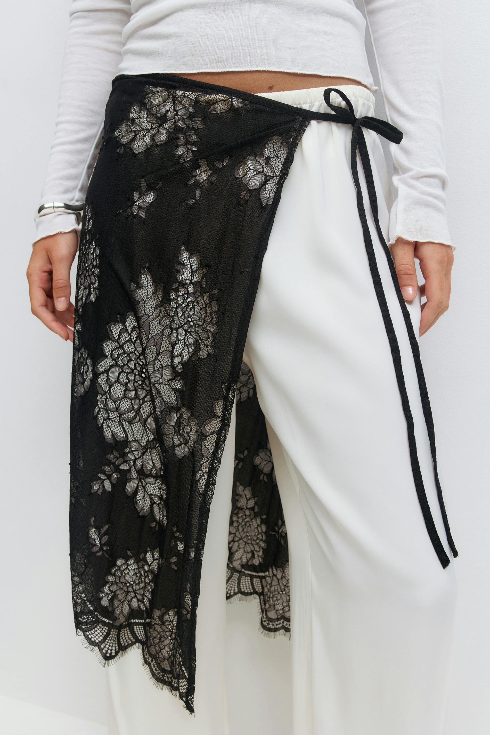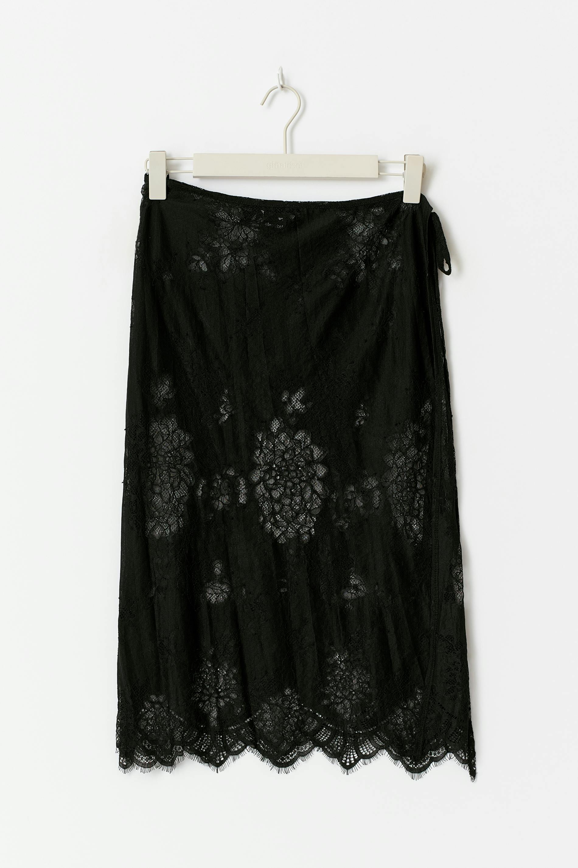 Spetskjol med knytning i midjan. Kjolen är svart och har blommigt mönster. Den har normal passform, uddkant nedtill och mjuk resår i midjan. Ofodrad.