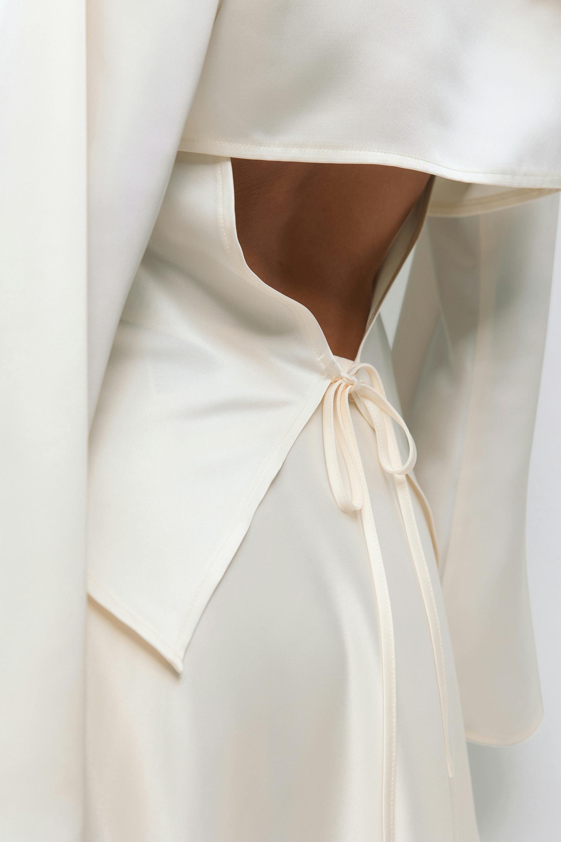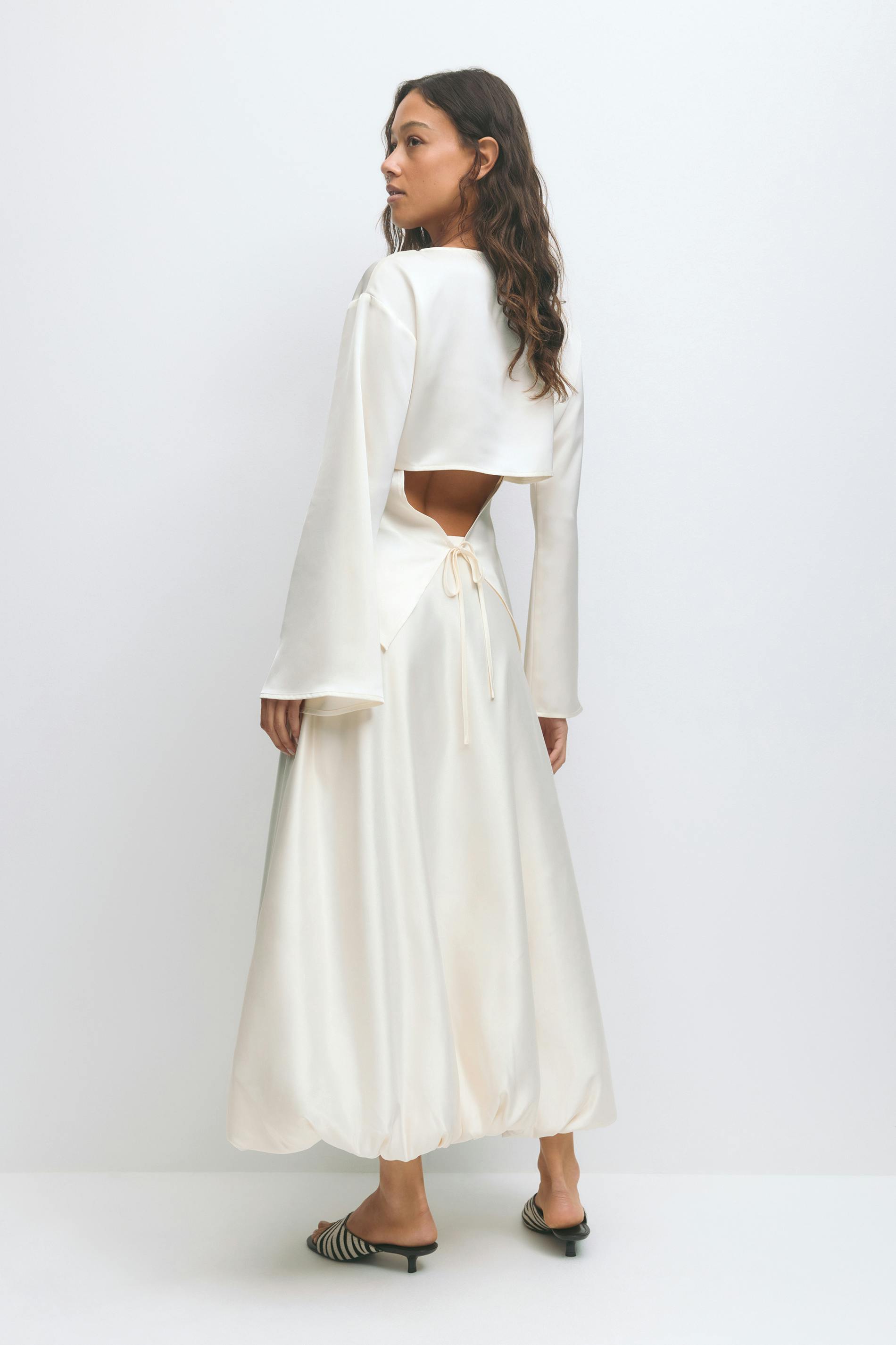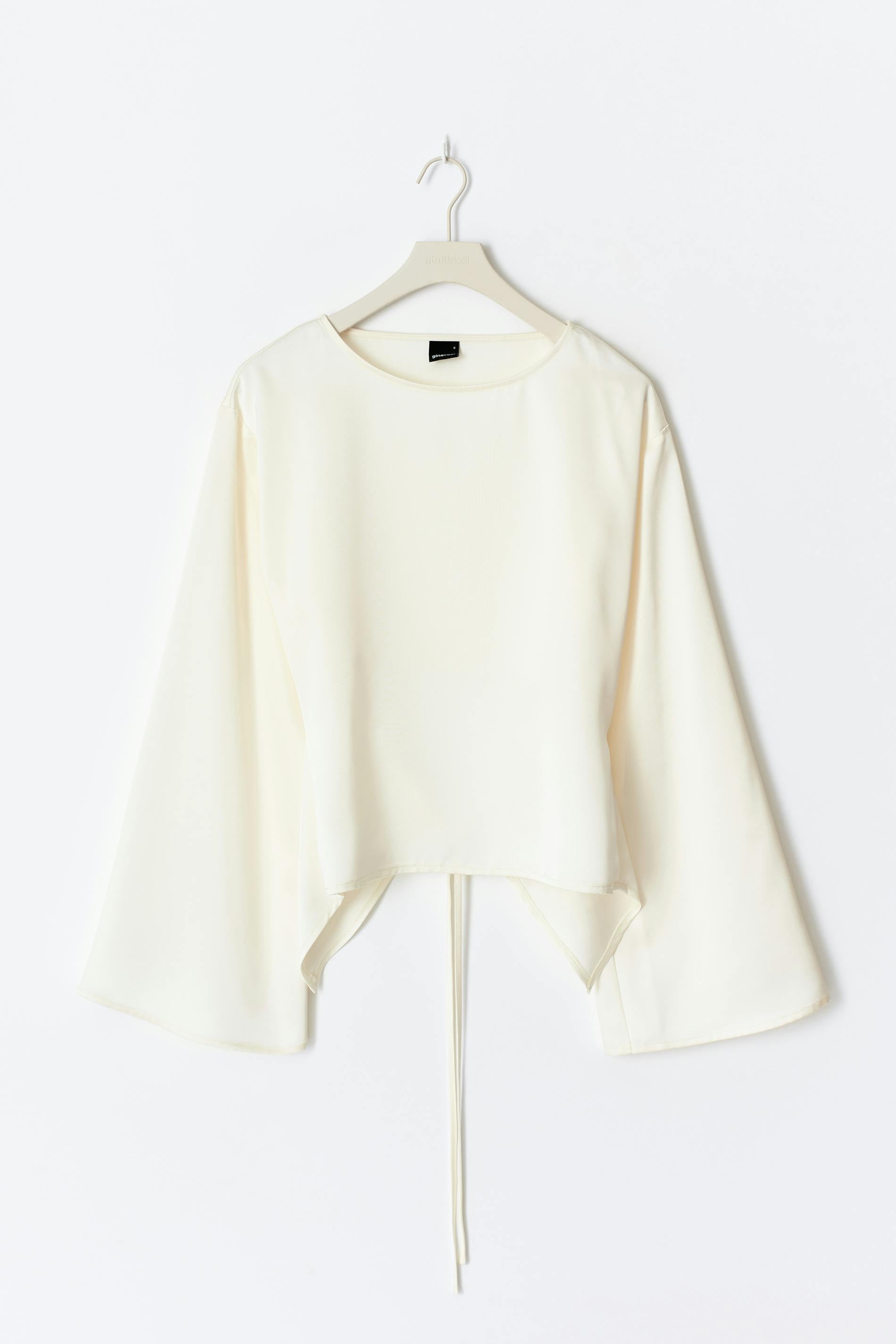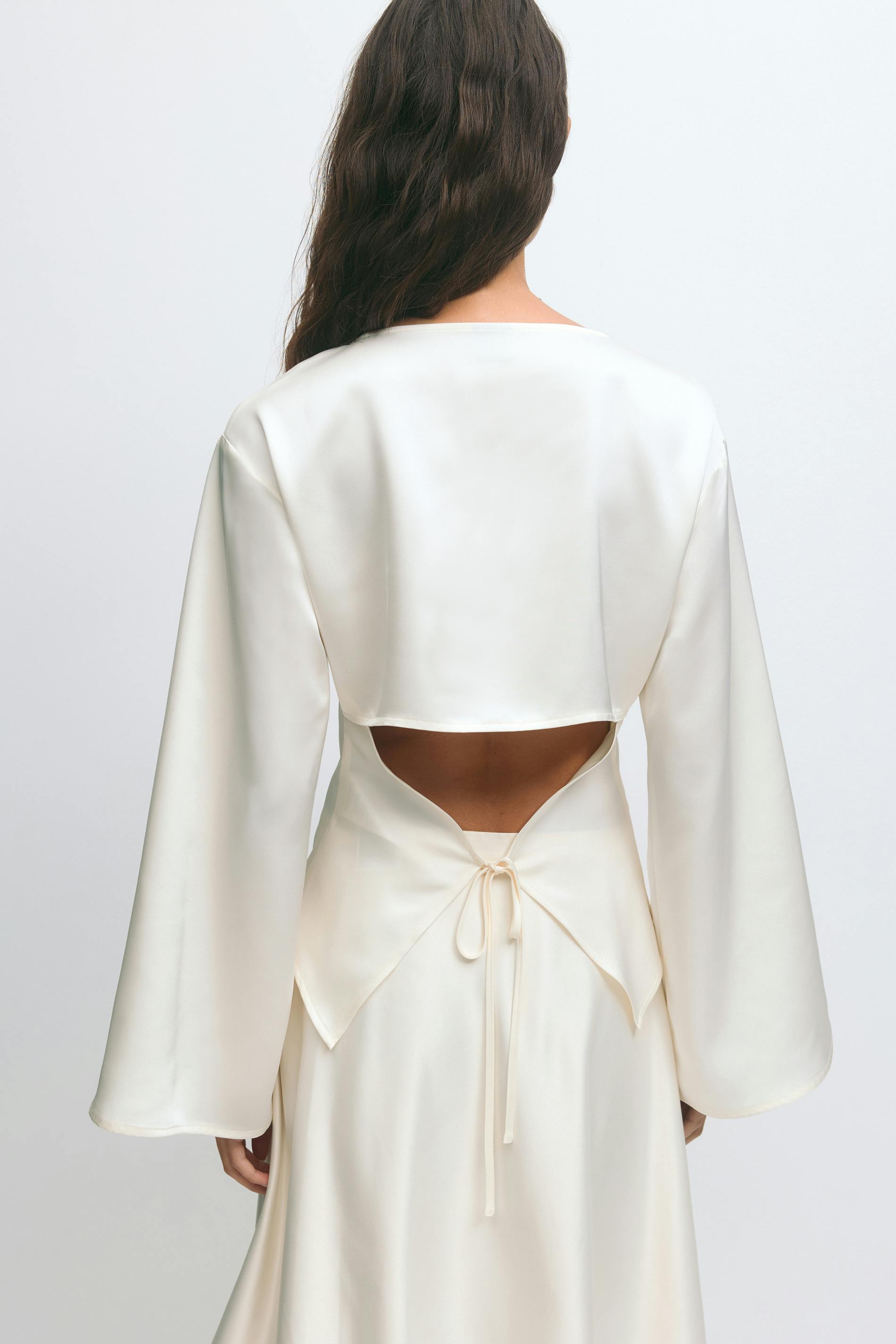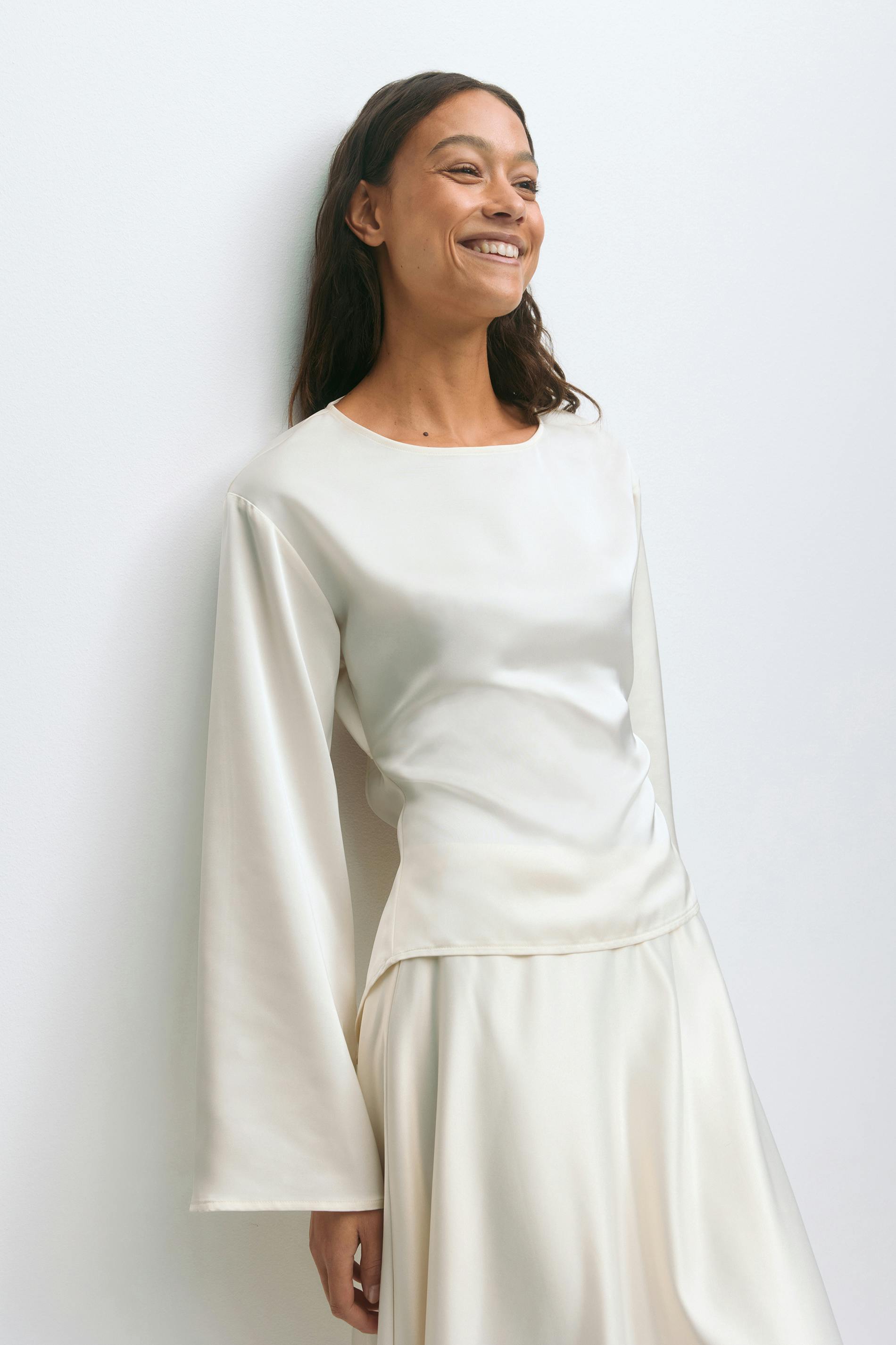 Långärmad topp i satin med knytdetalj i ryggen. Toppen är krämfärgad och har båtringning. Den har en vid ärm, öppen rygg och en normal passform.