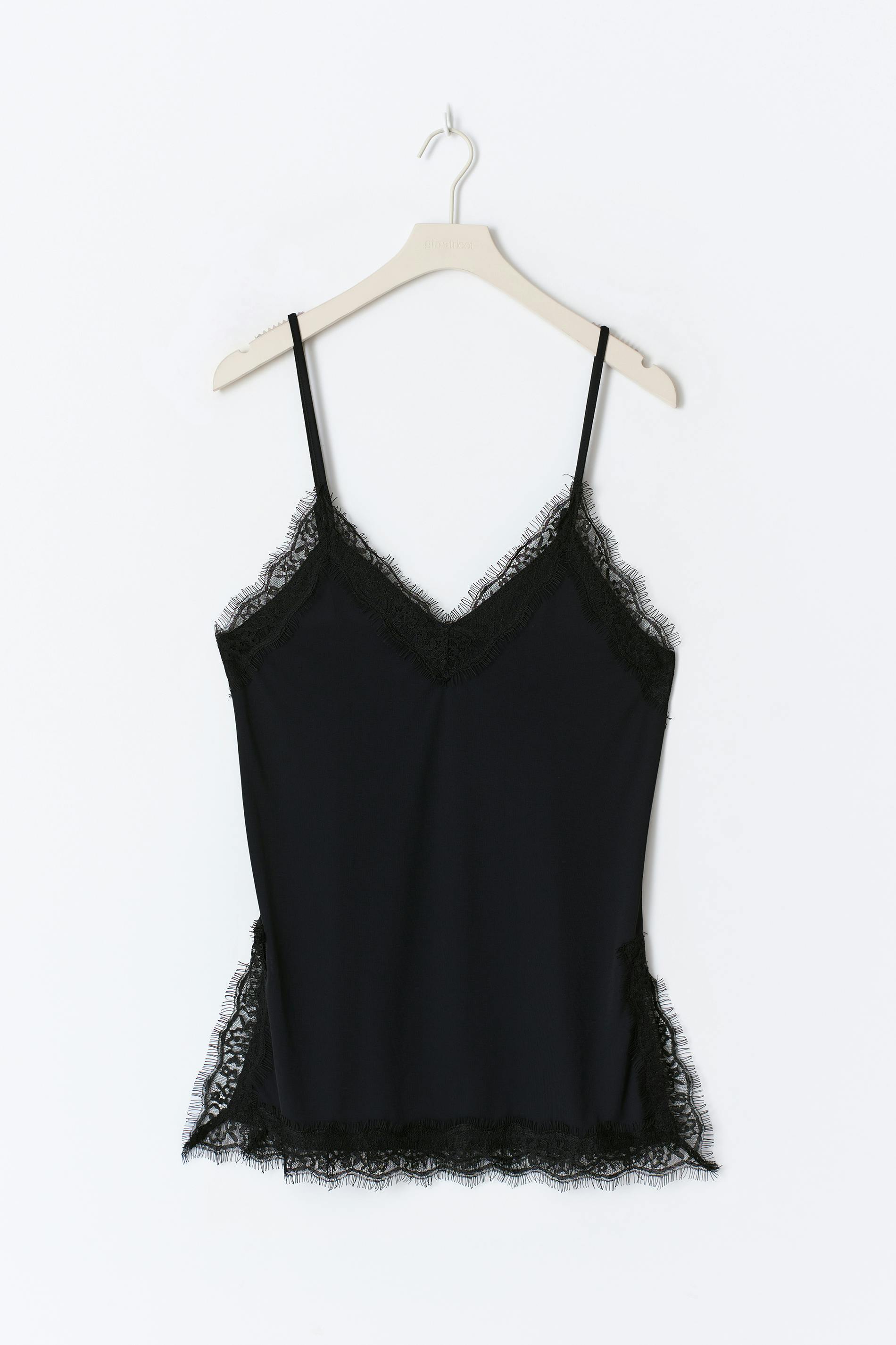 Spetslinne med djup v-ringning. Spetslinnet är svart och har reglerbara axelband. Det har normal passform, skir kvalitet, slits i sidan och spets kring halsringning och i nederkant.