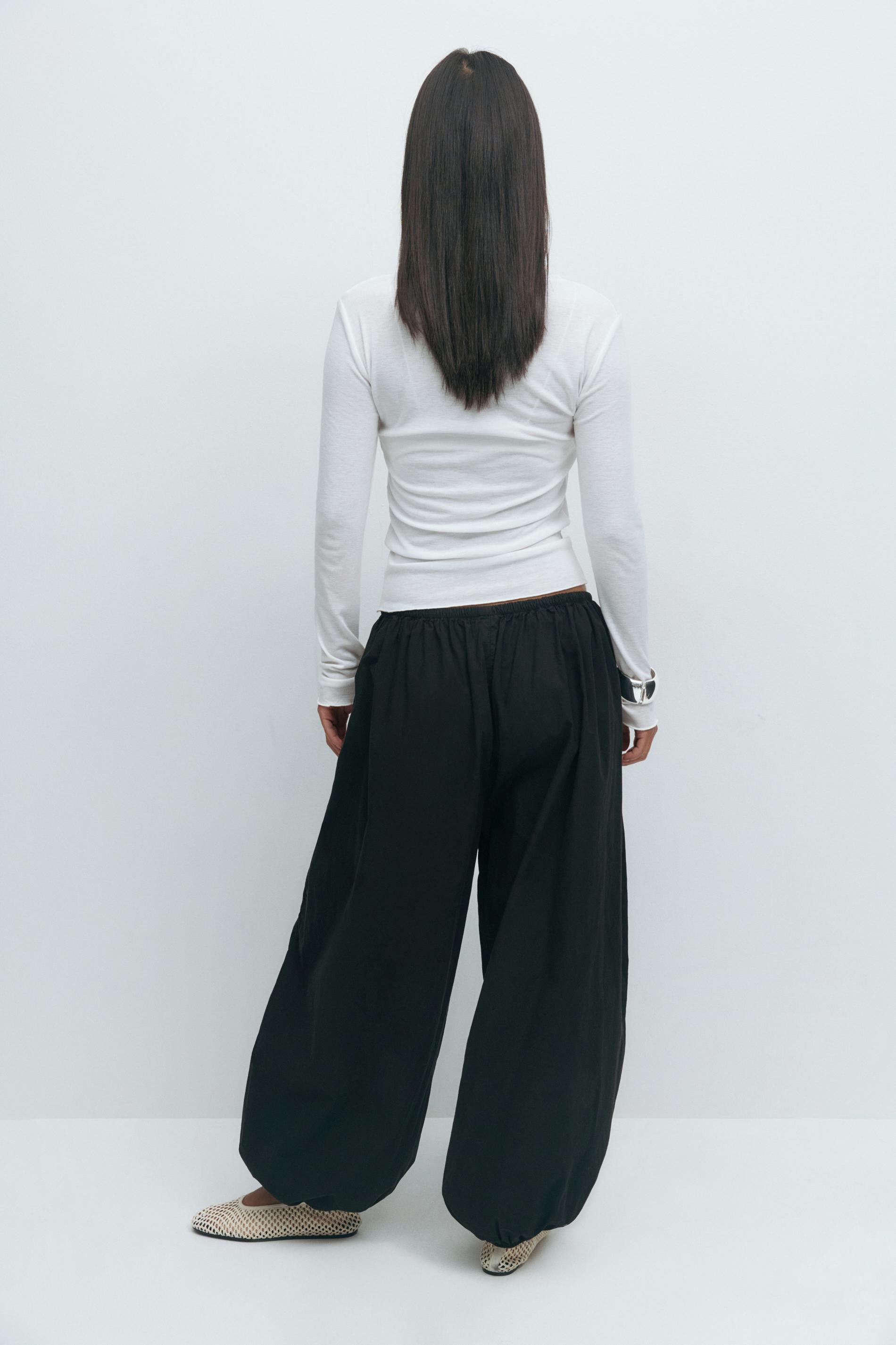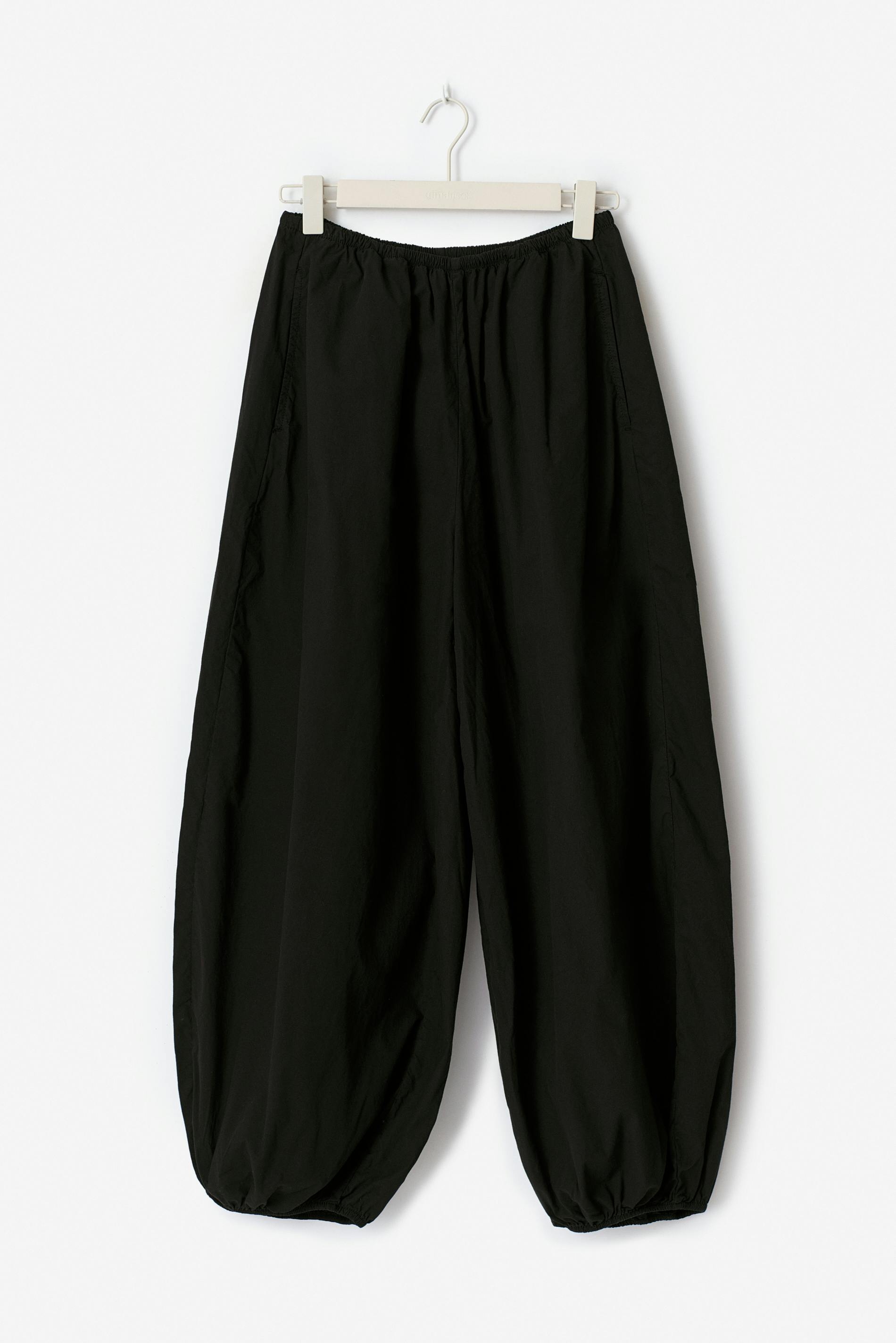 Ballongbyxor i bomull med lös passform. Ballongbyxorna är svarta och har resår i midjan och vid bensluten. De har vida ben med normallängd, fickor i sidorna och medelhög midja.