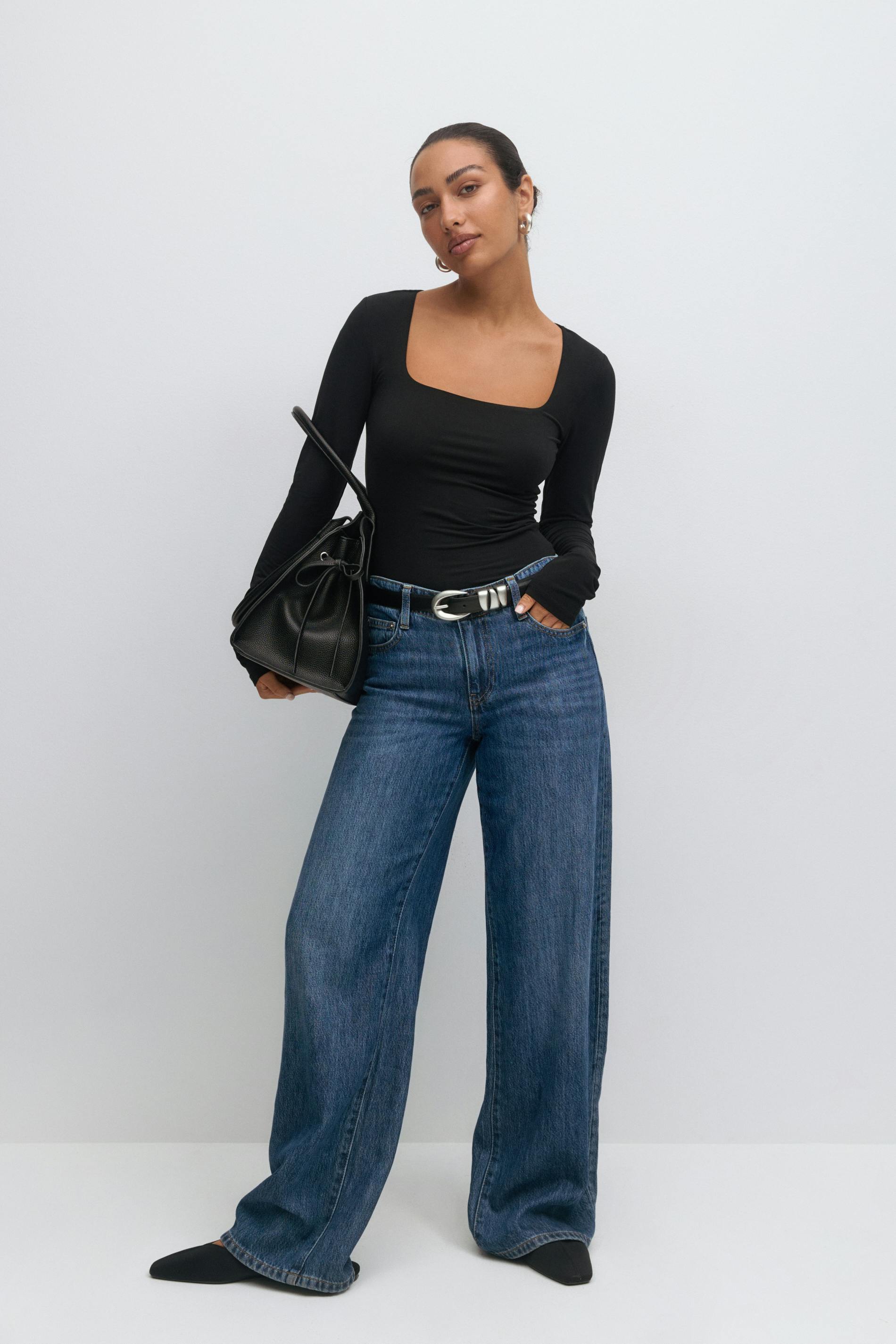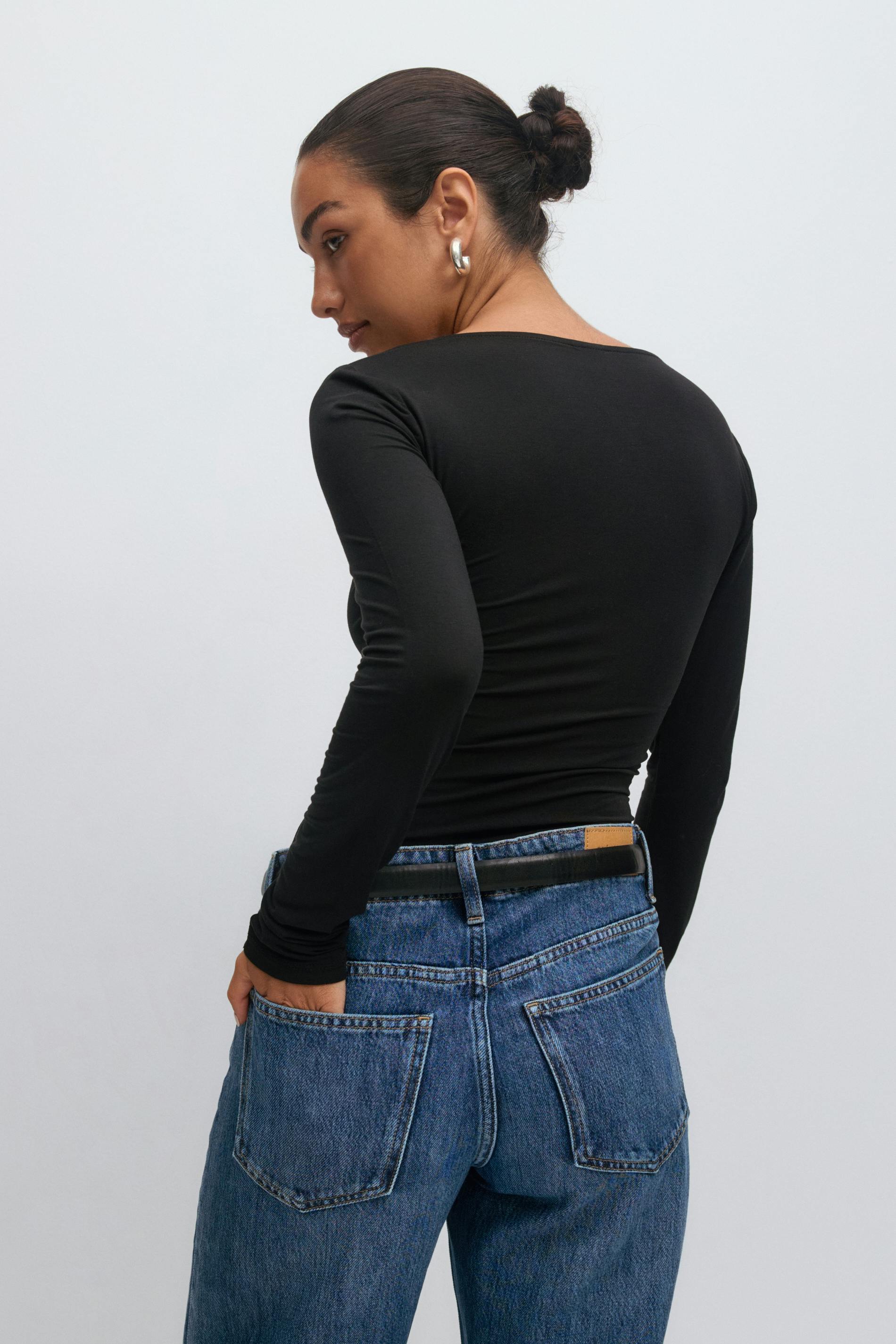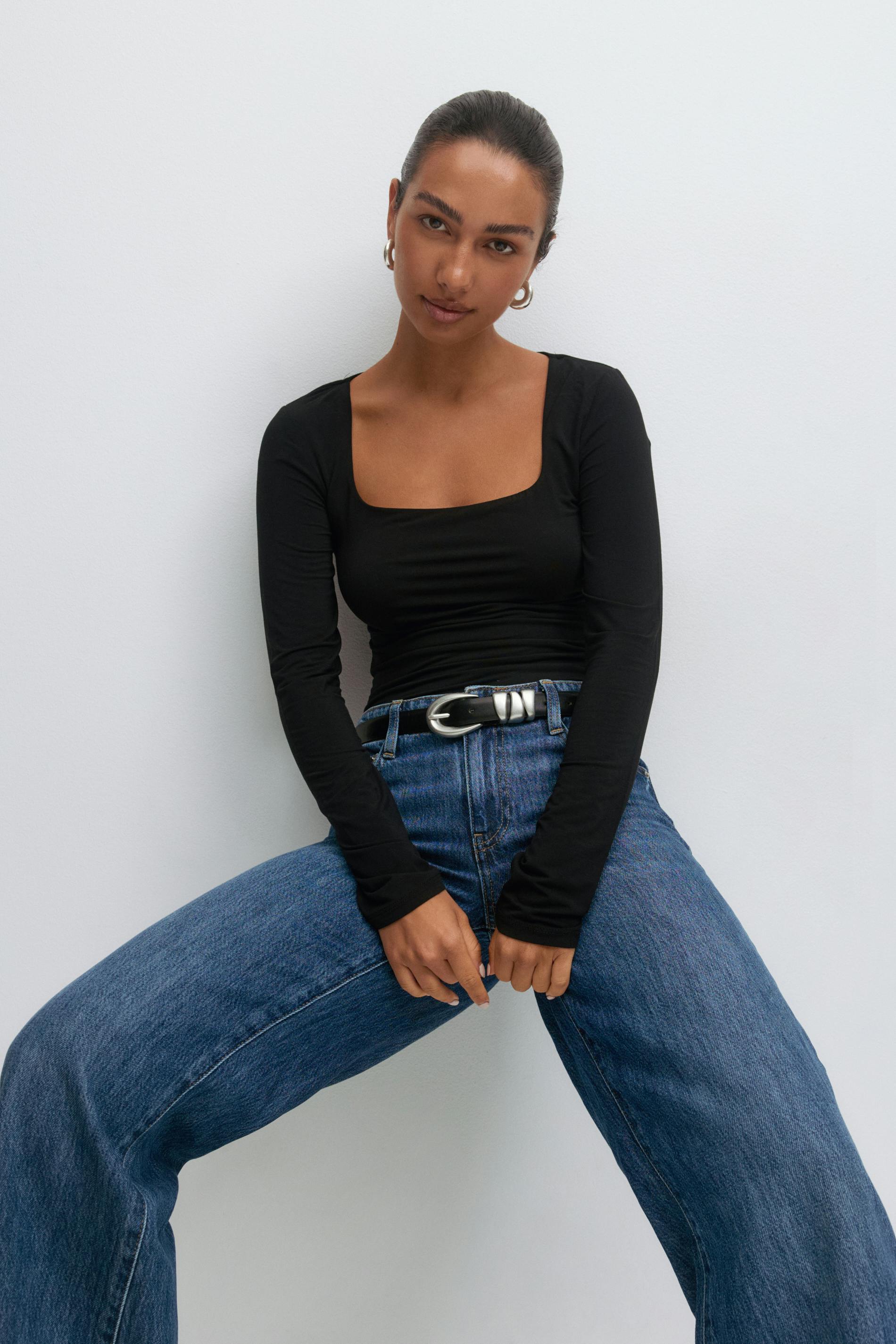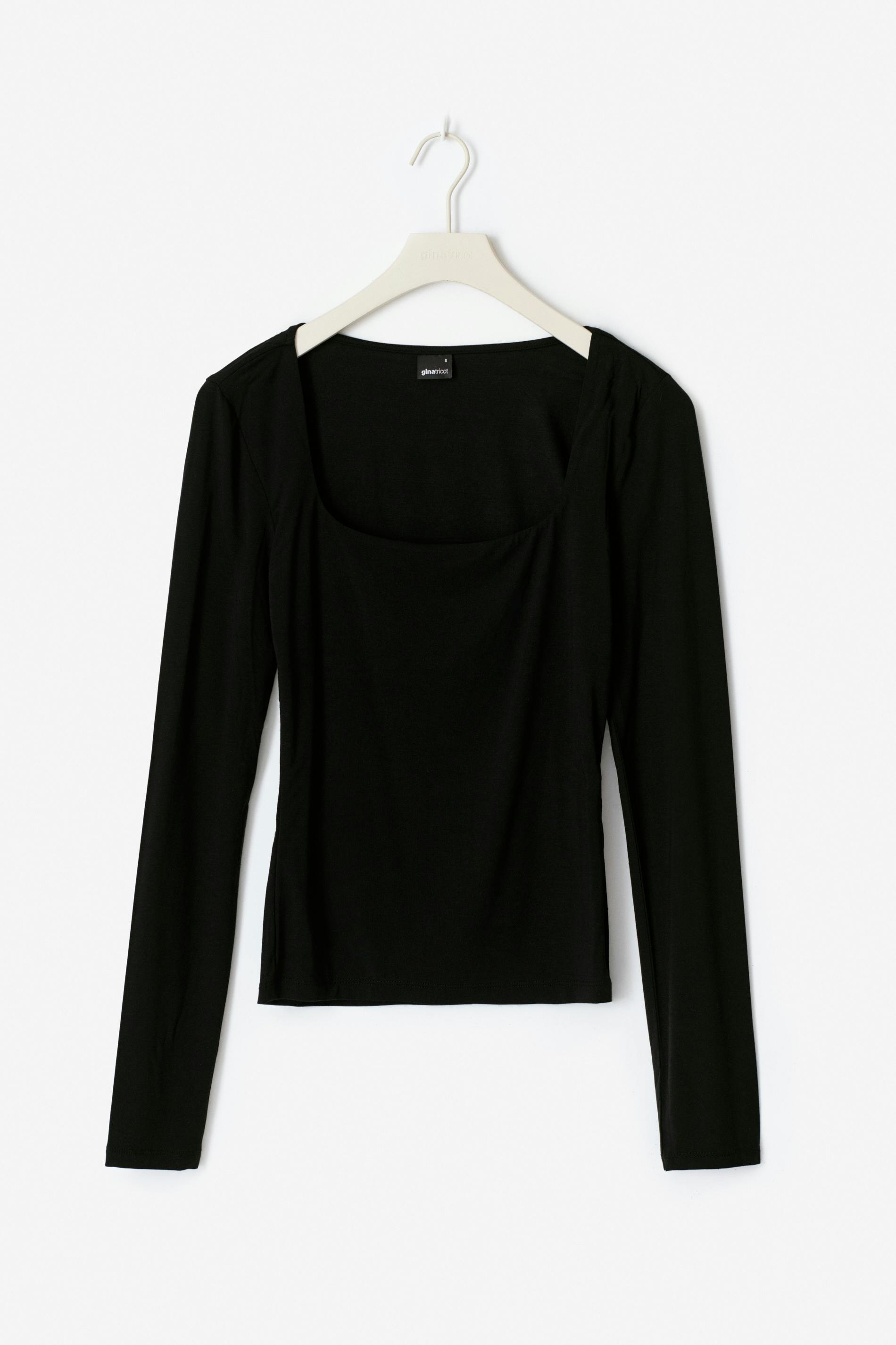 Långärmad topp med fyrkantig halsringning. Toppen är svart och har figurnära passform. Den har stretchig kvalitet och normallängd.