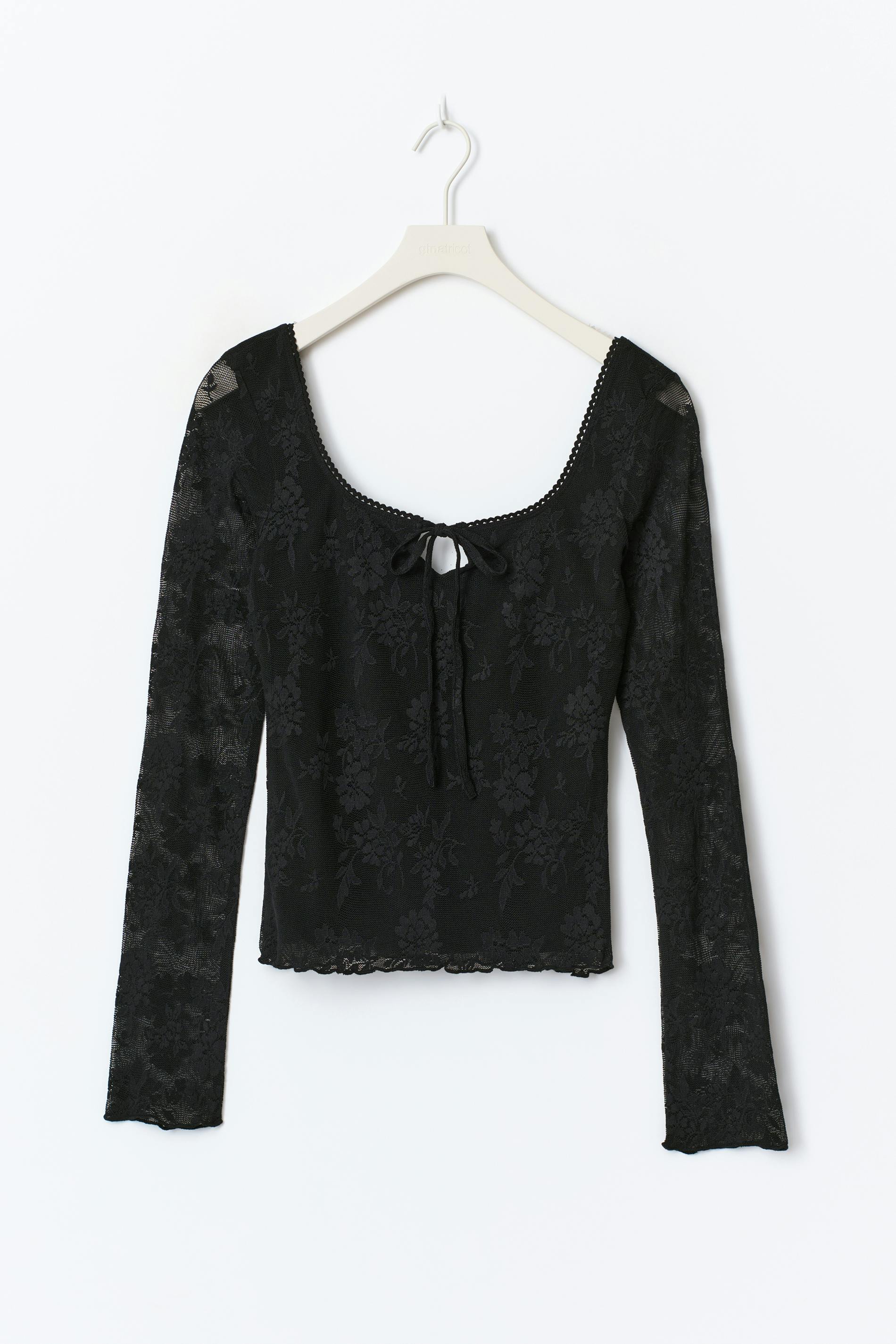 Långärmad topp i spets med en djup halsringning. Toppen är svart och har en figurnära passform. Den har ett knytband framtill och en normal passform.