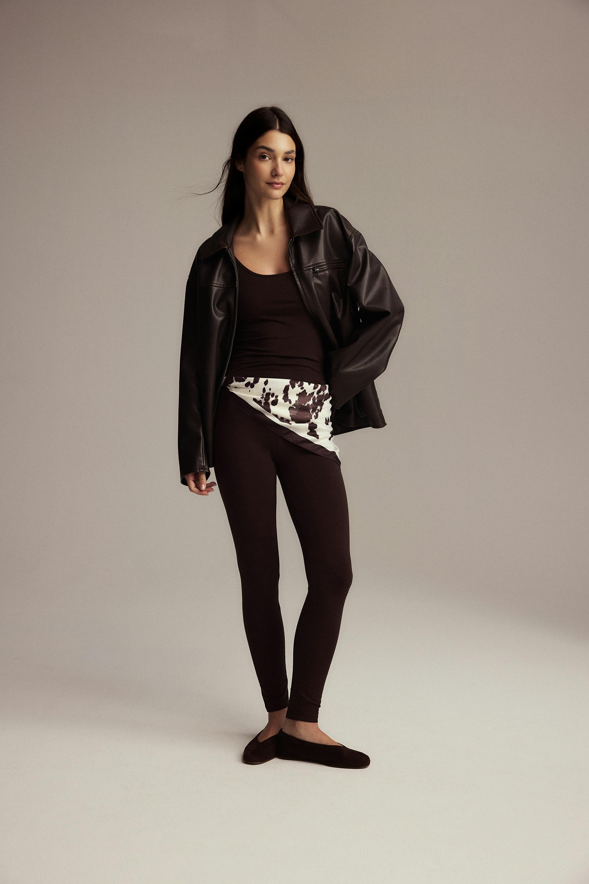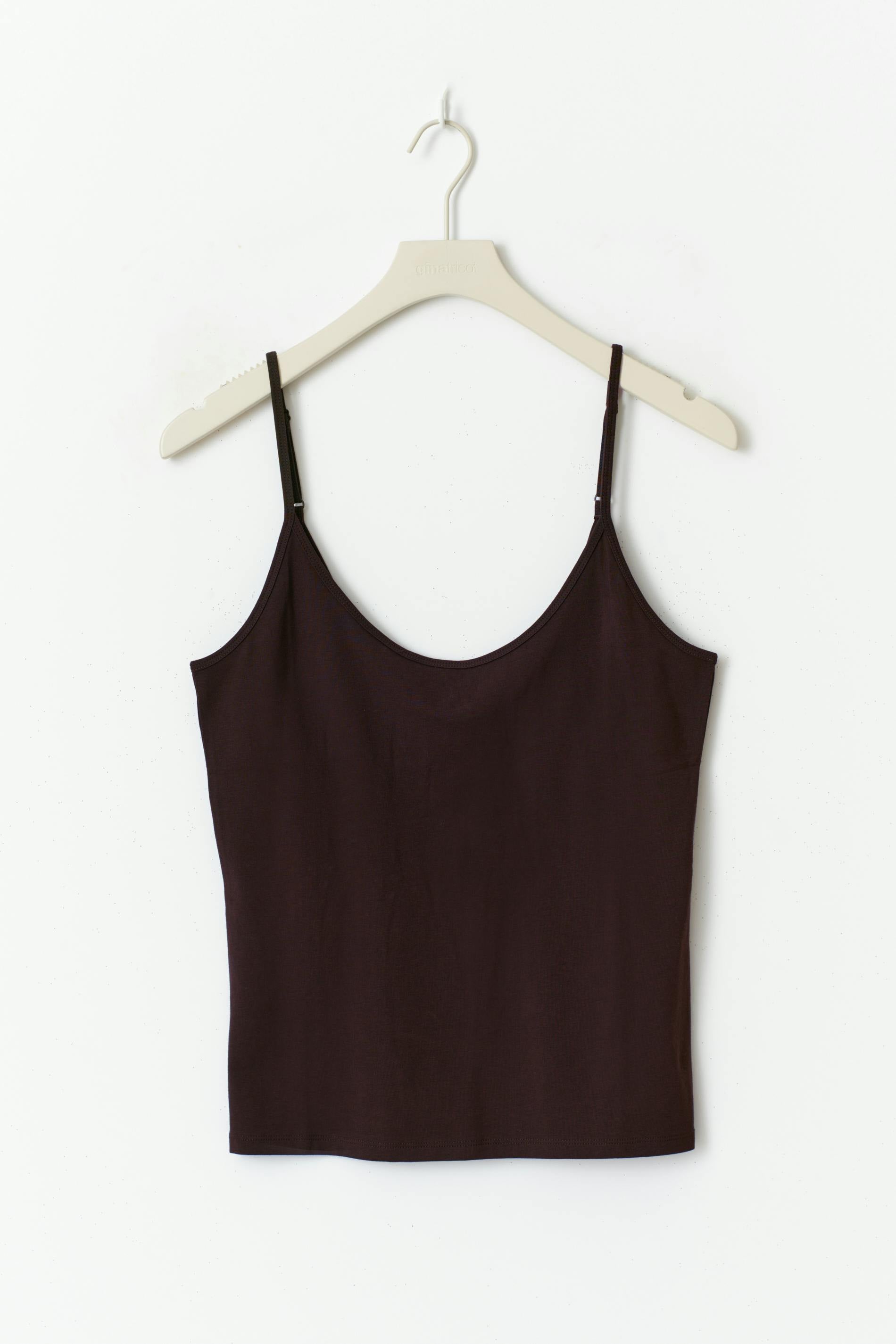 Linne i mjuk trikå med figurnära passform. Linnet är brunt och har tunna, elastiska axelband. Det har normallängd och djup halsringning.