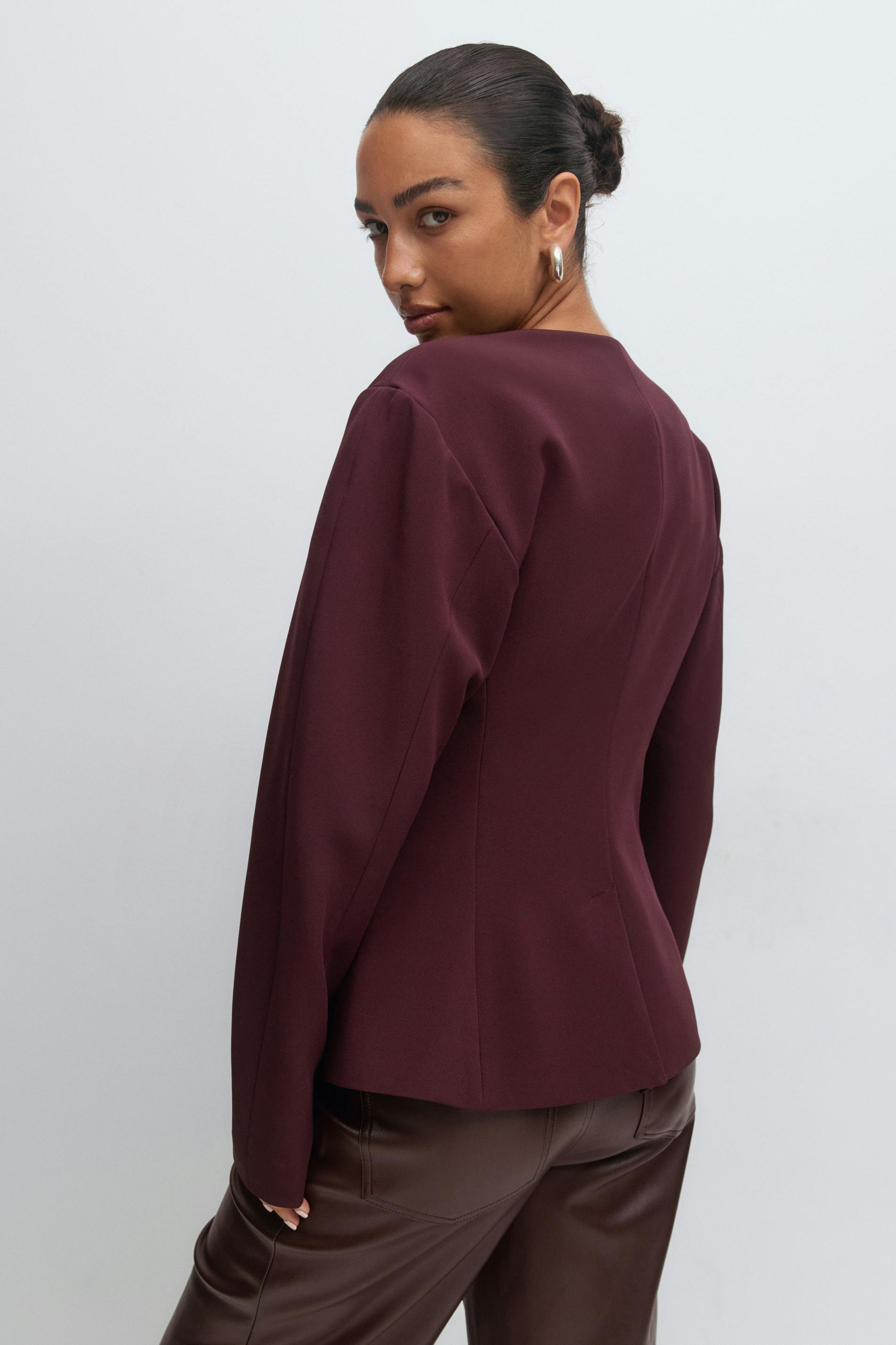 Figursydd kavaj med intagen midja. Jackan är vinröd och har djup halsringning. Den har knäppning med en knapp framtill, figurnära passform, lång ärm och passpolerade fickor i sidorna. Fodrad.