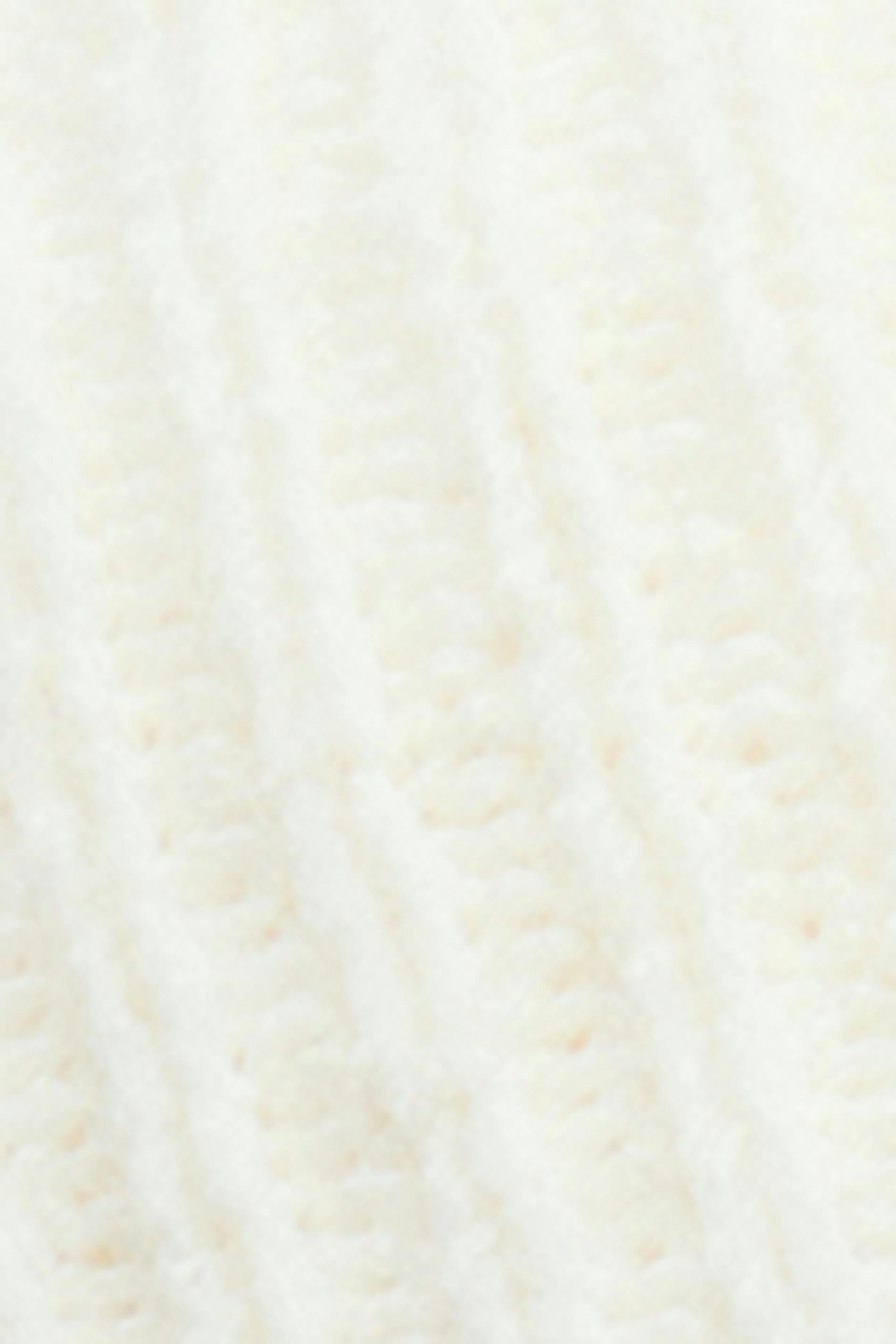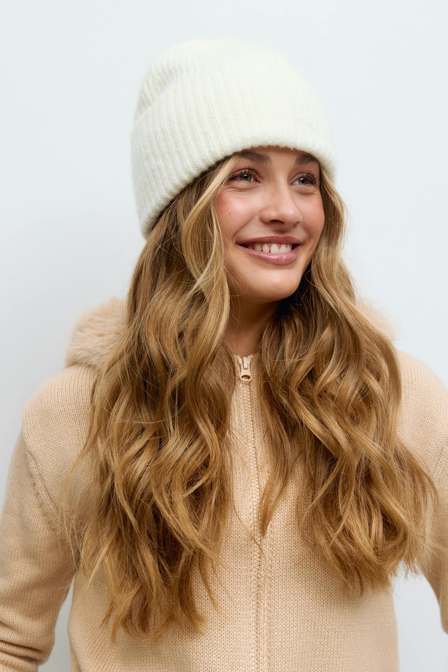 Stickad mössa med bred, uppvikt kant. Mössan är vit och har ribbad kvalitet.