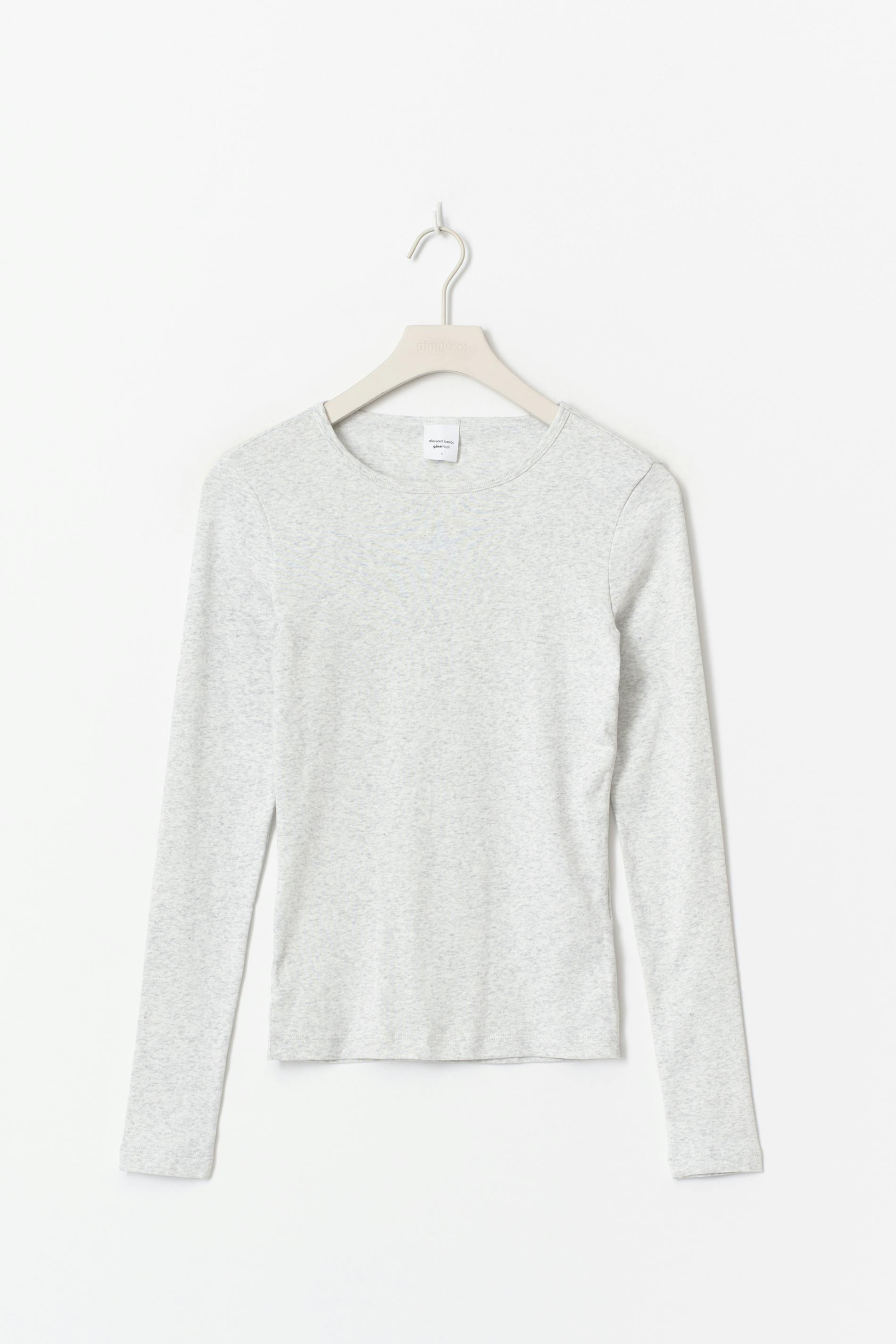 Långärmad topp med ribbad kvalitet. Toppen är grå och har figurnära passform. Den har rund halsringning och normallängd.