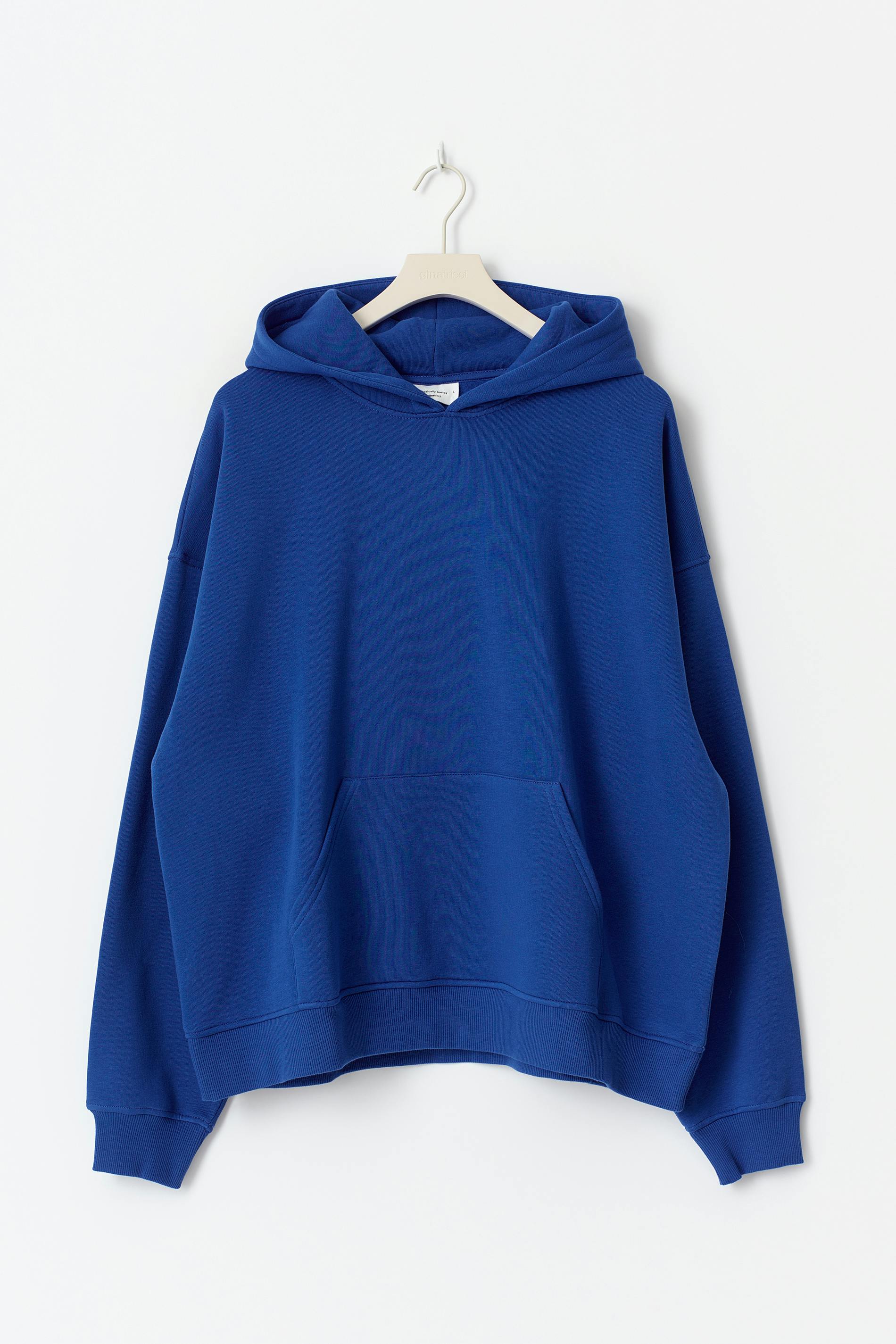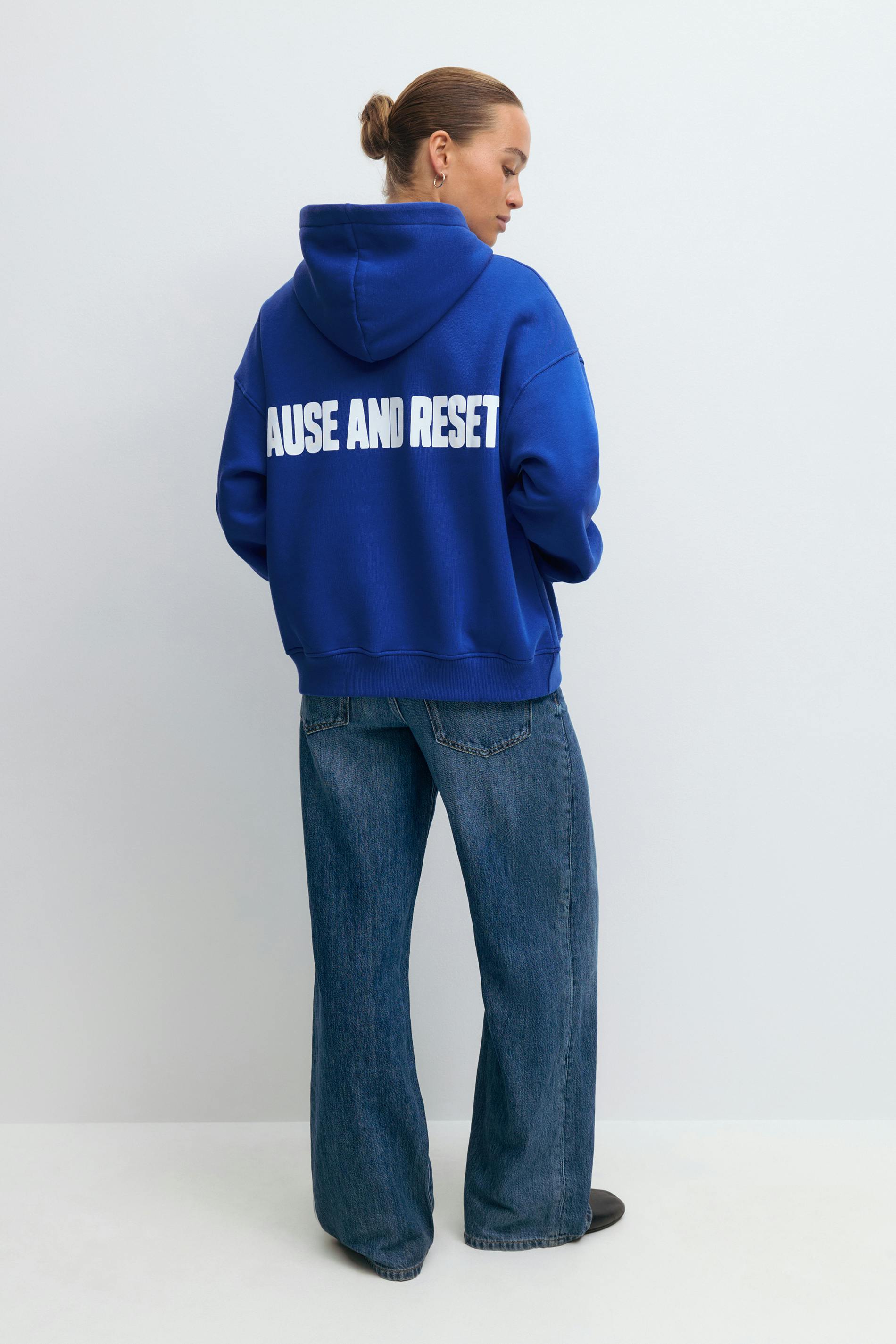 Oversized hoodie med tryck baktill. Hoodien är blå och har fodrad huva. Den har rund halsringning, lång ärm, känguruficka fram och ribbad mudd vid ärmslut och i nederkant. Tryck: Pause and reset. Fodrad.