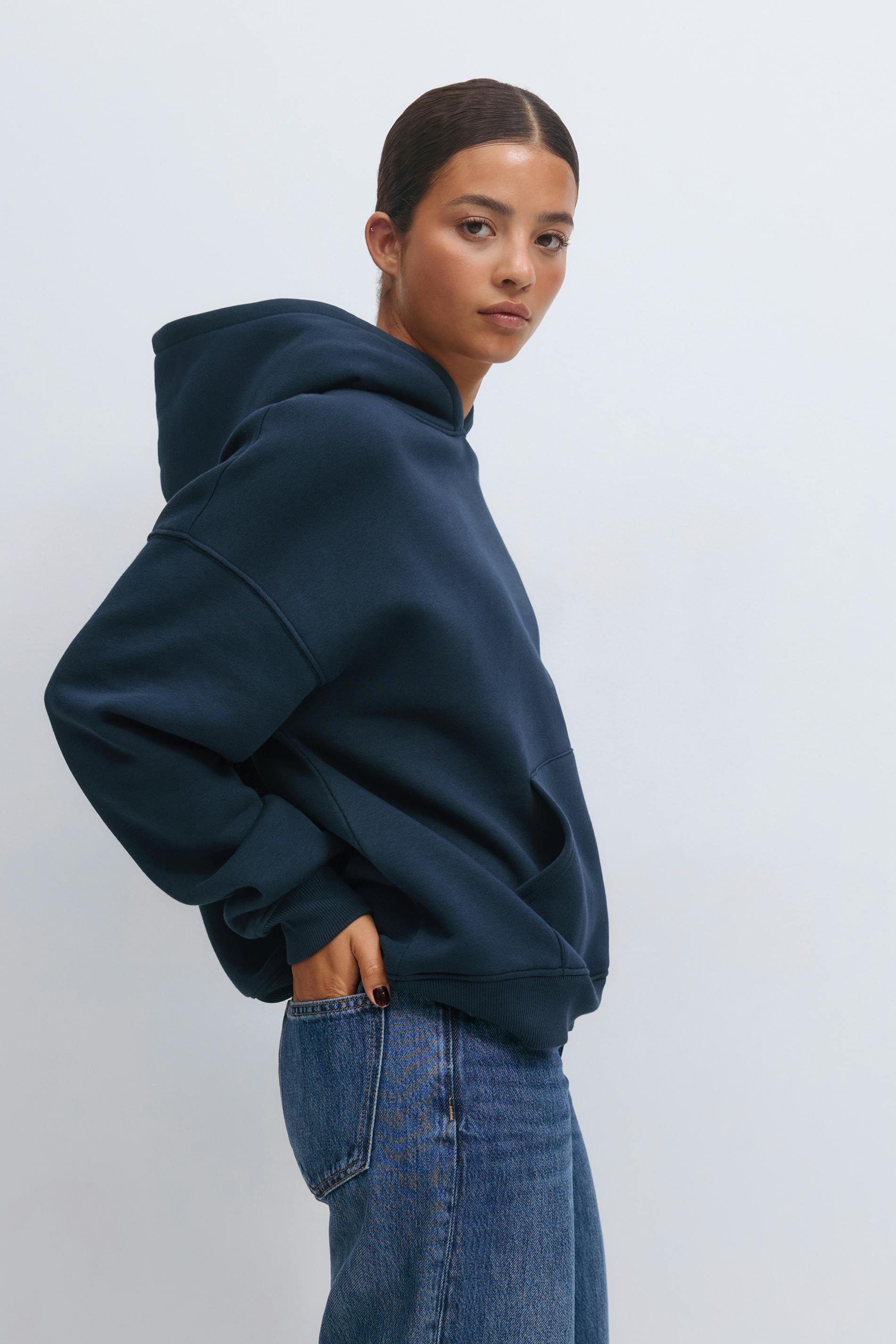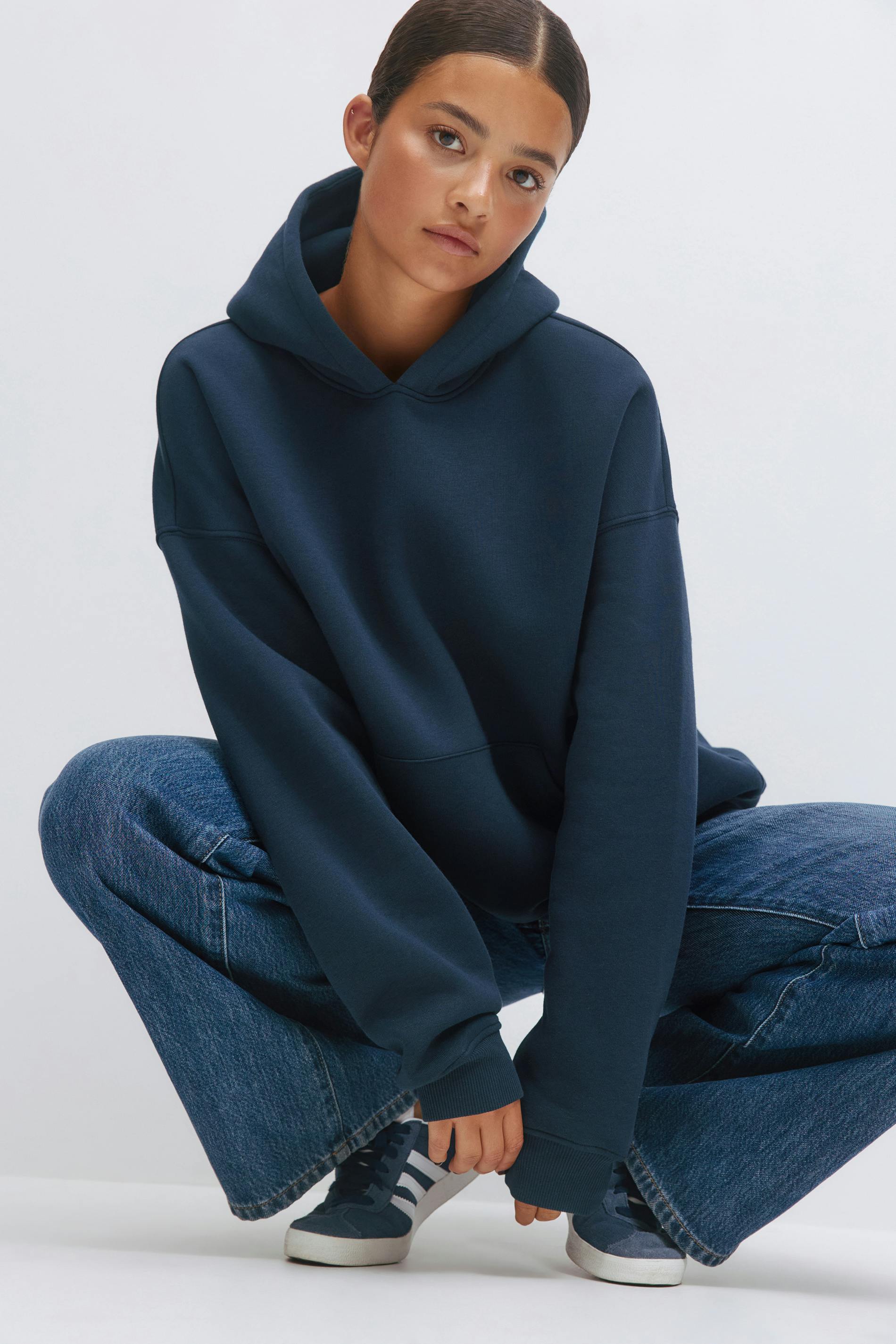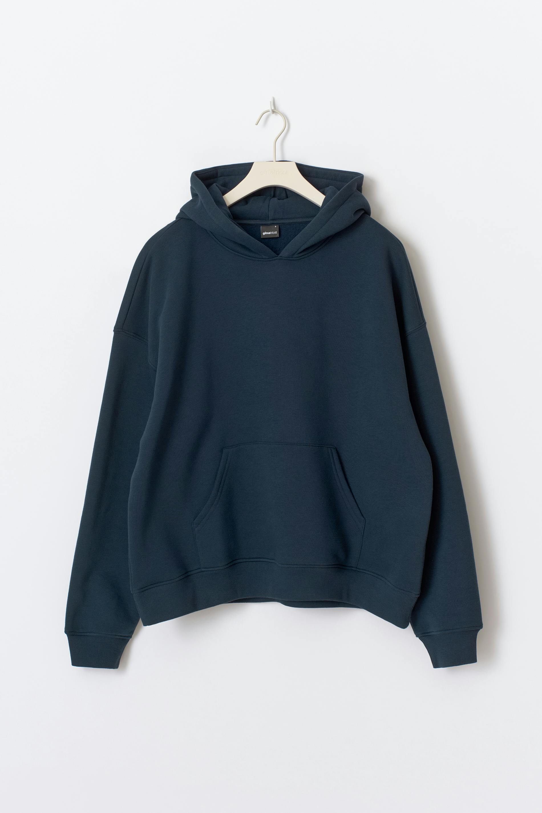 Oversized hoodie med tryck på ryggen. Hoodien är mörkblå och har fodrad huva. Den har rund halsringning, lång ärm, känguruficka fram och ribbad mudd vid ärmslut och i nederkant. Fodrad.