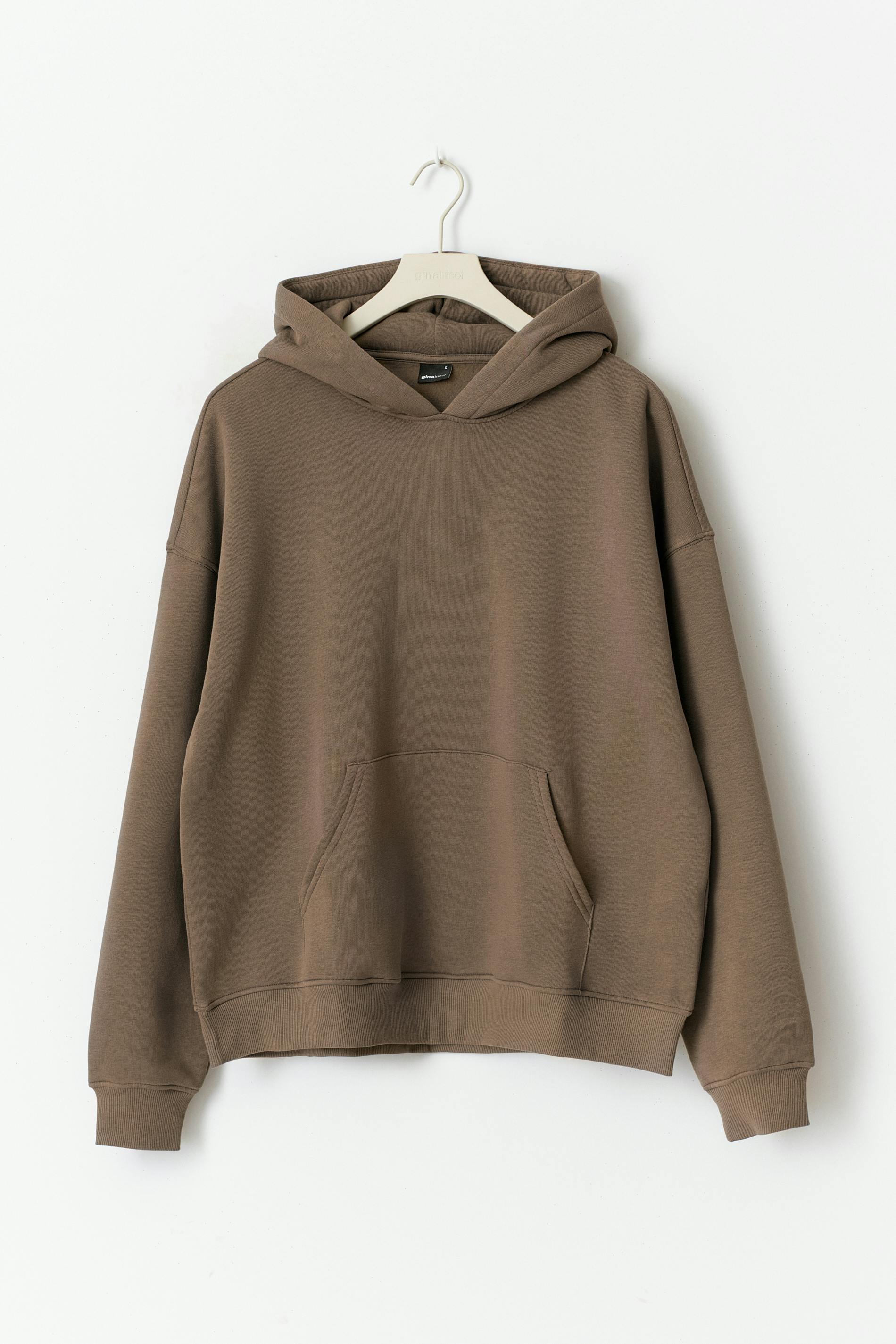 Oversized hoodie with print at the back. The hoodie is brown and has lined hood. It has round neckline, long sleeve, kangaroo pocket at the front and ribbing at sleeve ends and at the bottom. Print: Coffee & Croissants. Lined.