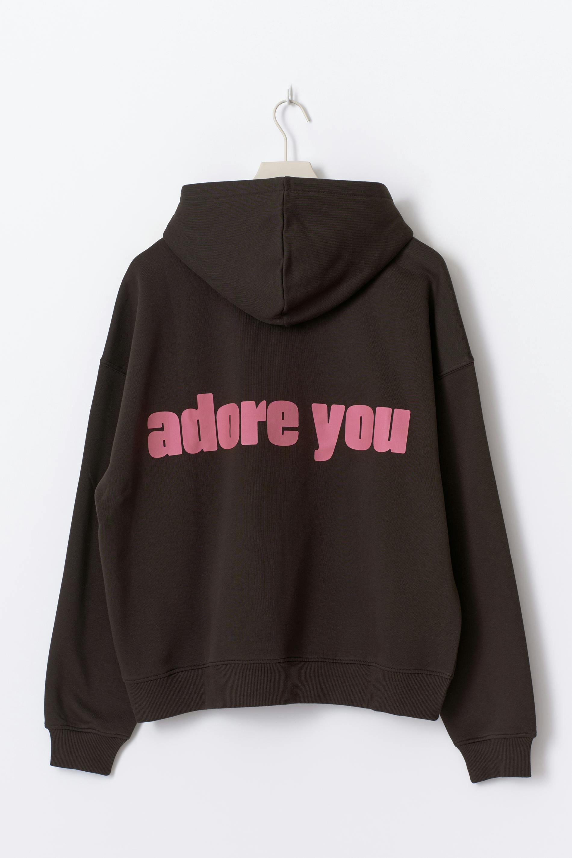 Oversized hoodie med tryck på ryggen. Hoodien är brun och har fodrad huva. Den har rund halsringning, lång ärm, känguruficka fram och ribbad mudd vid ärmslut och i nederkant. Fodrad.