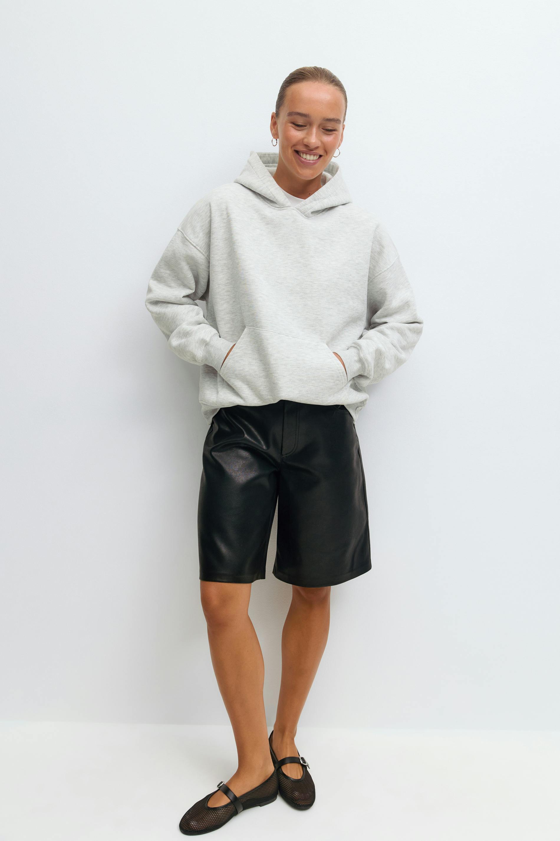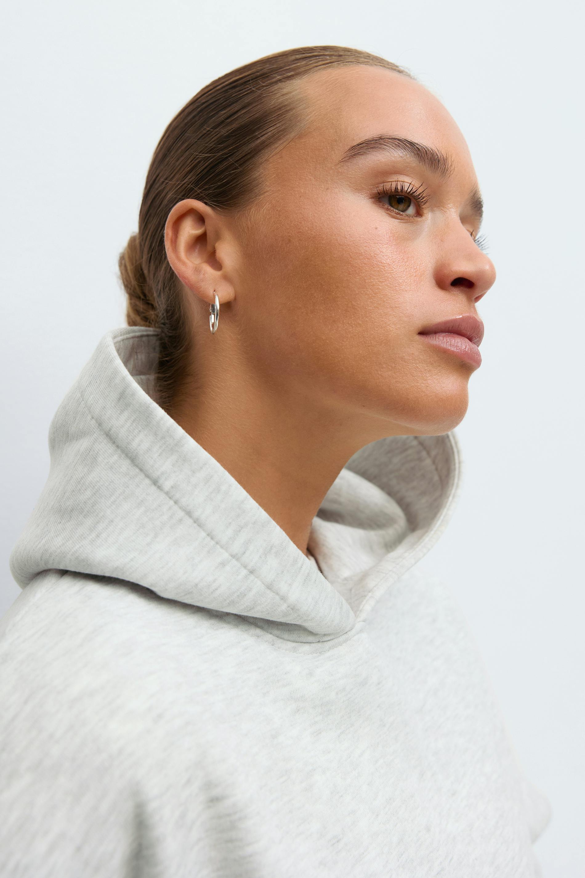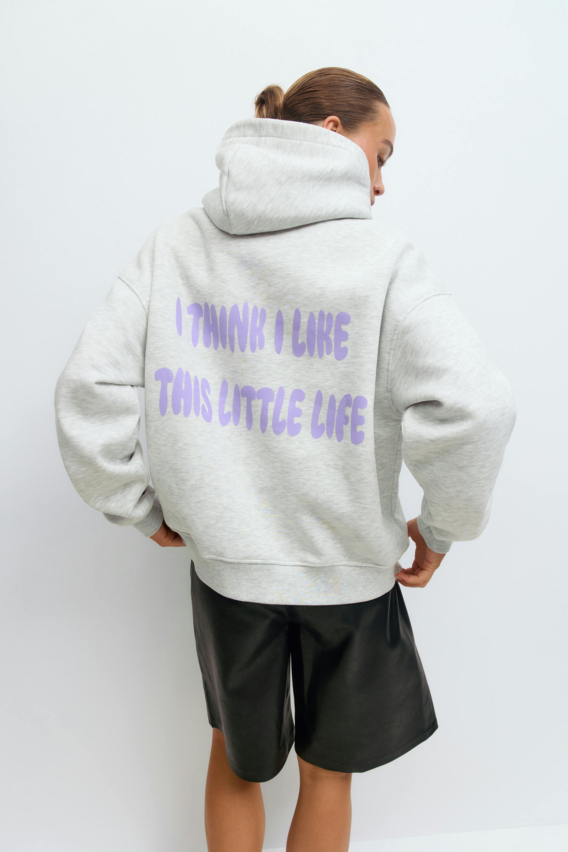 Oversized hoodie med tryck baktill. Hoodien är grå och har fodrad huva. Den har rund halsringning, lång ärm, känguruficka fram och ribbad mudd vid ärmslut och i nederkant. Tryck: I think I like this little life. Fodrad.
