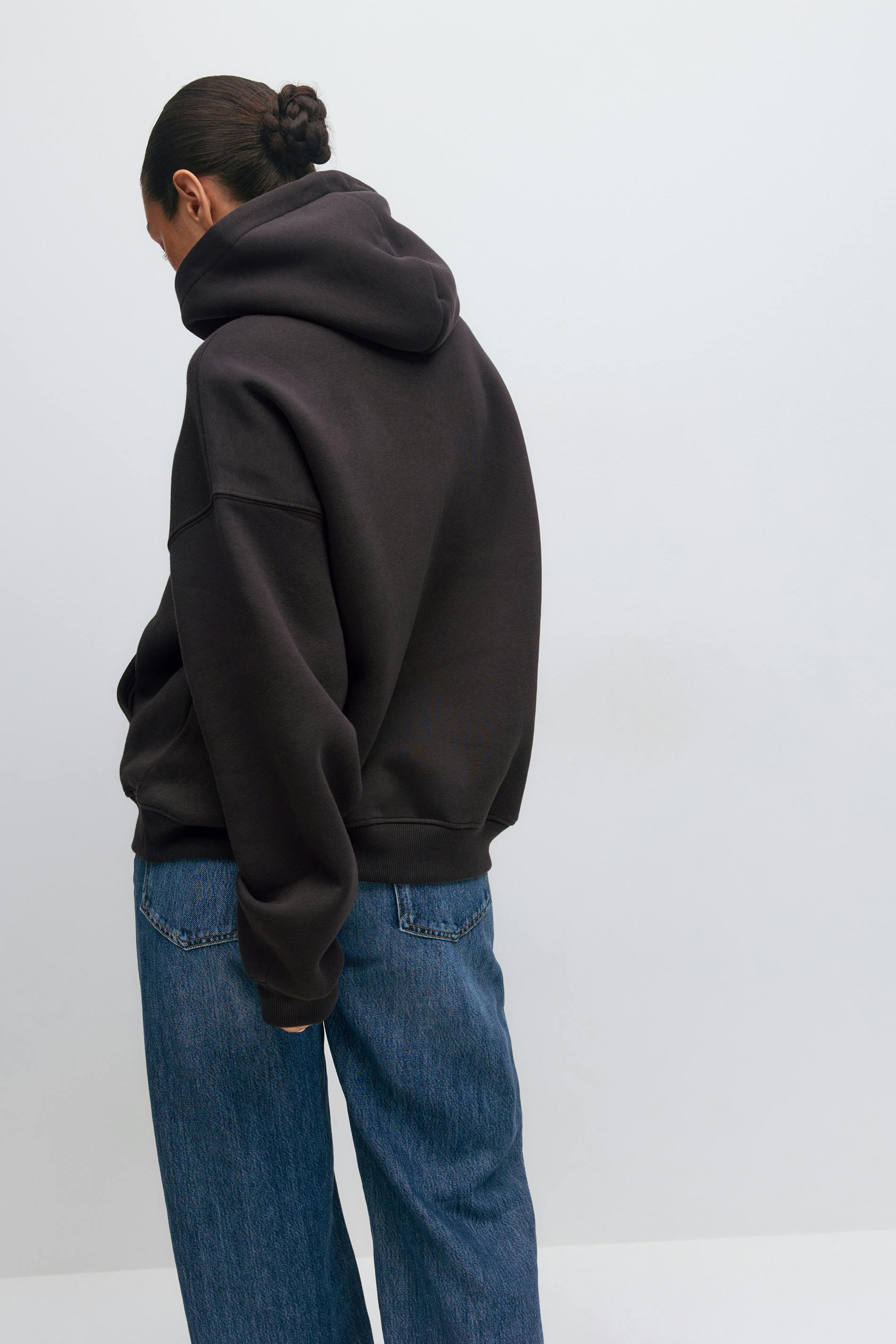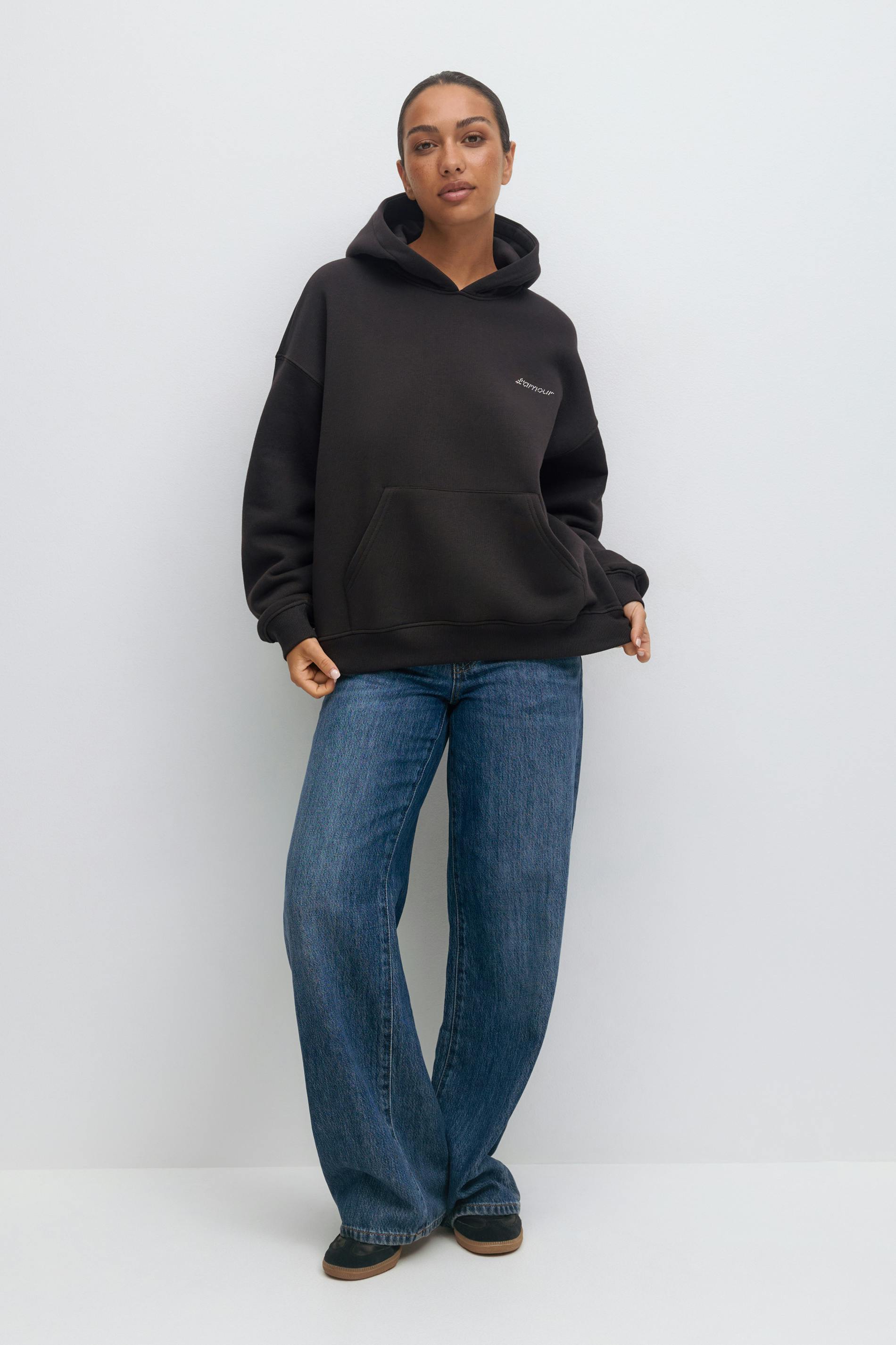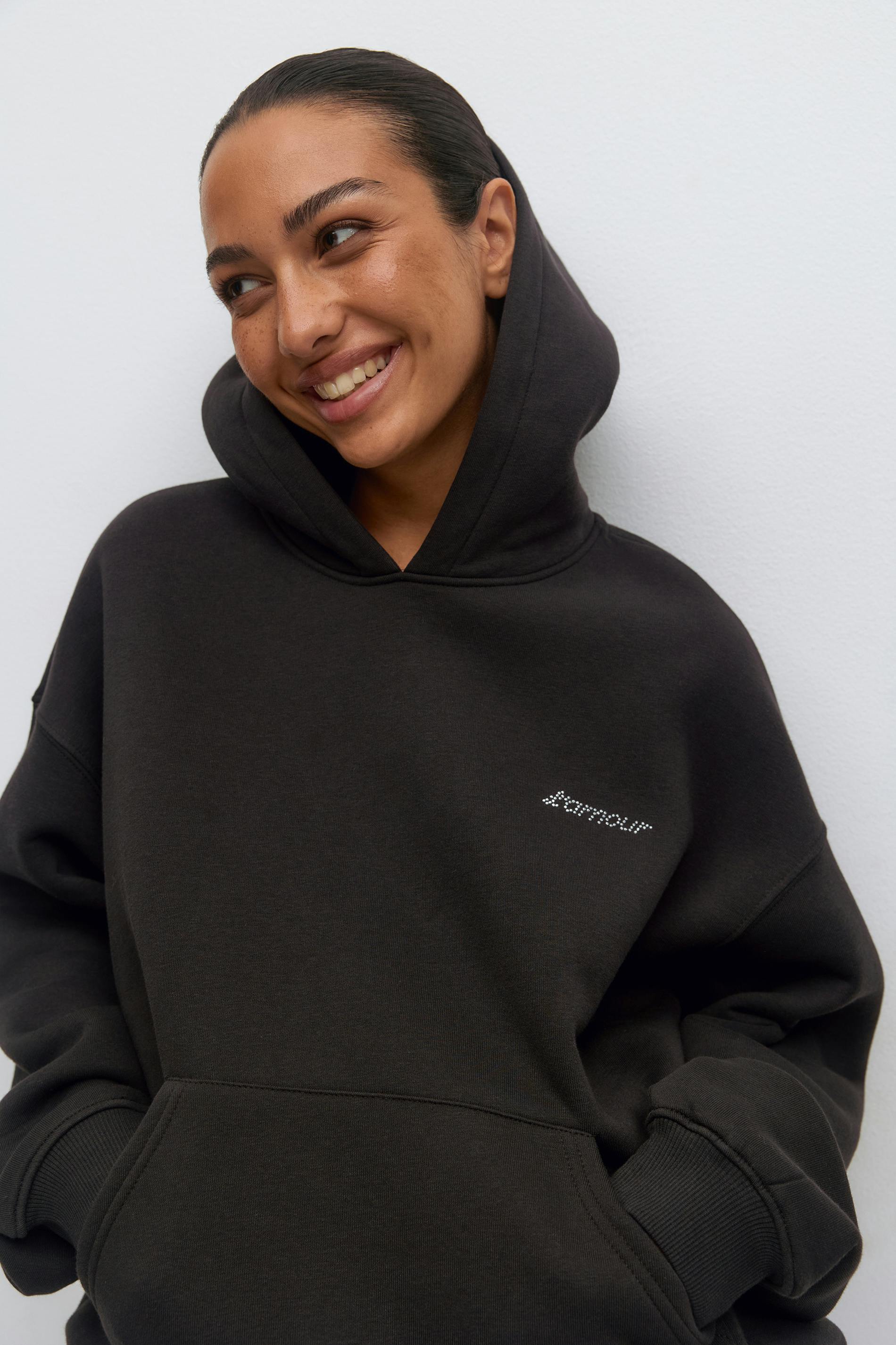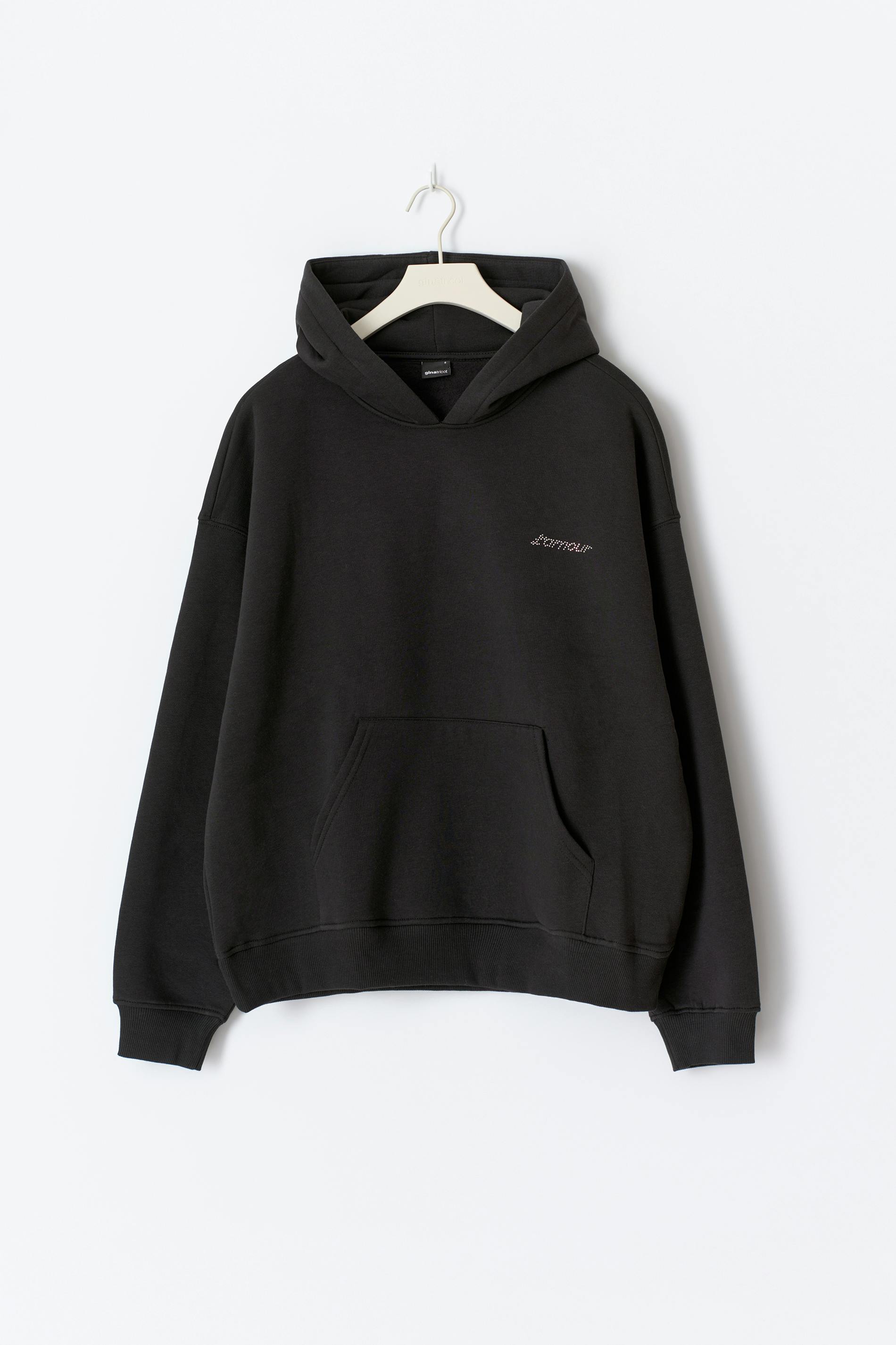 Oversized hoodie med tryck på bröstet. Hoodien är svart och har fodrad huva. Den har rund halsringning, lång ärm, känguruficka fram och ribbad mudd vid ärmslut och i nederkant. Tryck: l'amour. Fodrad.