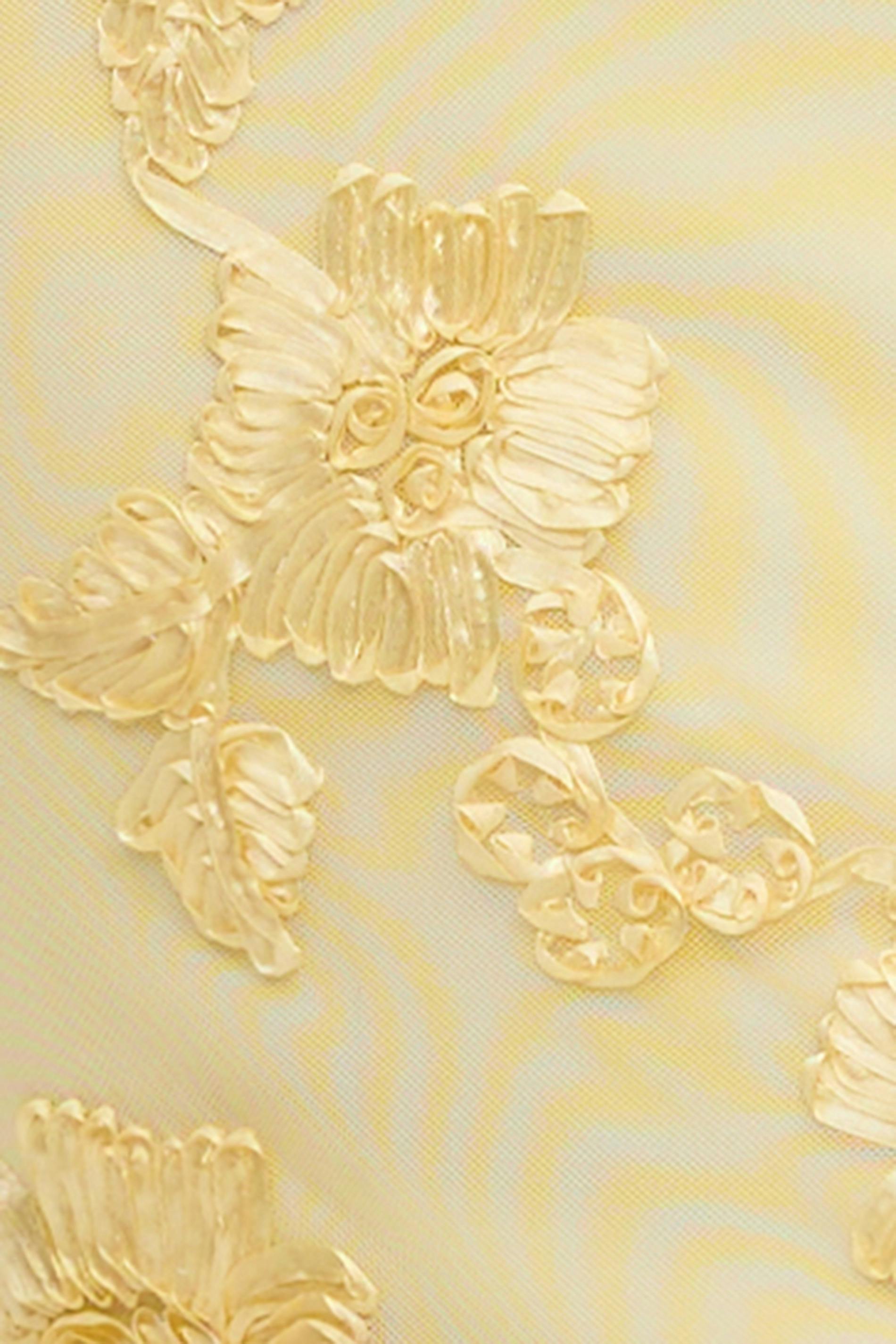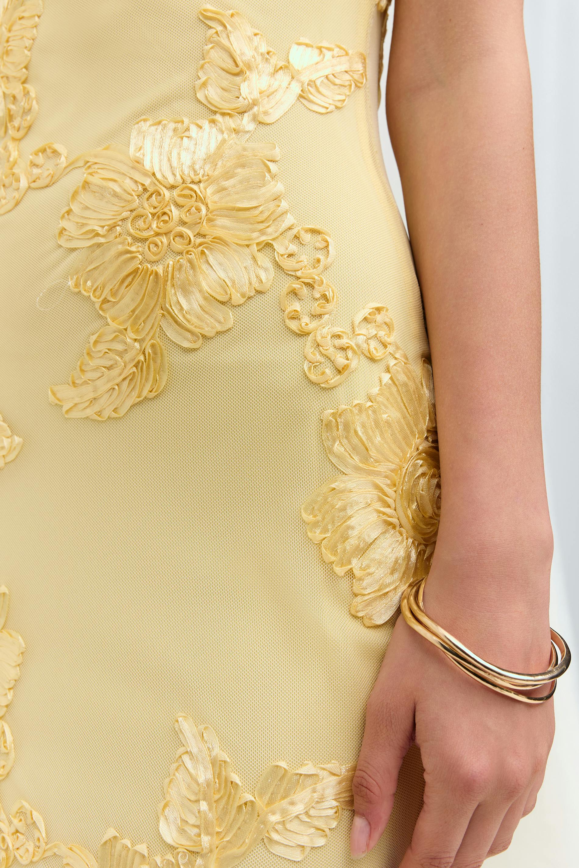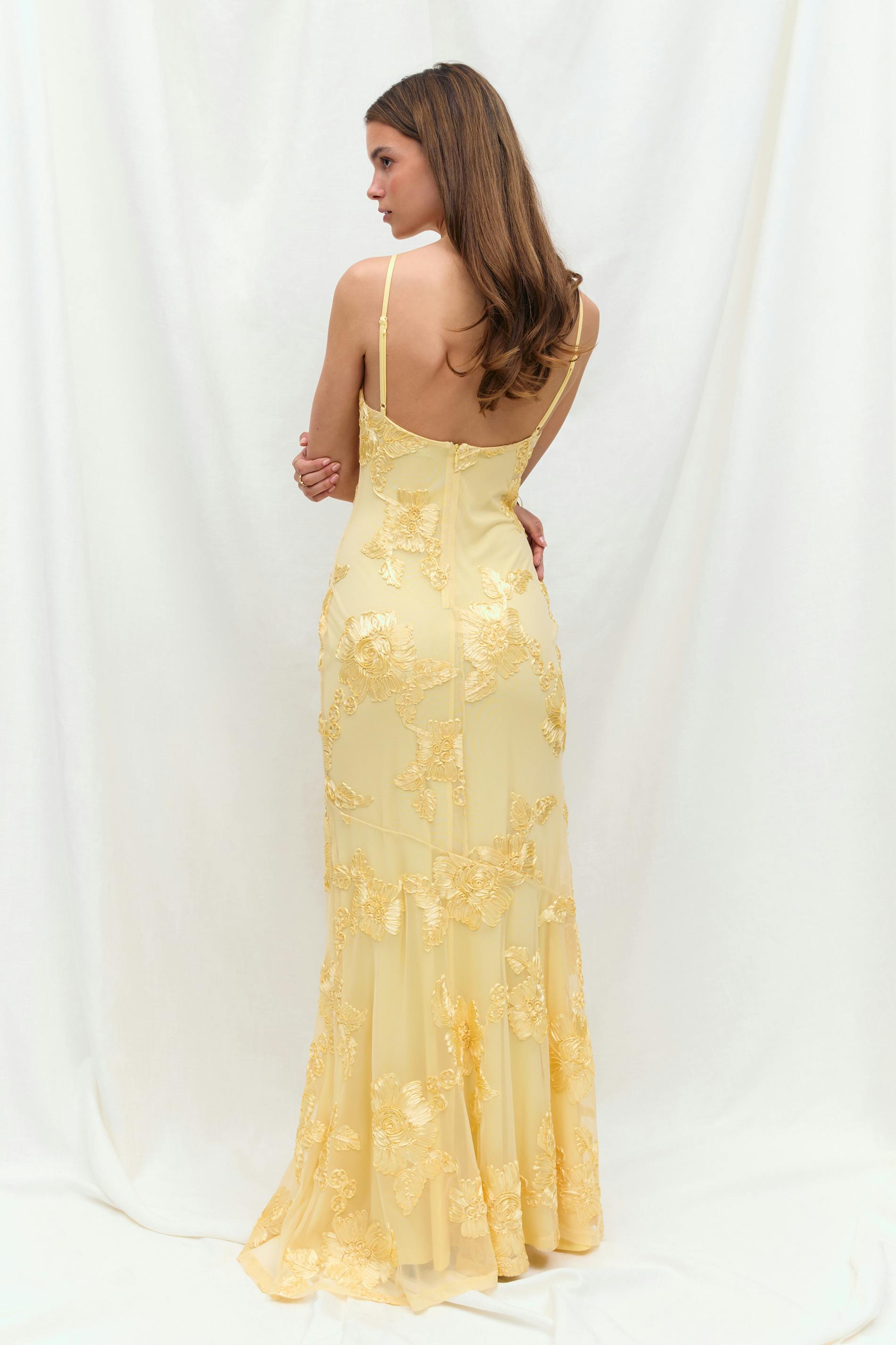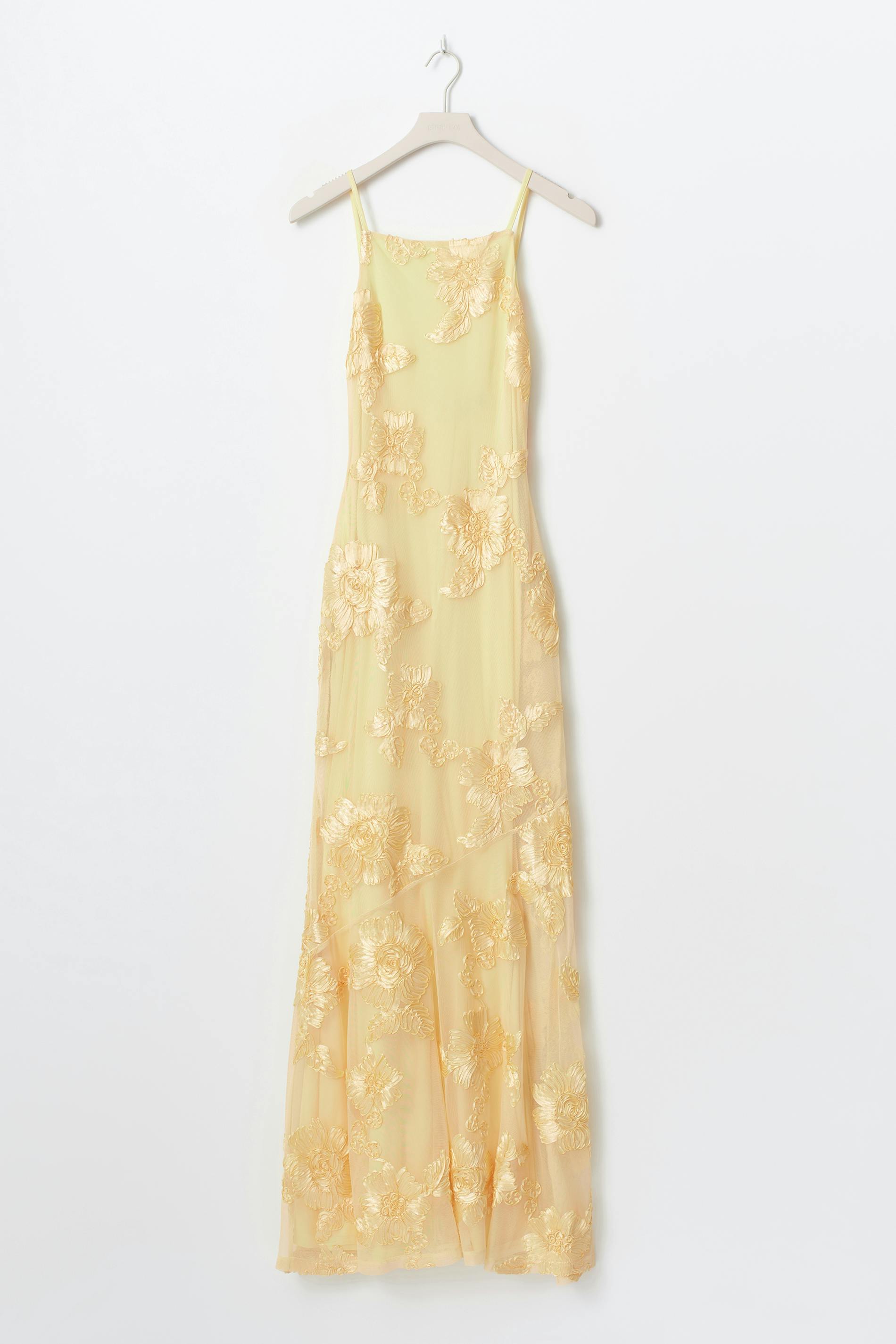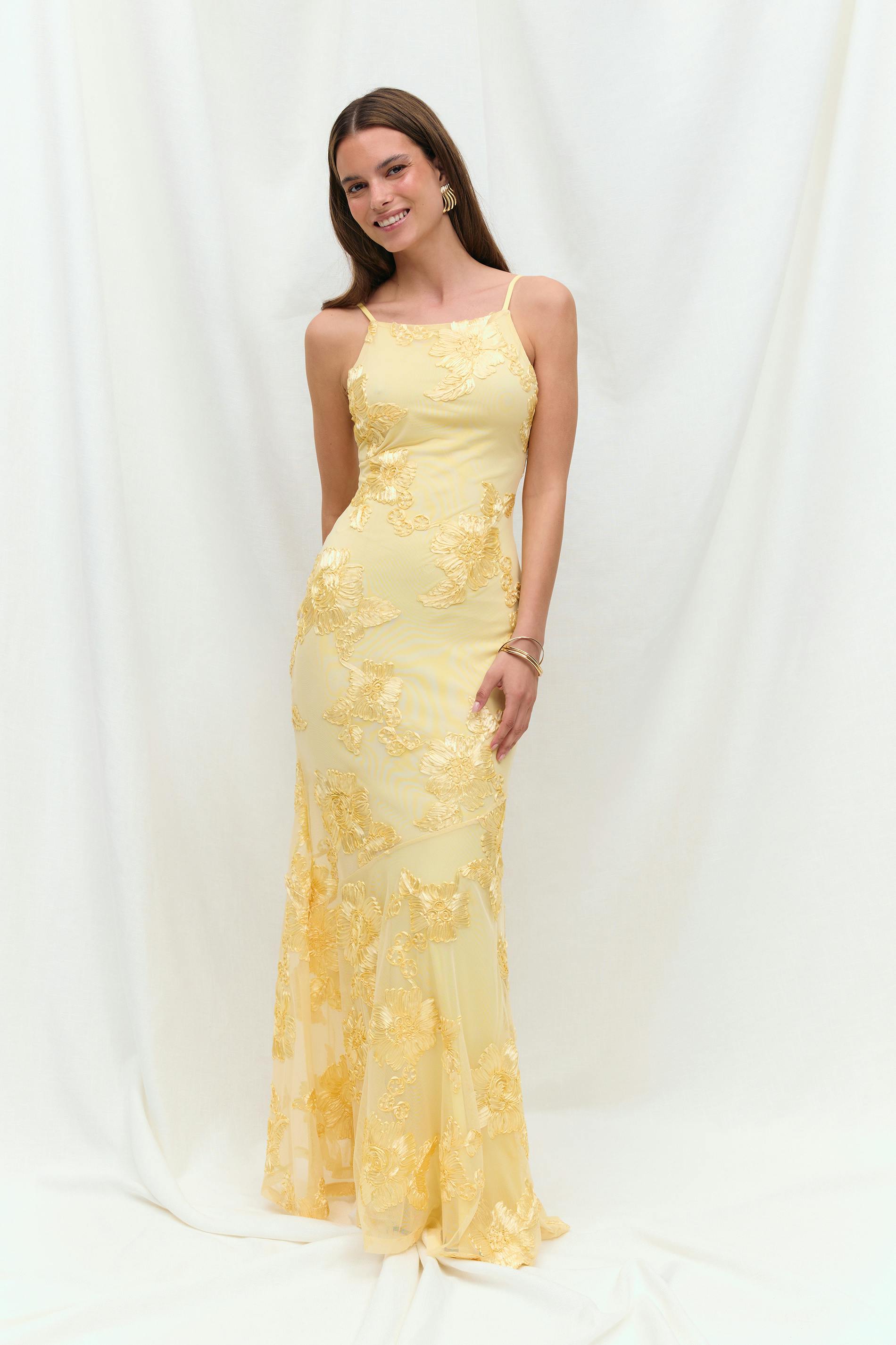 Sleeveless maxi dress with embroidered details. The dress is yellow and fully lined and has a square neckline. It has adjustable shoulder straps and a zip on the back.