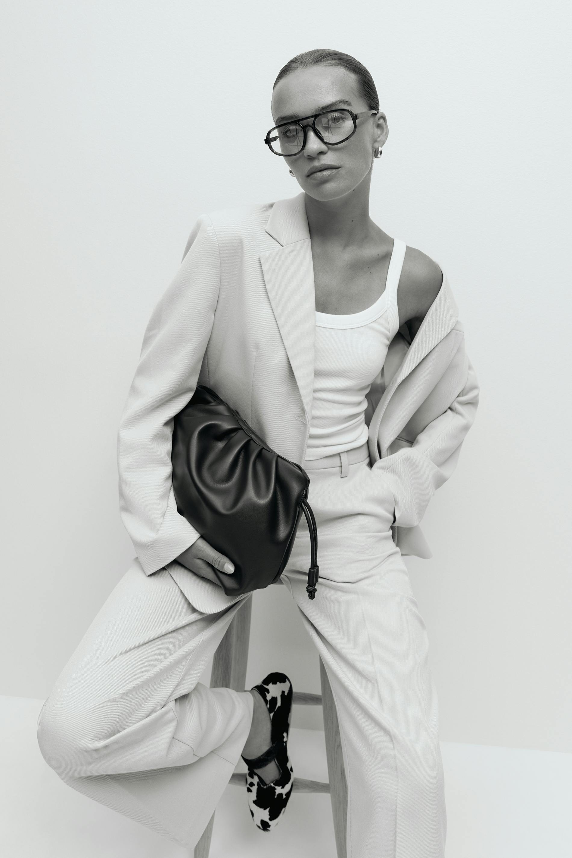 Oversized kavaj med knäppning fram. Jackan är beige och har krage med slag. Den har fickor i sidorna, lång ärm, bröstficka och normallängd.