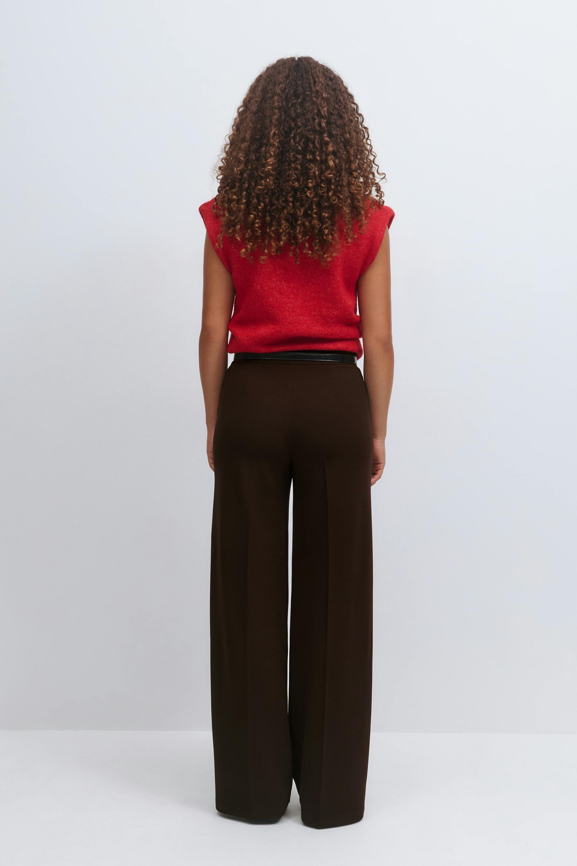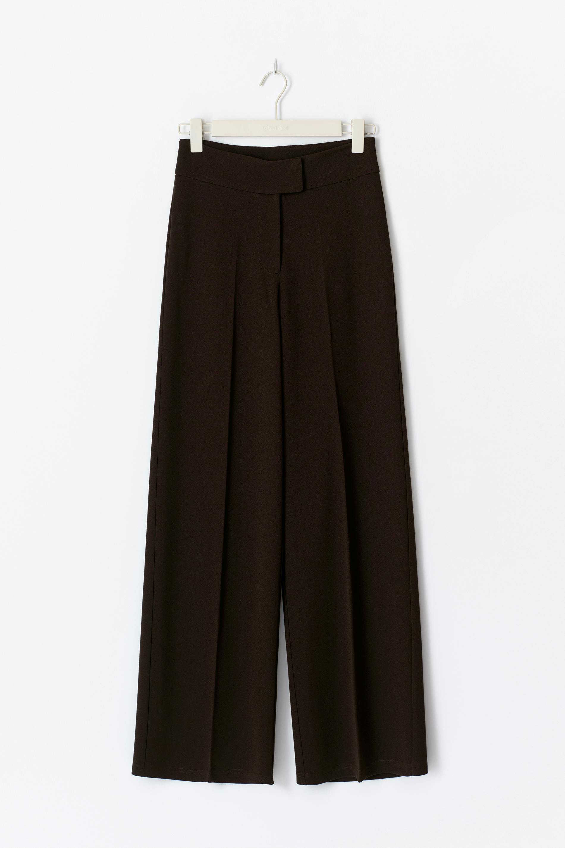 Raka byxor med fullängd. Byxan är brun och har en medelhög midja. Den har en hysk- och hakestängning och en dragkedjegylf.