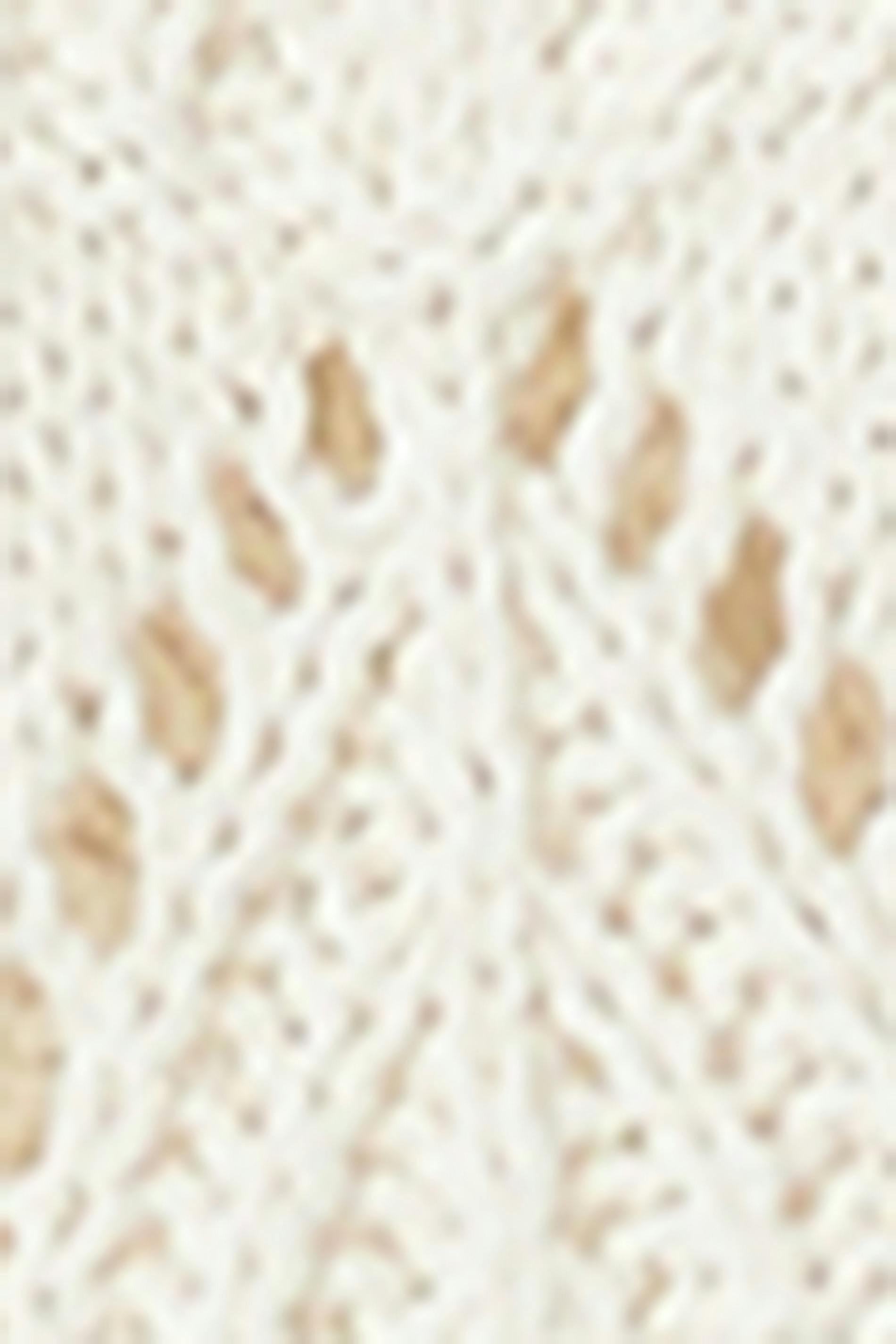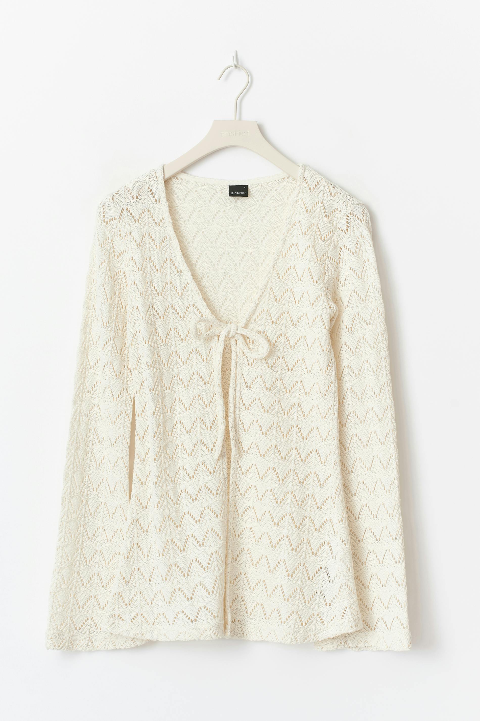 Crocheted cardigan with long, flared sleeves. The cardigan is white and has self-tie at the front. It has v-neck and a wavy pattern.
