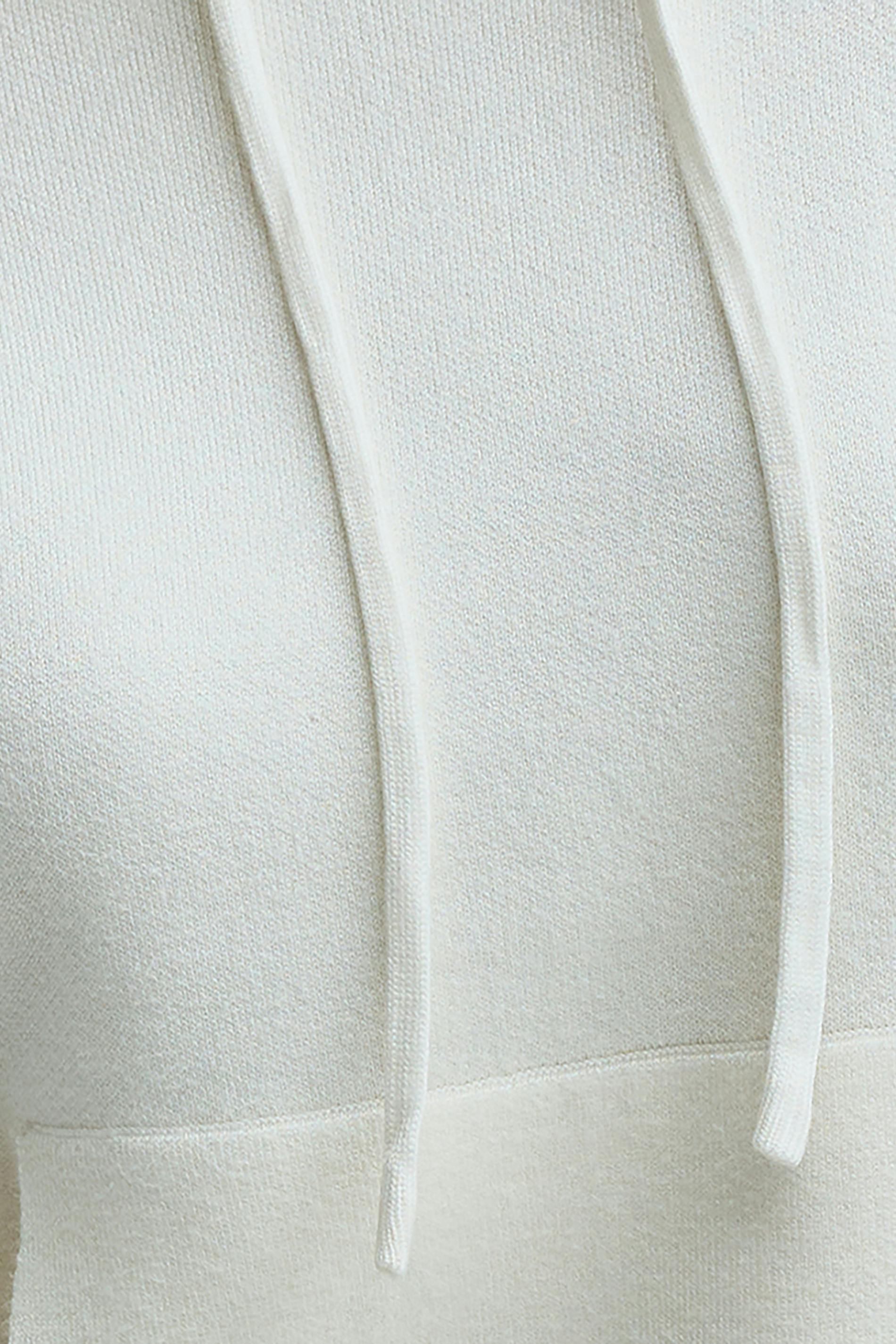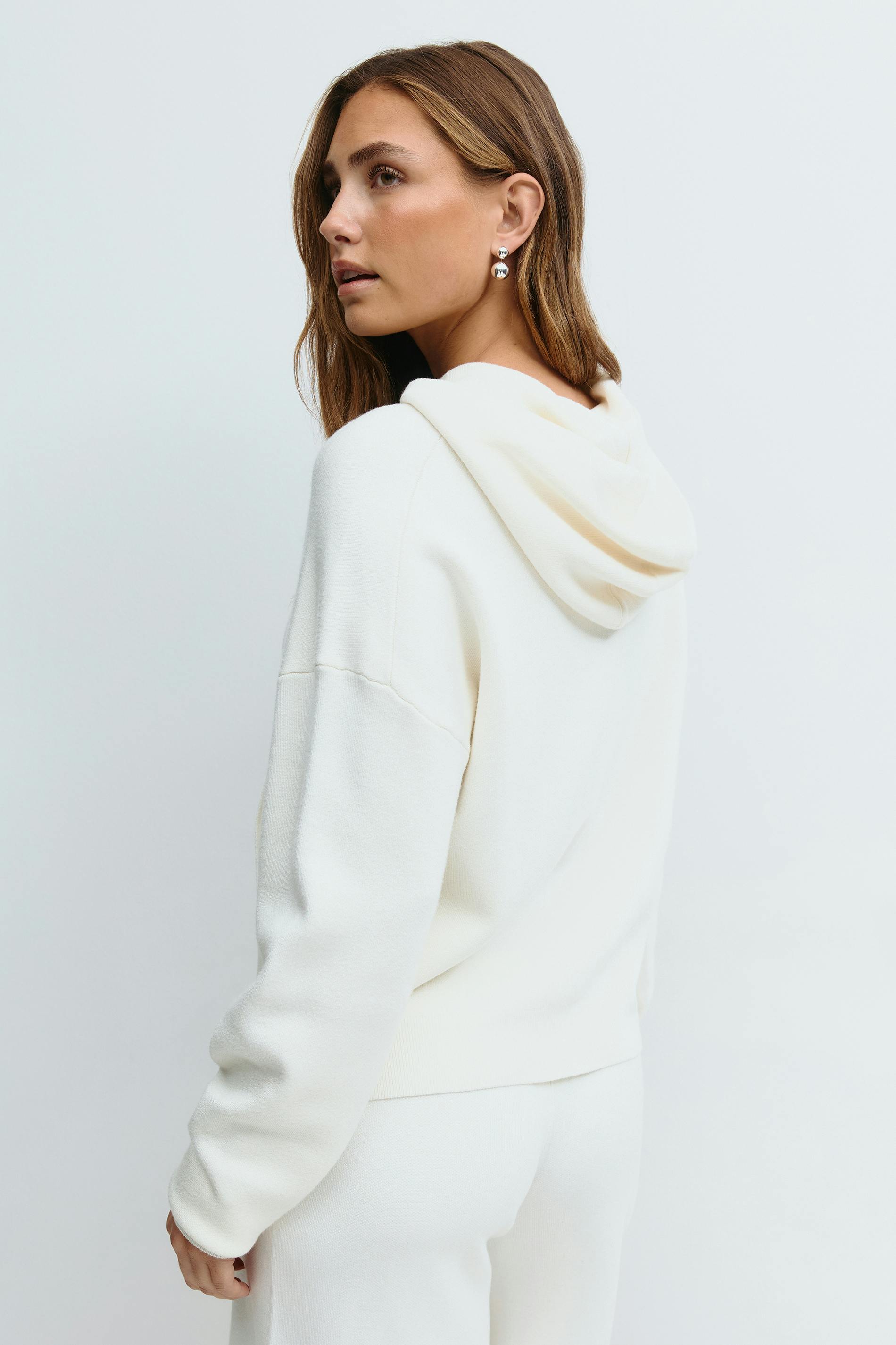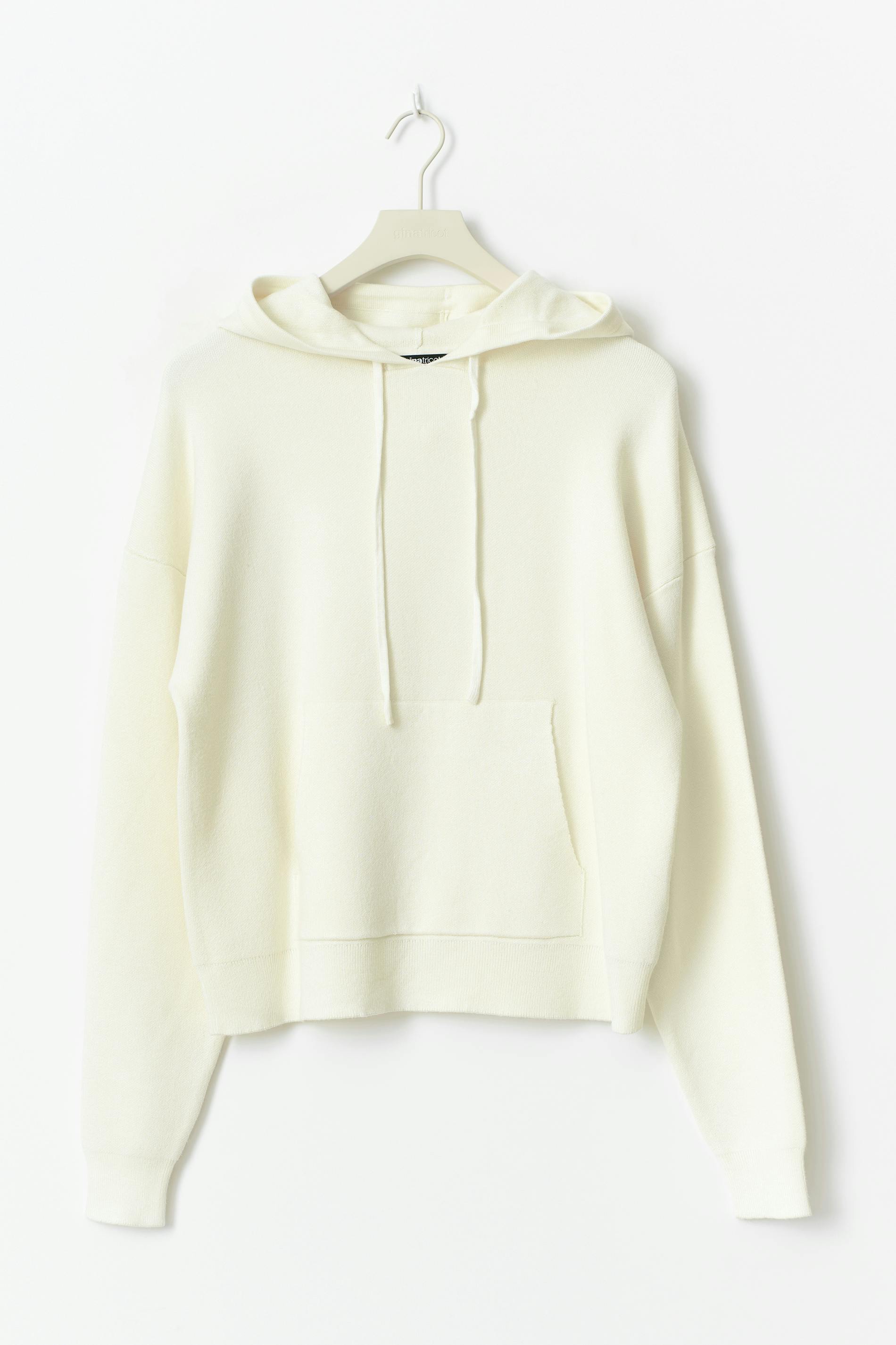 Stickad hoodie med oversize fit. Hoodien är vit och har huva med dragskor. Den har långa ärmar, rund halsringning, nedhasad axel, stor ficka på magen och ribbstickning vid ärmslut och i nederkant.