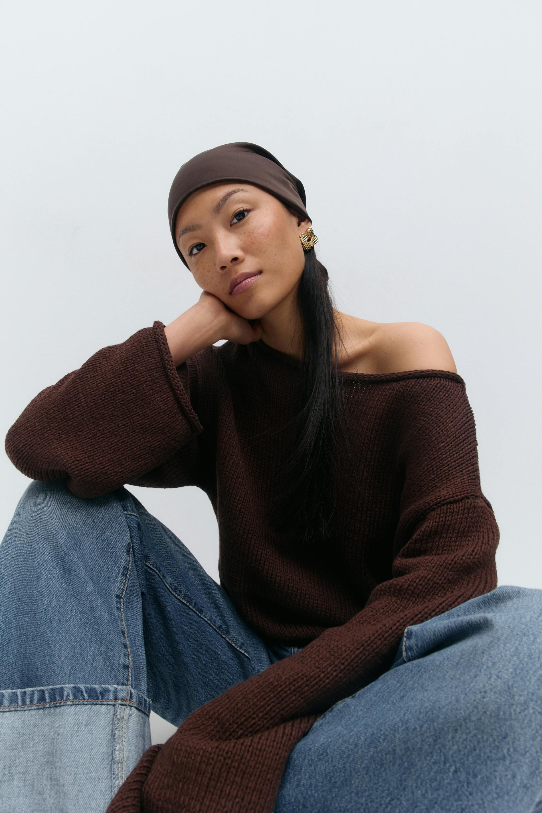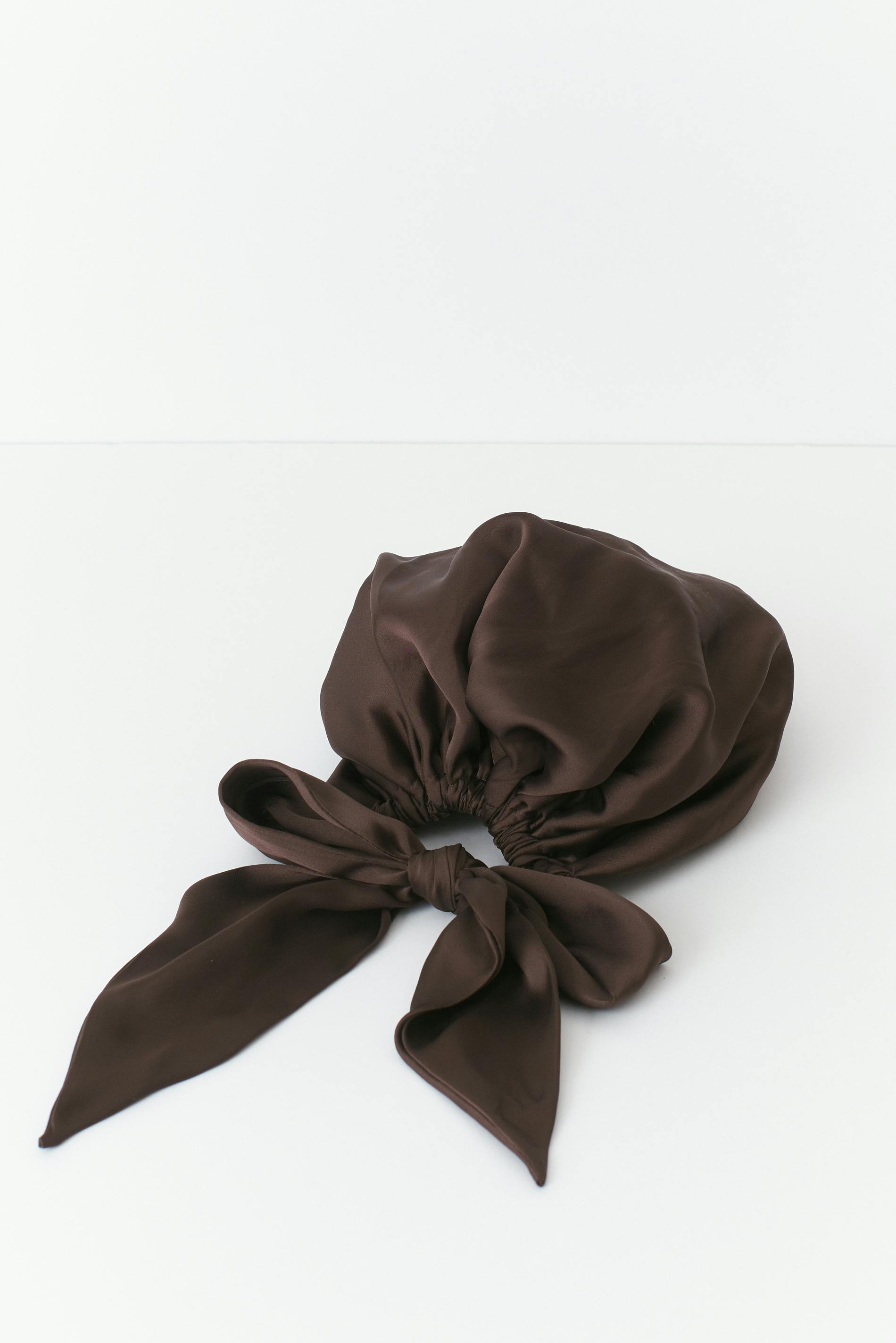 Scarf in satin with ties. The scarf is brown and has elastic at the back.