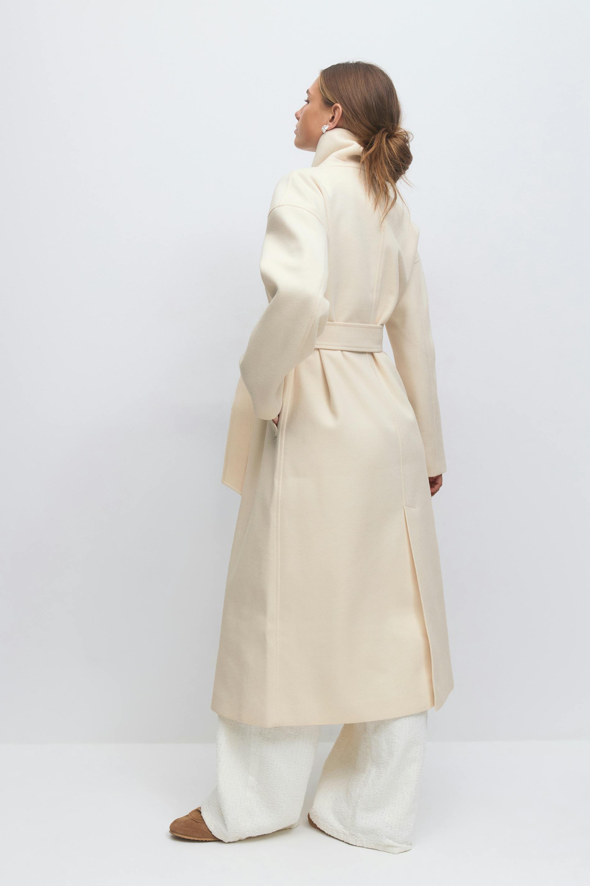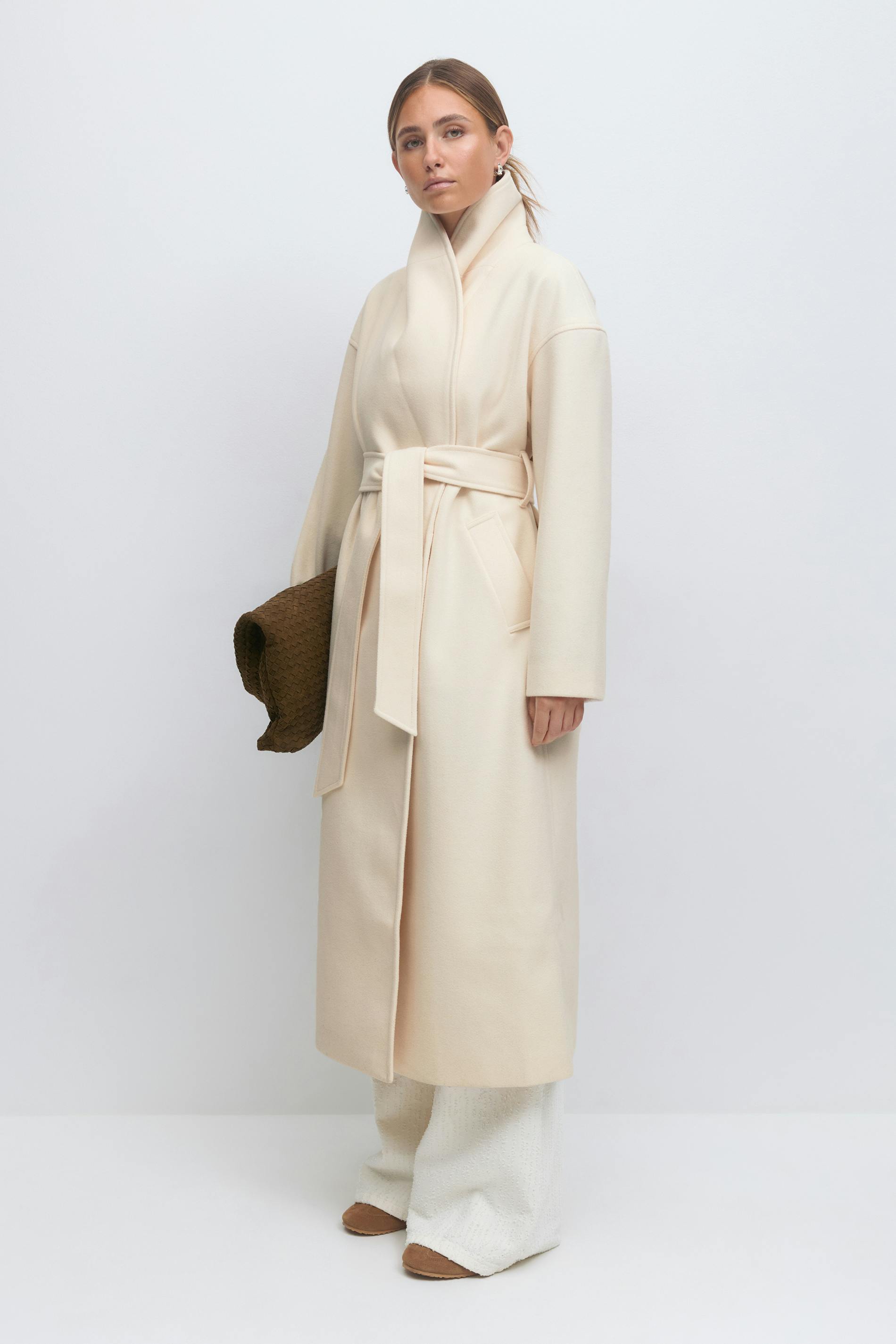 Lång kappa med knytskärp i midjan. Kappan är krämfärgad och har oversize fit. Den har fickor i sidorna, sjalkrage, dold knäppning framtill och slits bak.
