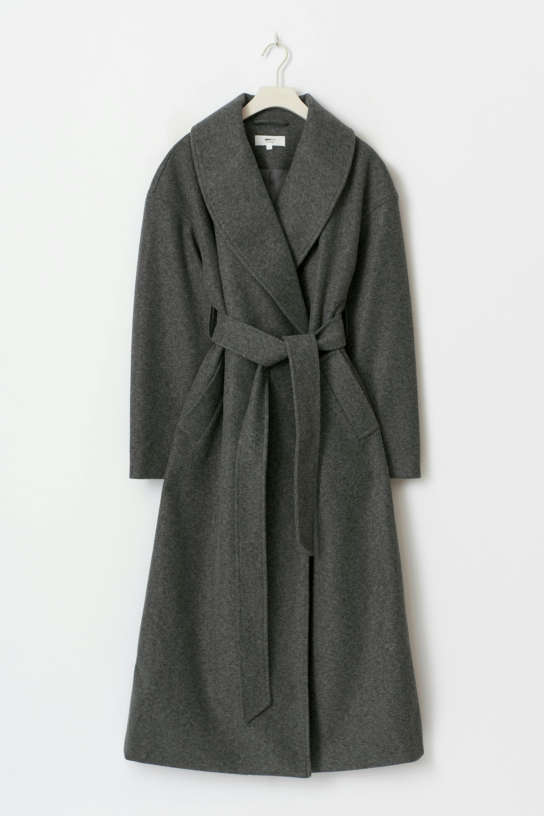 Lång kappa med knytskärp i midjan. Kappan är grå och har oversize fit. Den har fickor i sidorna, sjalkrage, dold knäppning framtill och slits bak.