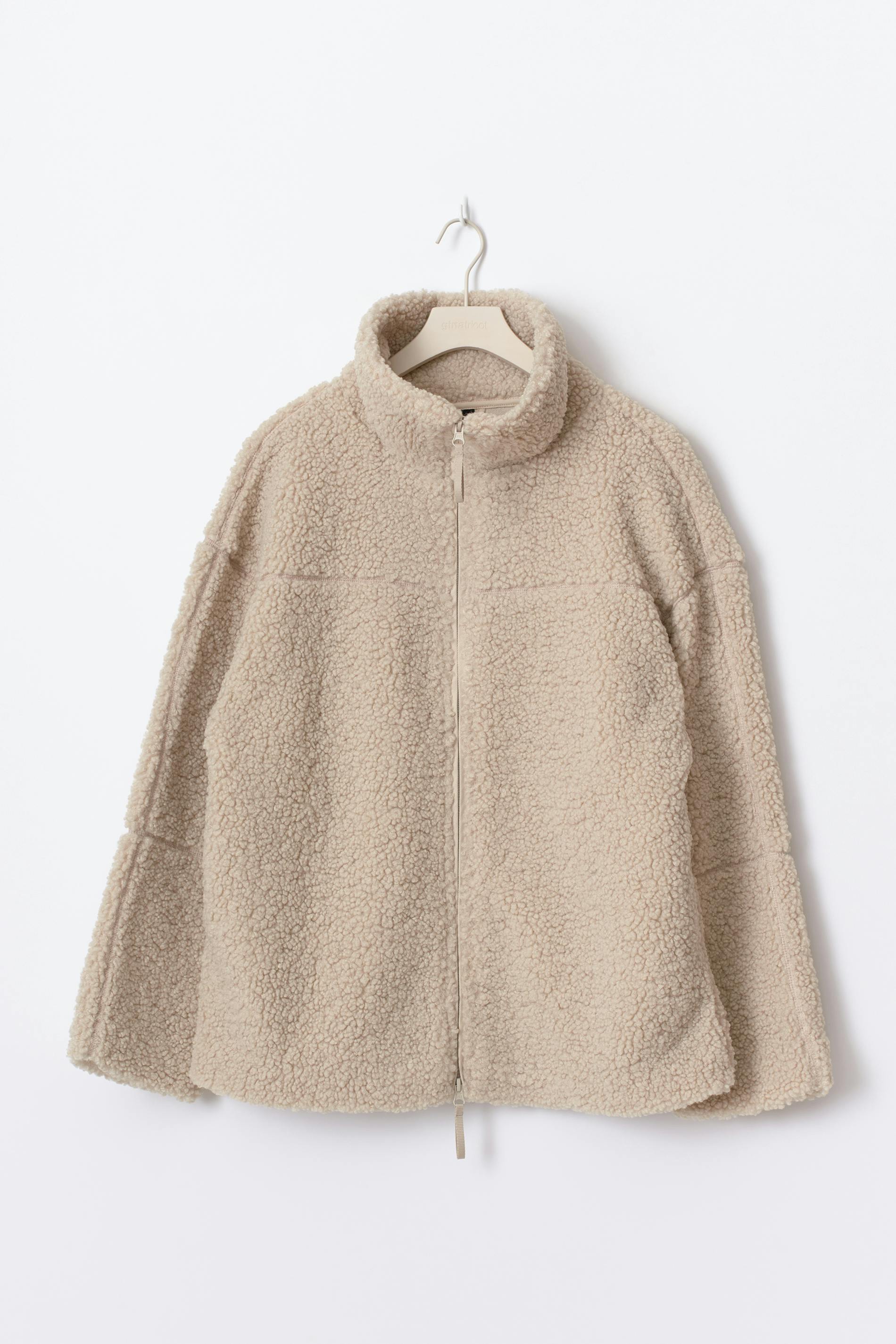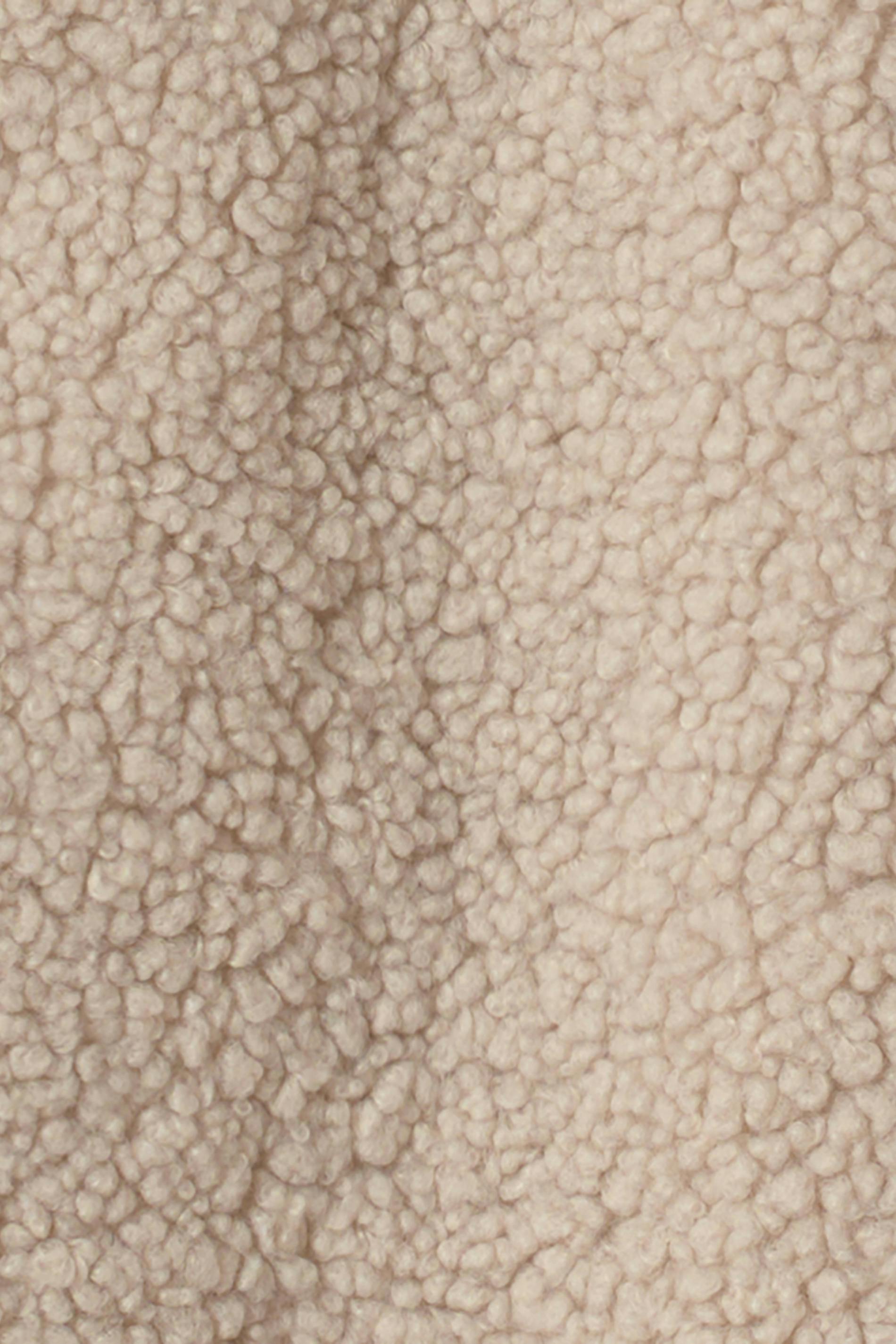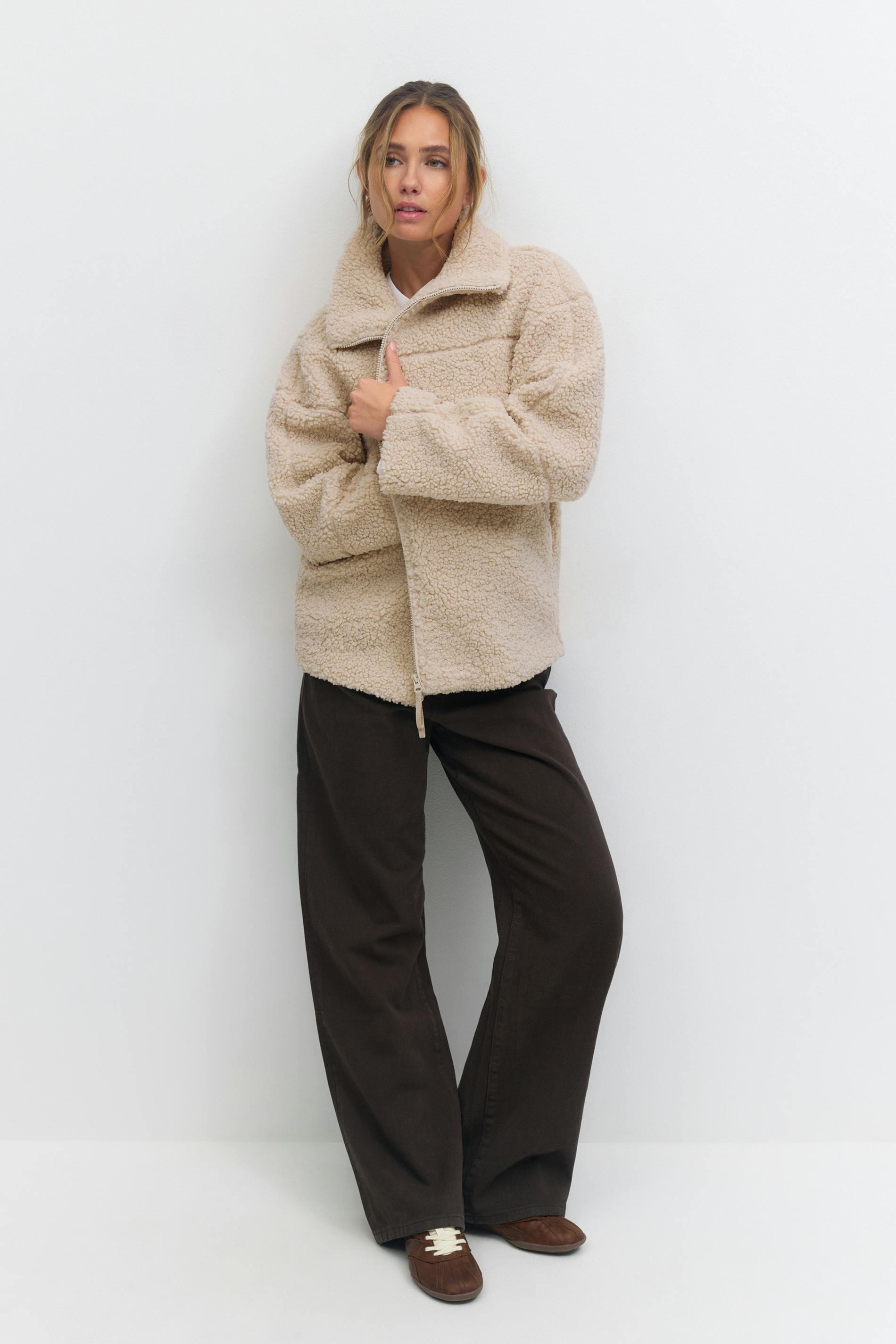 Teddyjacka med oversize fit. Teddyjackan är beige och har hög krage. Den har sidofickor, dragkedjestängning, fluffig kvalitet och dekorativa sömdetaljer upptill och på ärmarna.