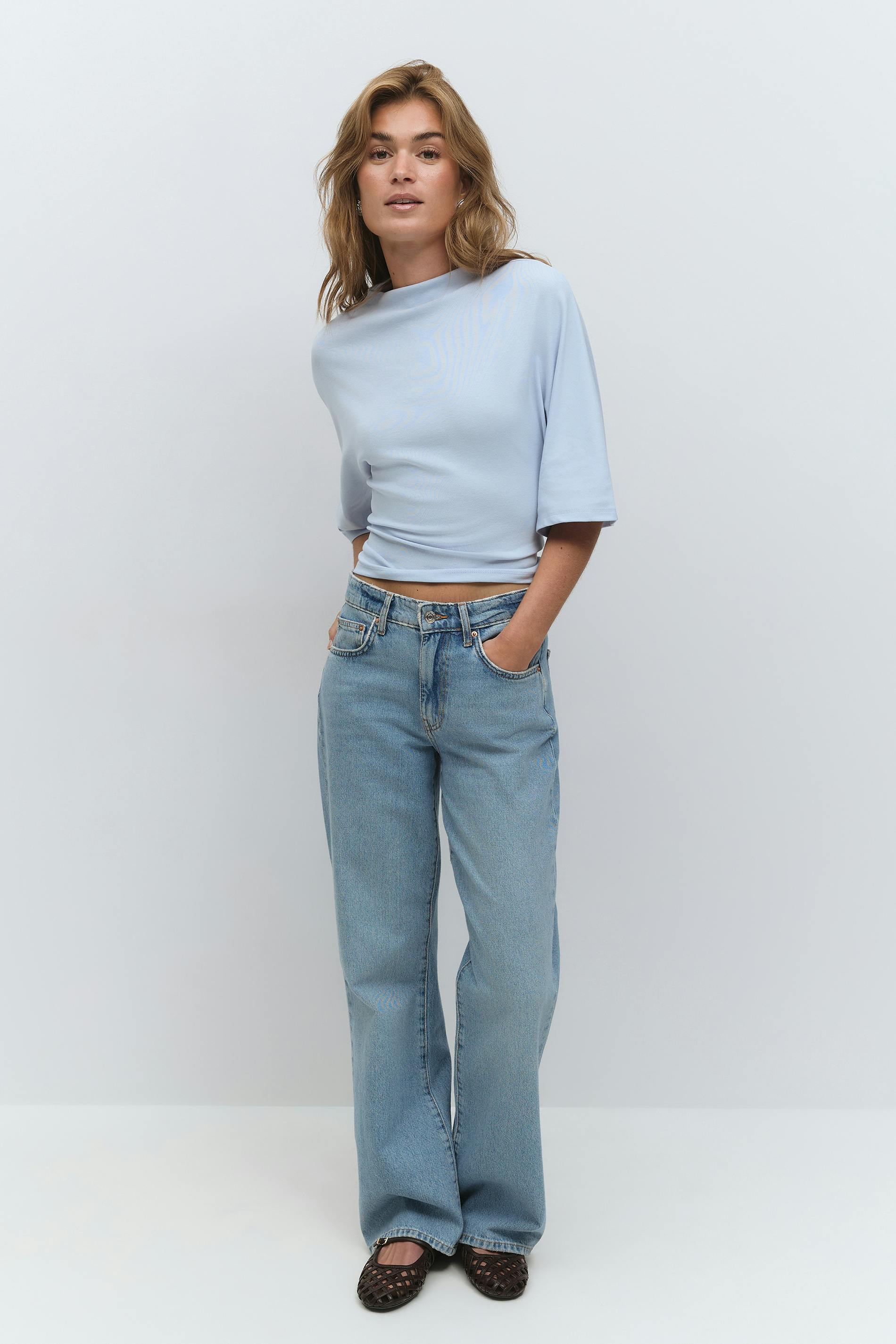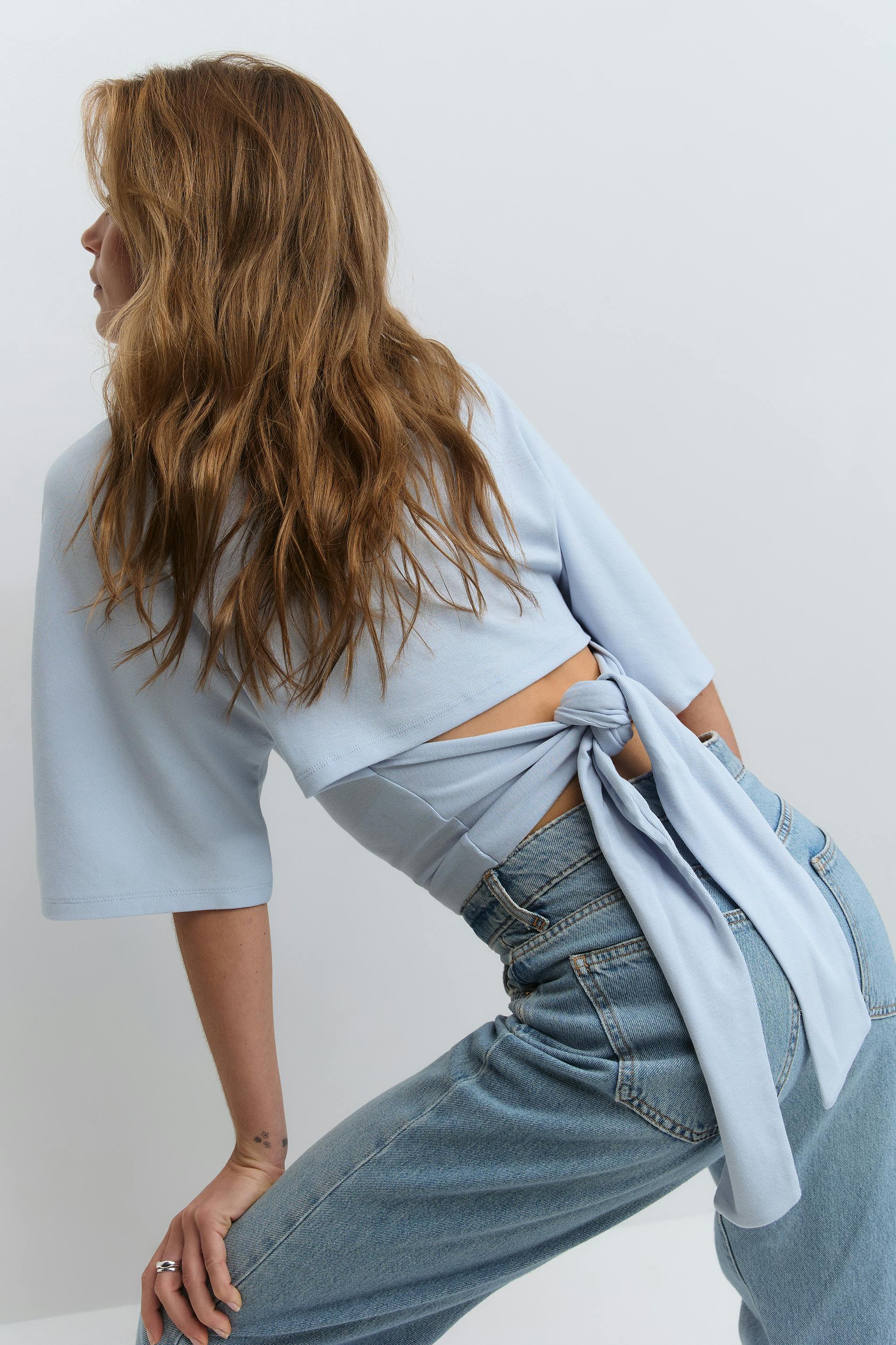 Cropped t-shirt with tie detail in the back. The t-shirt is blue and has short sleeve. It has high neckline and regular fit.